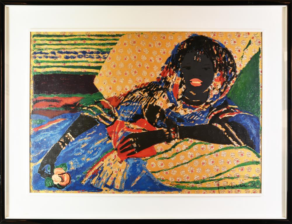 Salvatore Fiume SENZA TITOLO serigrafia polimaterica su broccato, cm 64x94;...