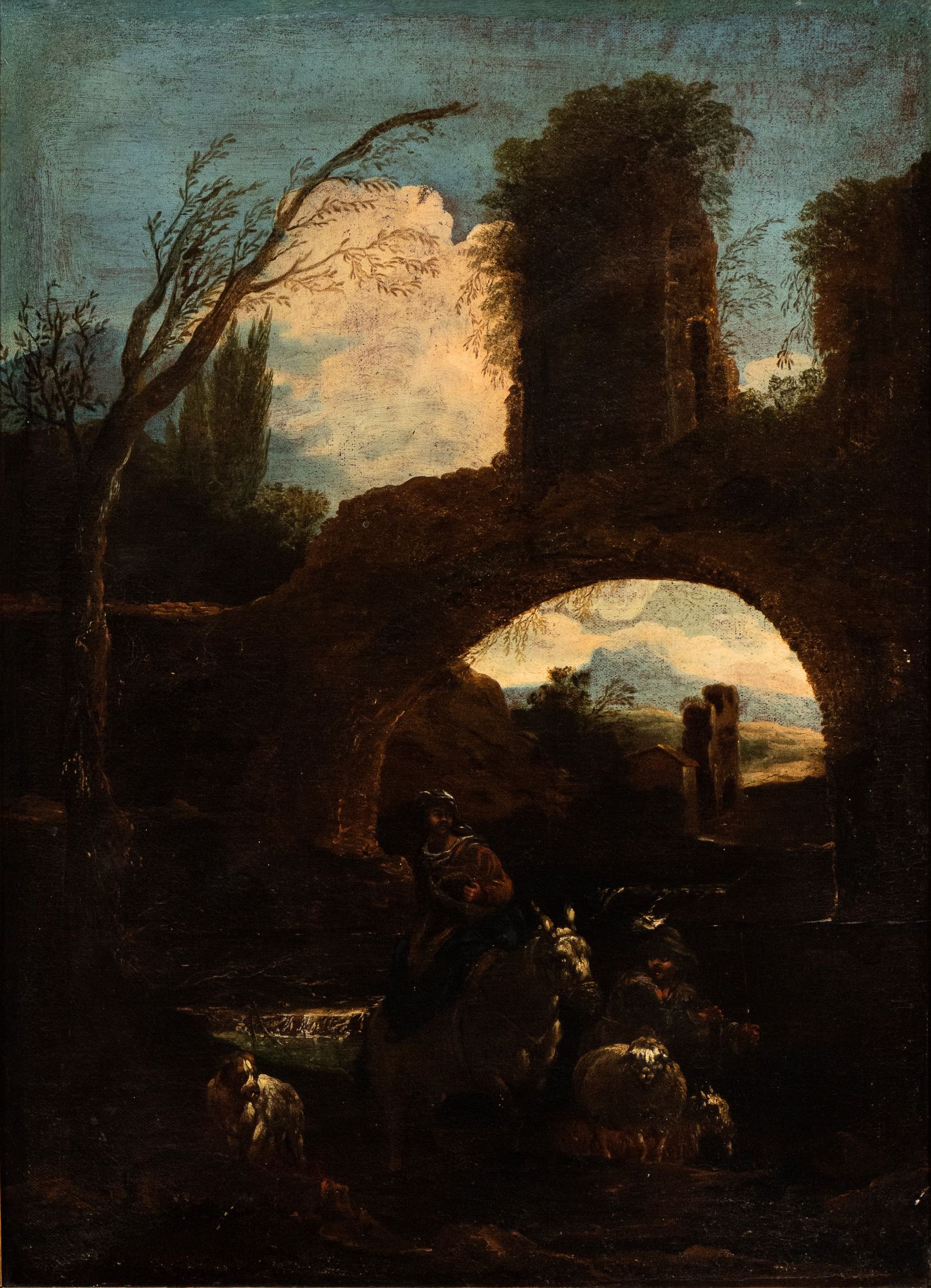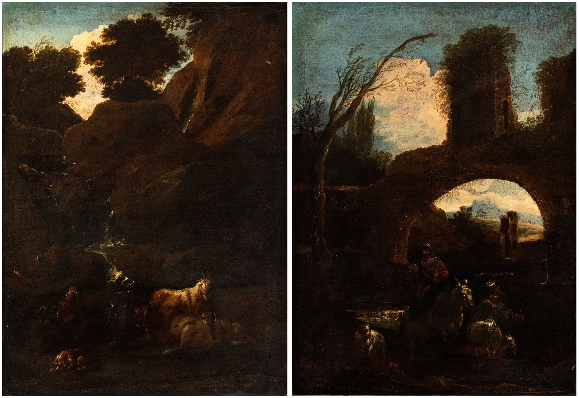 a) Paesaggio con arco in rovina, pastore e armenti; b) paesaggio con corso d'acqua, pastore e armenti. Coppia di dipinti