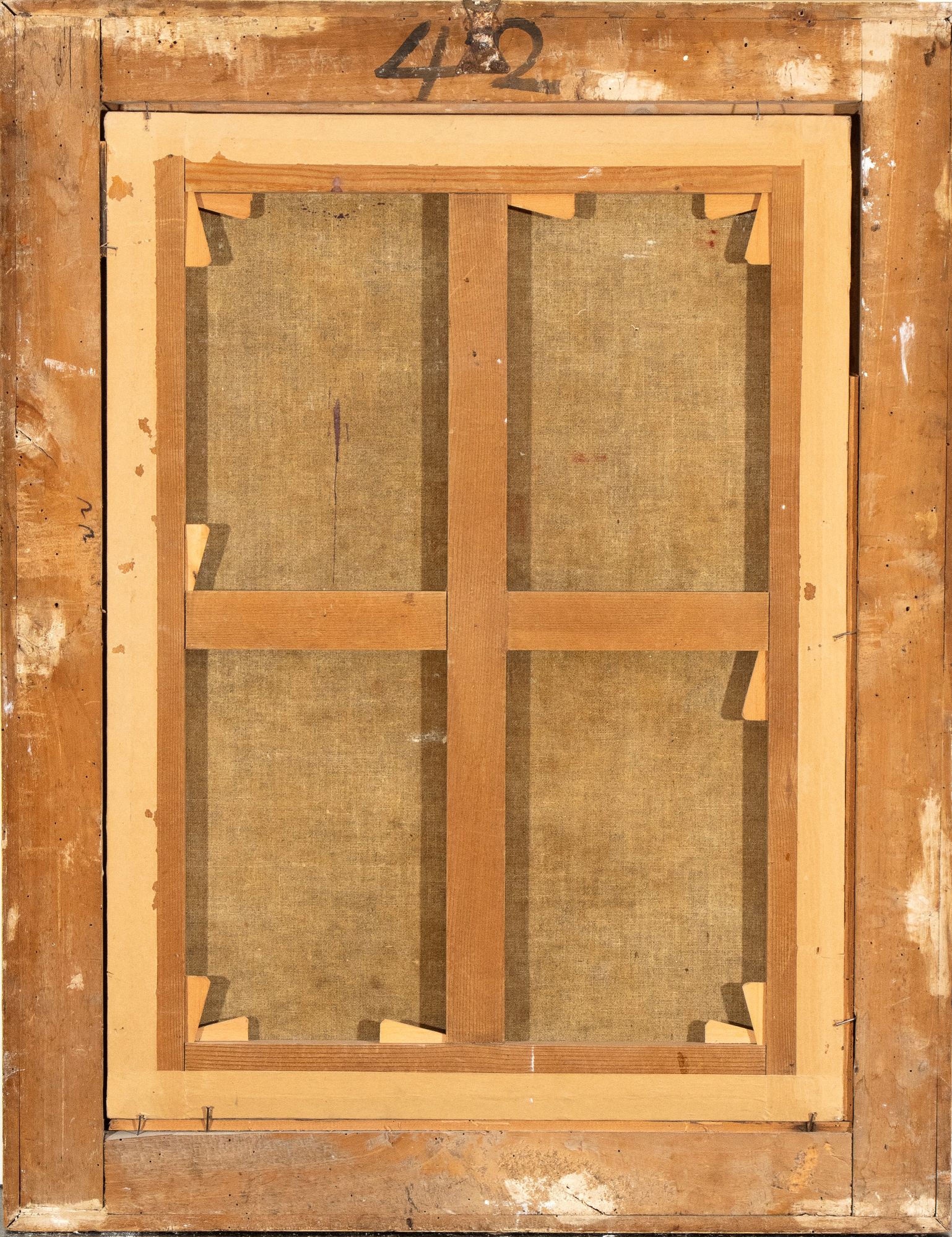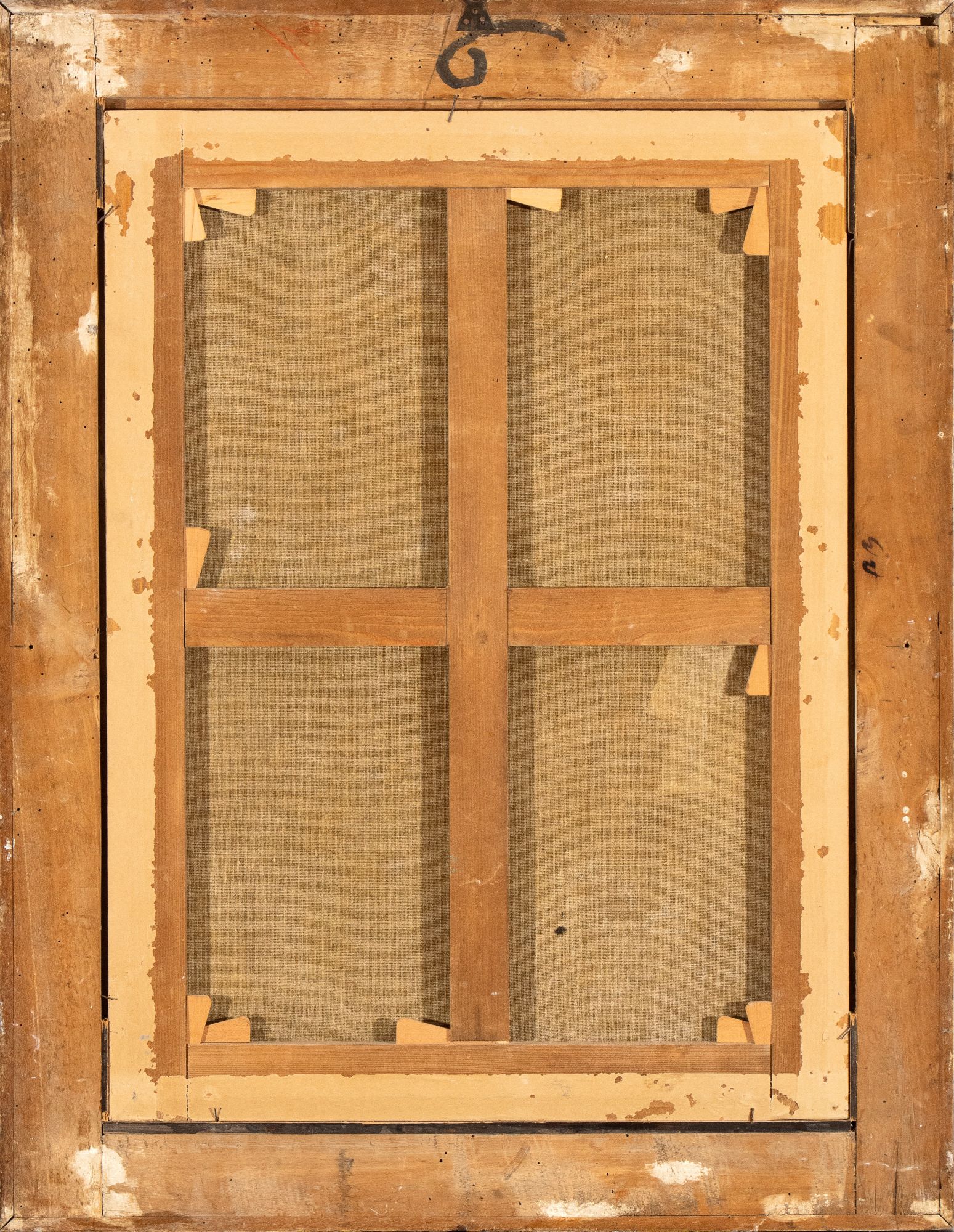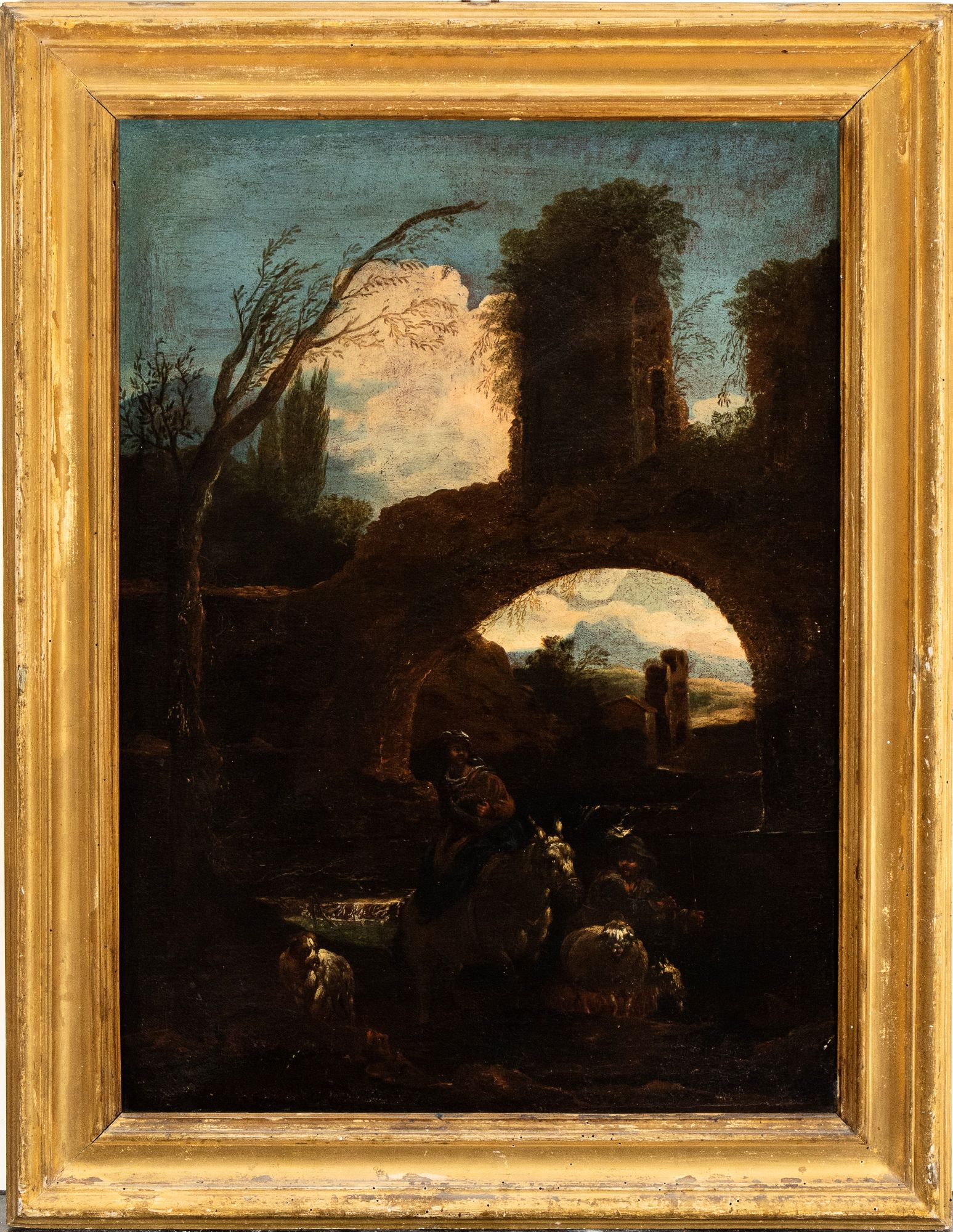a) Landscape with ruined arch, shepherd and herds; b) Landscape with watercourse, shepherd and herds. Pair of paintings Oil on canvas cm. 83x60 each. Framed