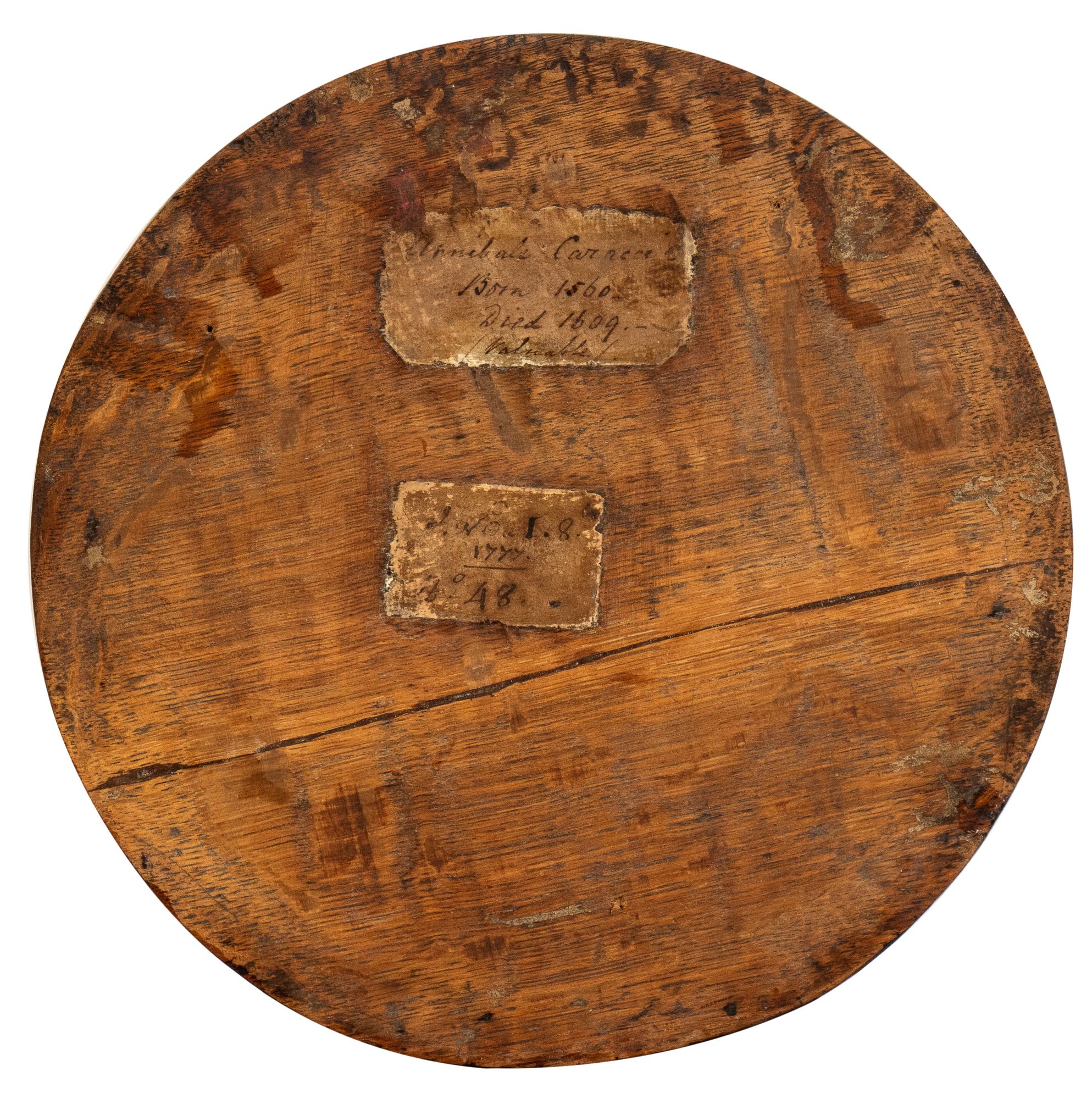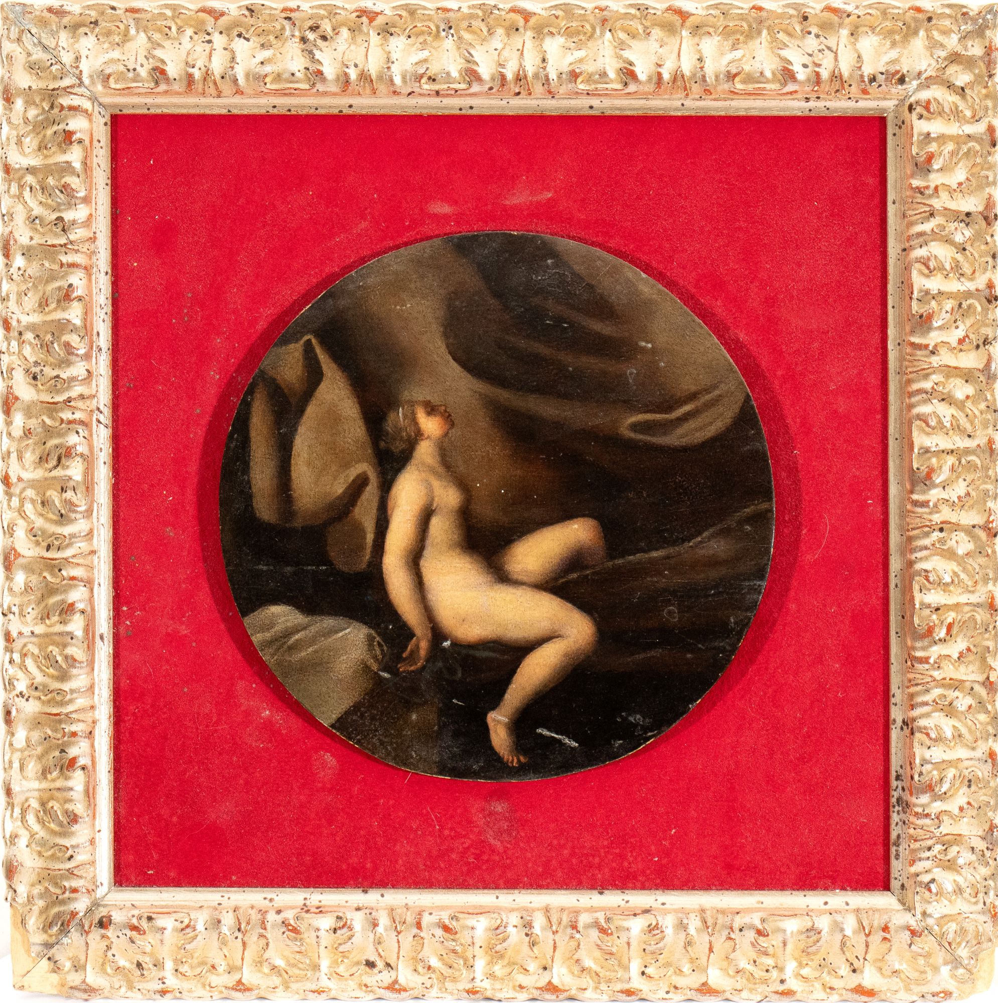 Venus lying down Oil on panel Ø cm. 24,5. Framed The painting bears two old inventory labels on the back, top: "ANNIBALE CARACCI / BORN 1560 / DIED 1609 (VALUABLE)"; bottom: "I.NO. L.8 / 1777 / N° 48".