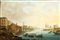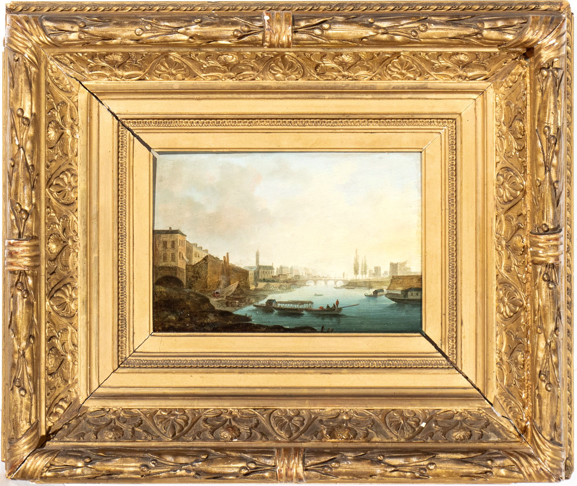 Town view with river, boats and bridge in the background oil on panel cm. 14x20,5. Framed