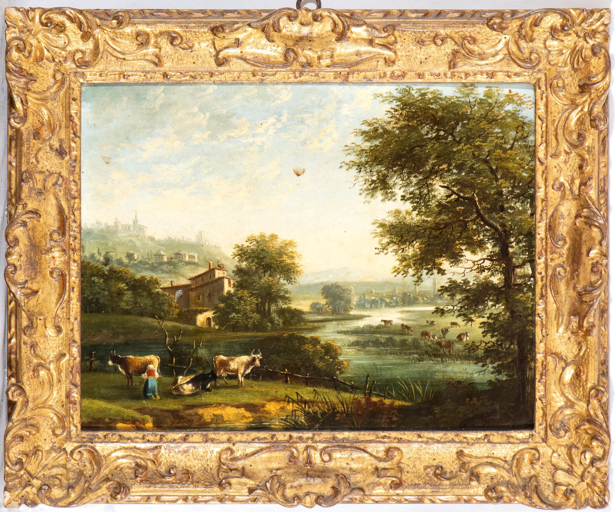 Landscape with river, citadel in the background, herds and figure Oil on panel cm. 24,5x31. Framed Private collection, Lazio.