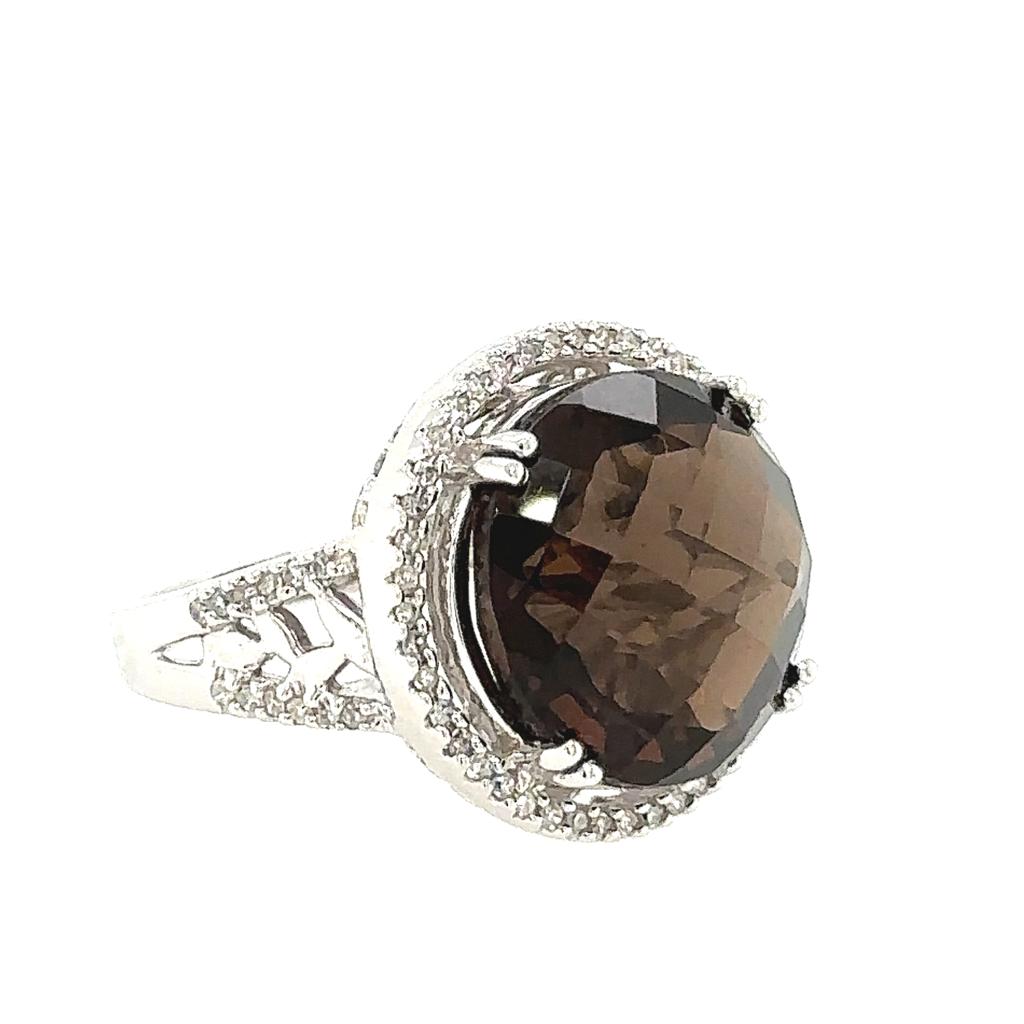 ANELLO IN ORO BIANCO 14K 7.90 GR CON SMOKY QUARTZ DA 12.30 CARATI + DIAMANTI PER 0.52 CARATI COLORE F- PUREZZA SI TAGLIA 7 - CERTIFICATO GEMMOLOGICO MAROZ DIAMONDS LTD MEMBRO ISRAEL DIAMOND EXCHANGE - RNG30513