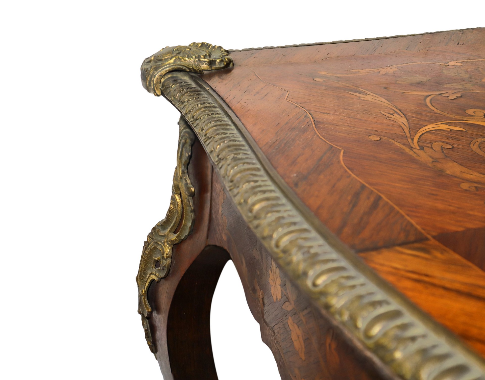 Cassetto centrale, quattro gambe, bronzi applicati alle cornici e alle gambe. Intarsi sul piano e nelle balze perimetrali.