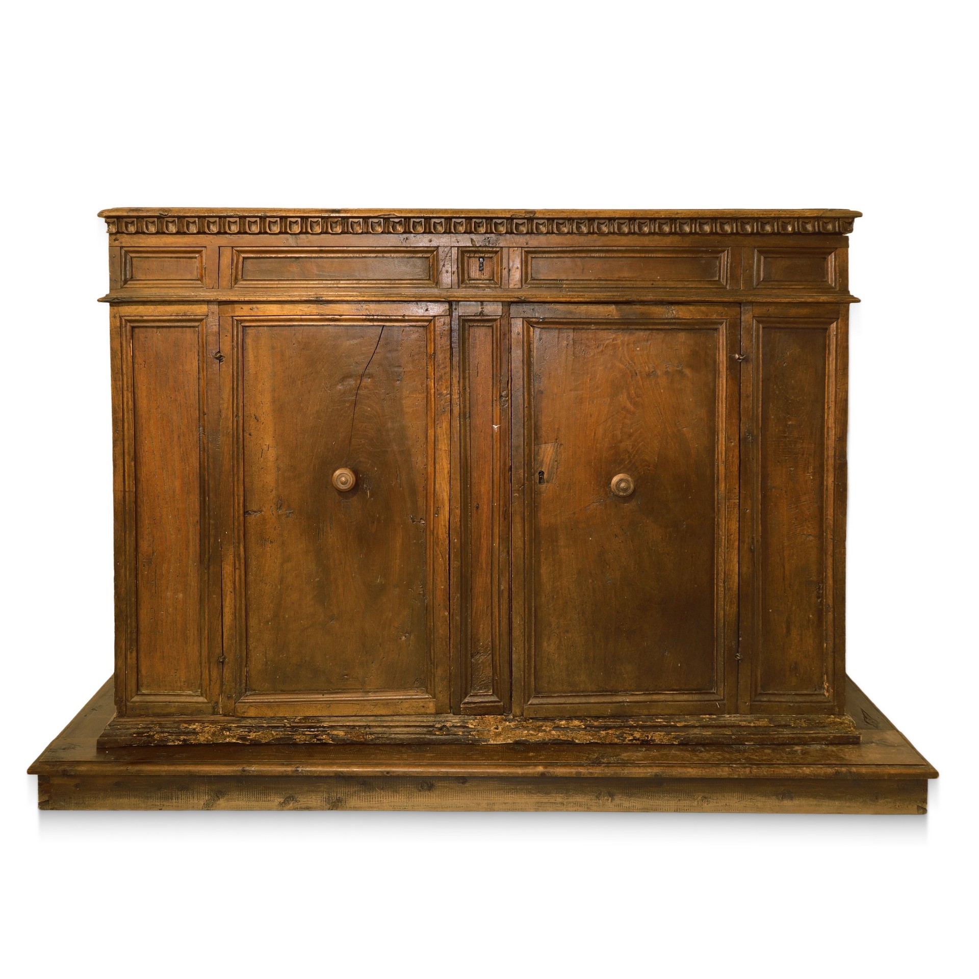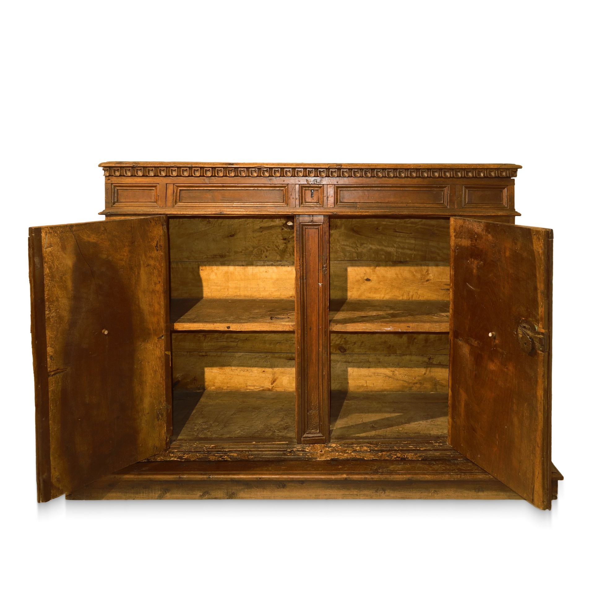 Grande credenza bassa in legno di noce, piano a becco di civetta sottolineato da dentellatura intagliata, due ante con gangheri cornice alla base, fine 18° secolo