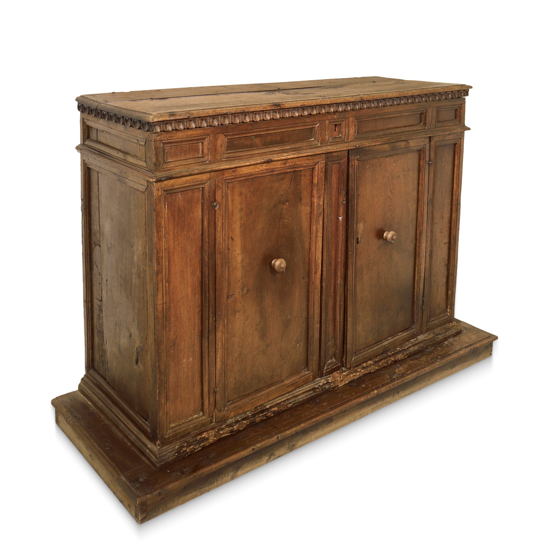 Grande credenza bassa in legno di noce, piano a becco di civetta sottolineato da dentellatura intagliata, due ante con gangheri cornice alla base, fine 18° secolo h cm 112X167X60 Da restaurare Da restaurare