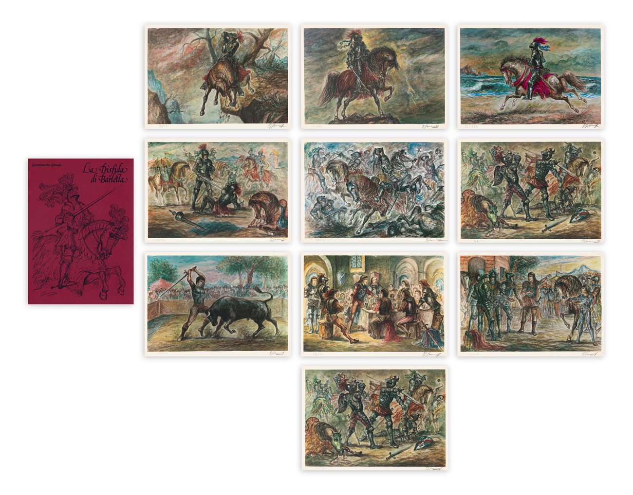 Cartella contenente 10 litografie di Giovan Francesco Gonzaga, ciascuna recante firma e numerazione (Esemplari 32/120) a matita al fronte
