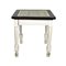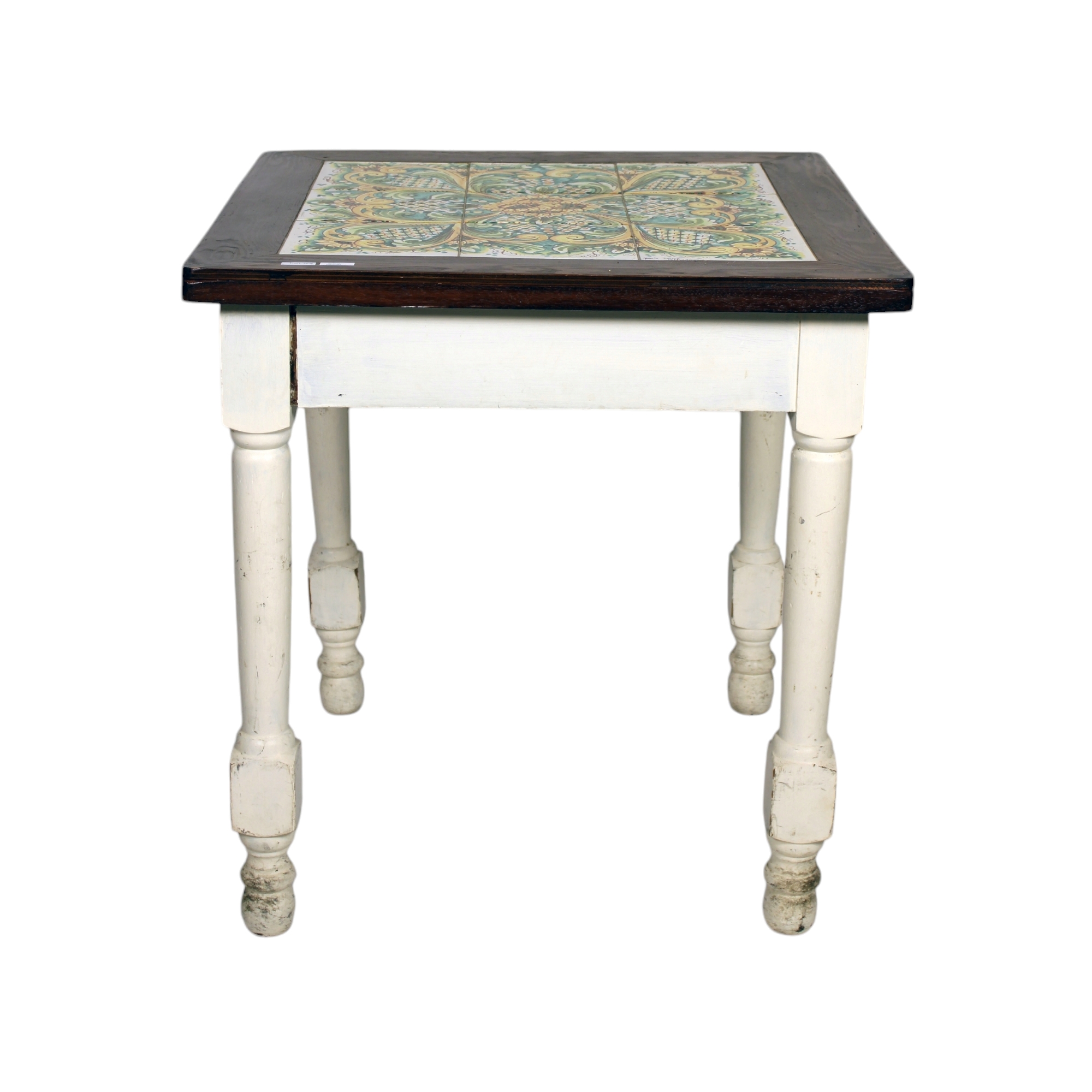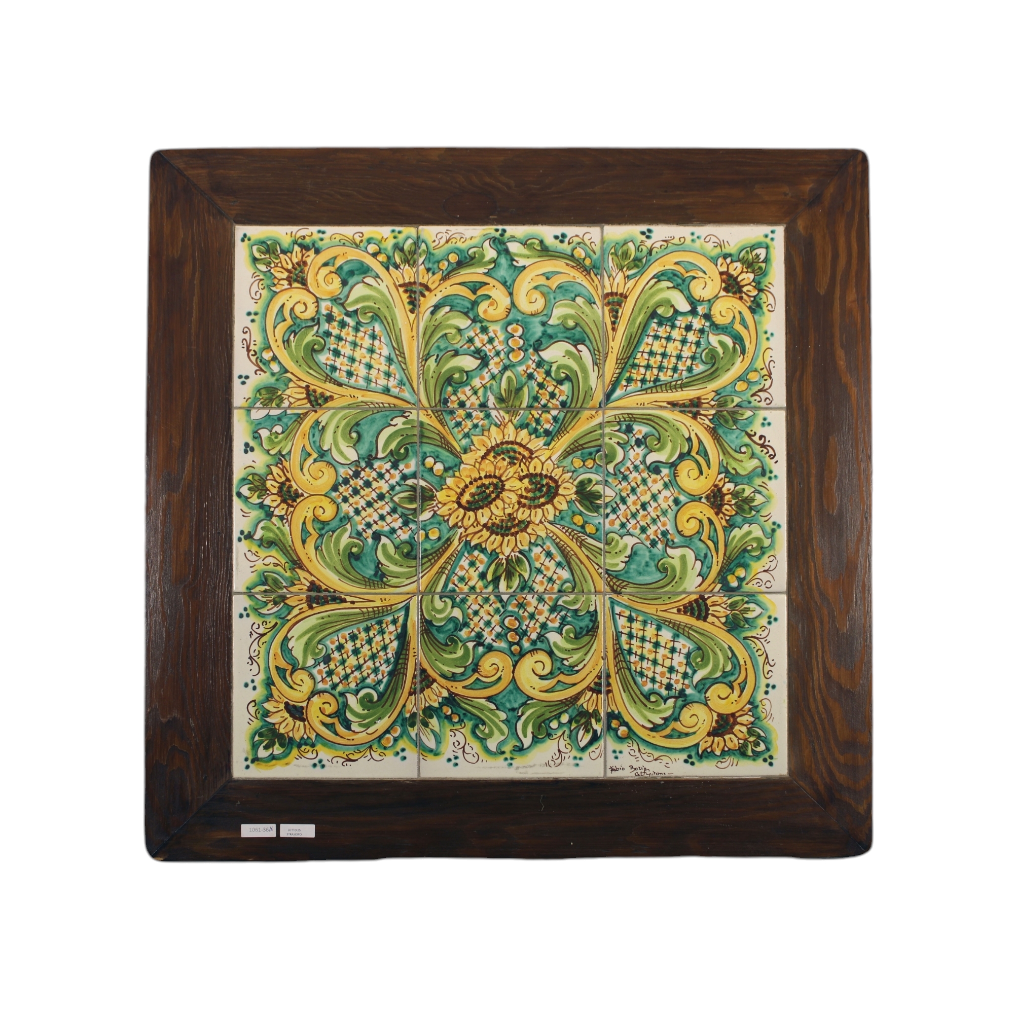 TAVOLO in legno di castagno di forma quadrata con base laccata e piano composto da 9 mattonelle in ceramica dipinta in policromia raffigurante girasoli , manifattura Fabio Boria Caltagirone XX secolo Caltagirone XX secolo