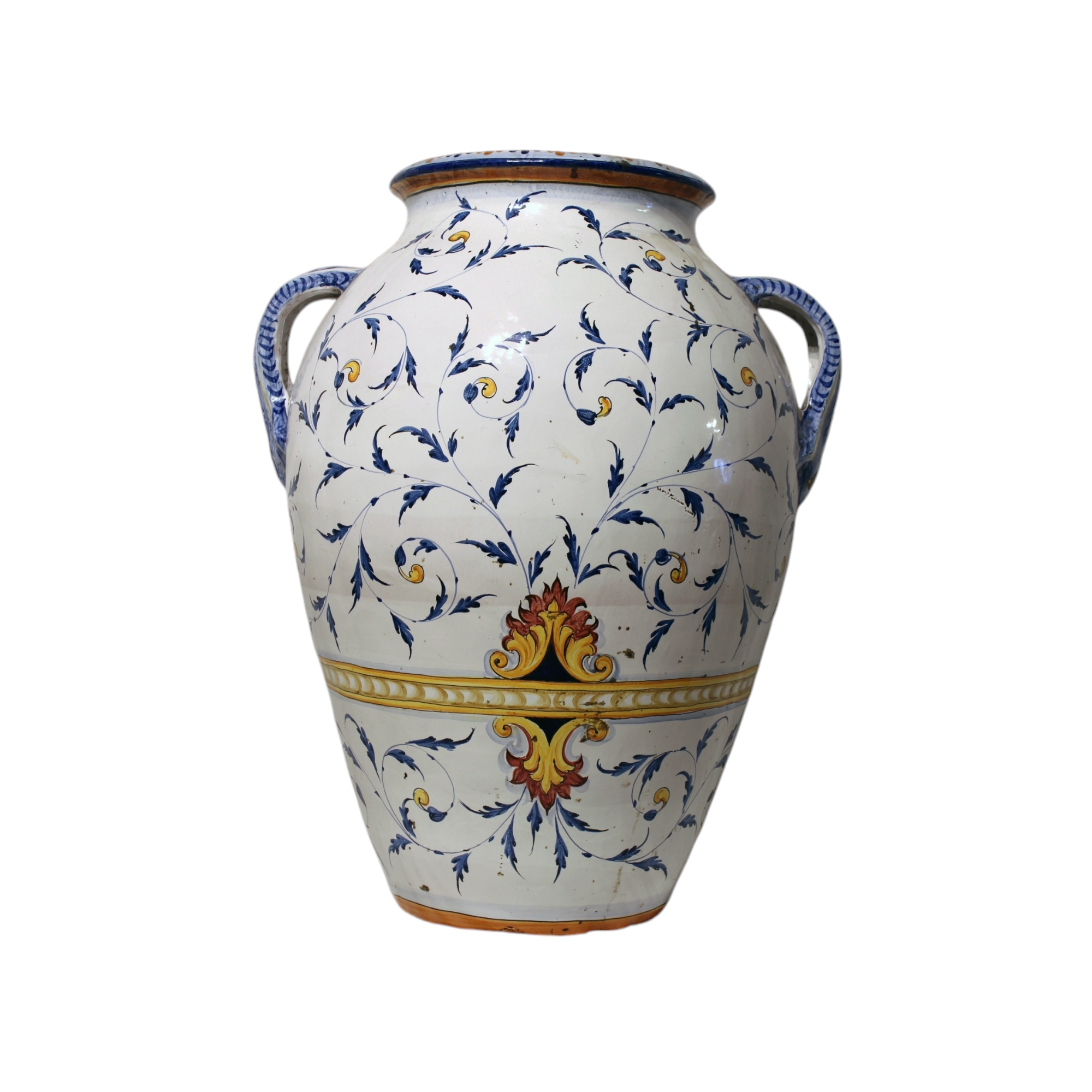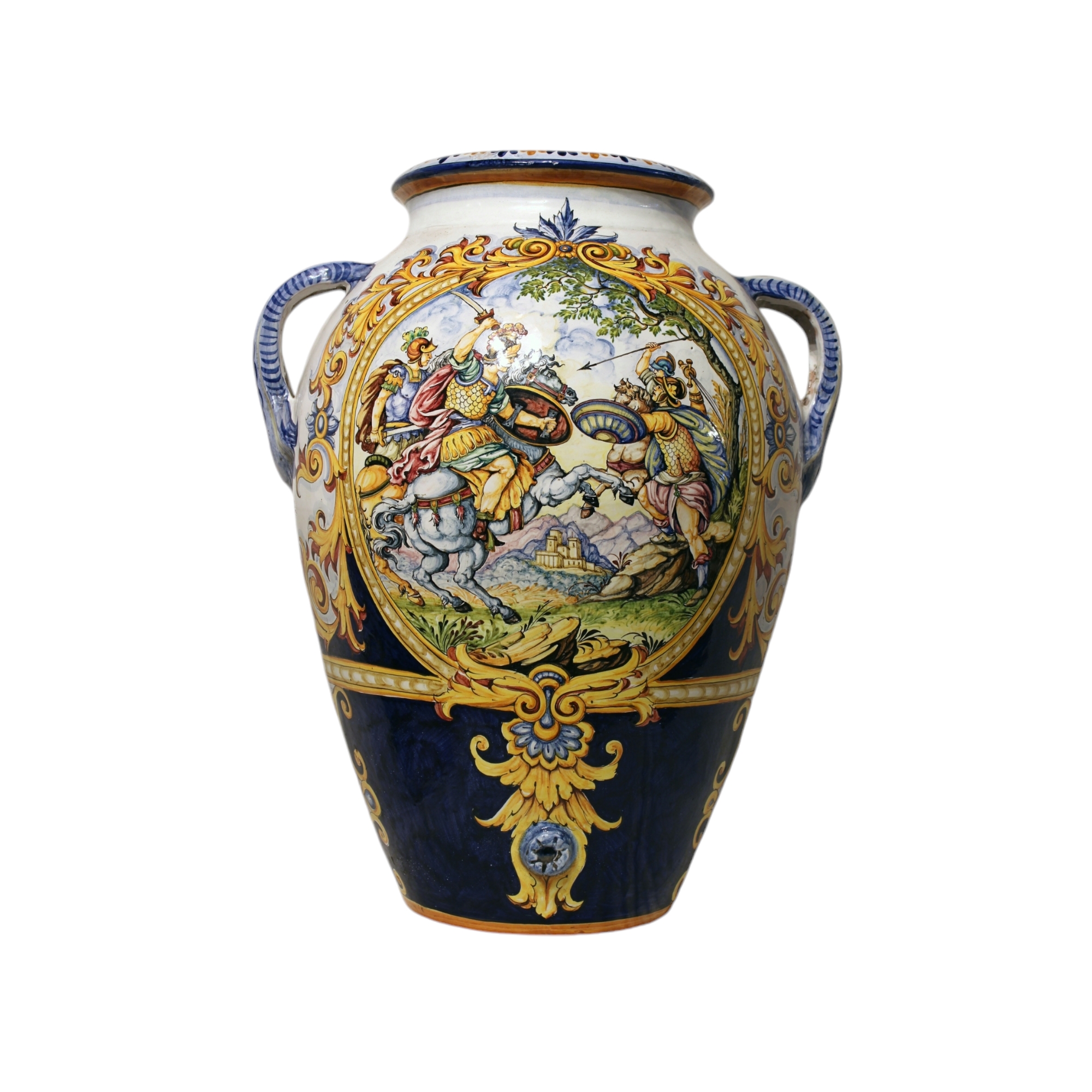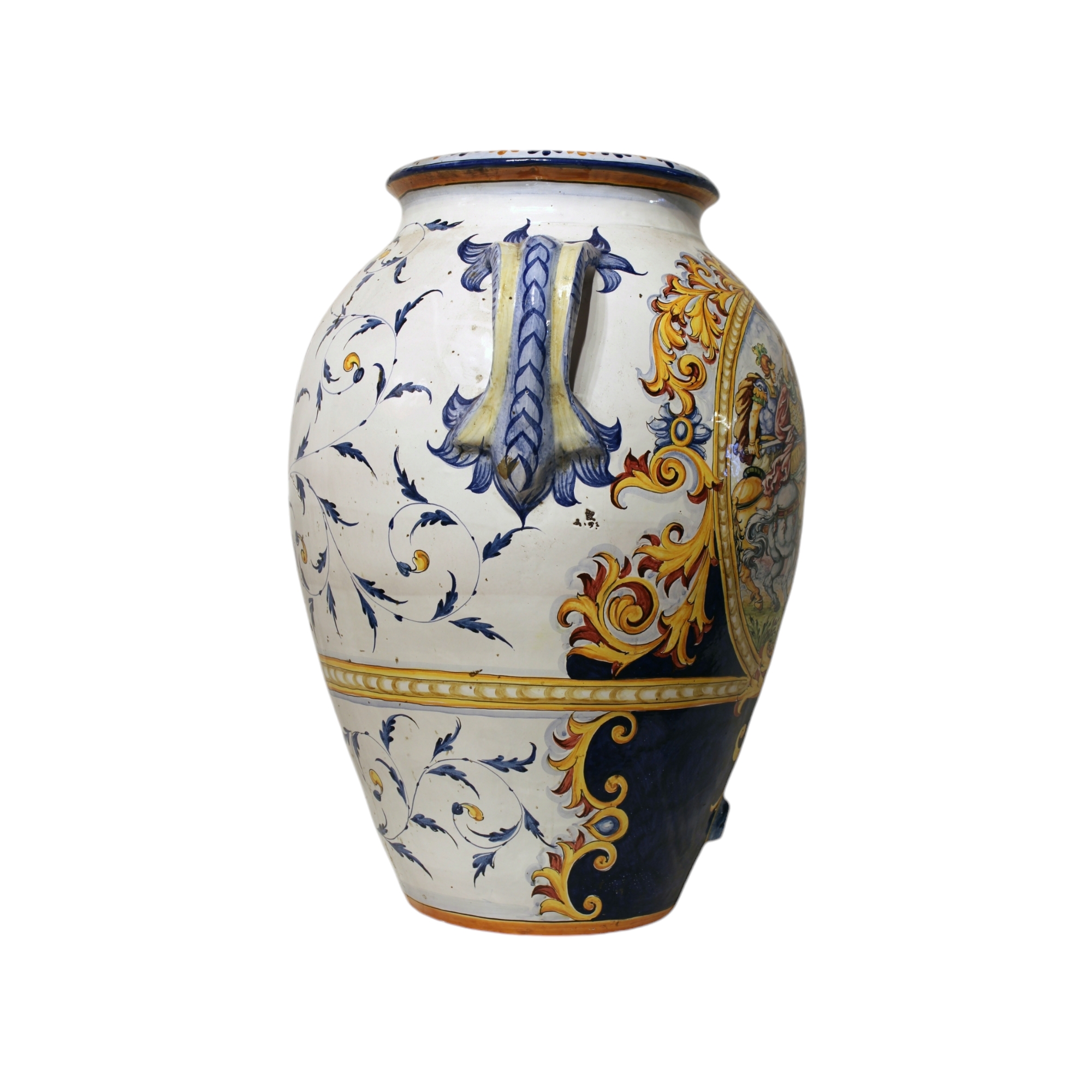 GRANDE ORCIO CON MANICI in maiolica istoriato e dipinto n policromia raffigurante scena di battaglia manifattura Medo Scappini Monte Lupo XX secolo XX secolo h cm 82 x 67
