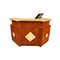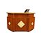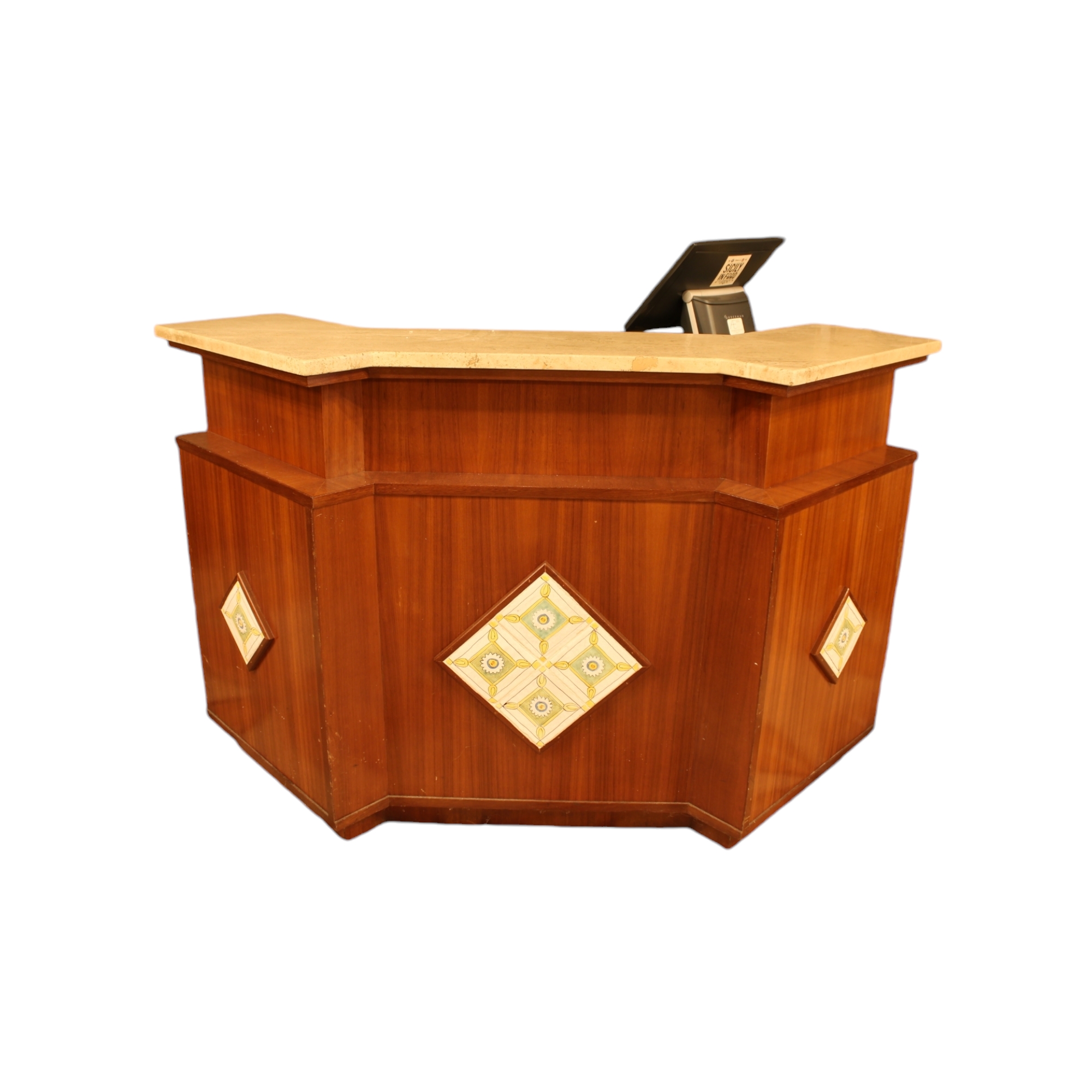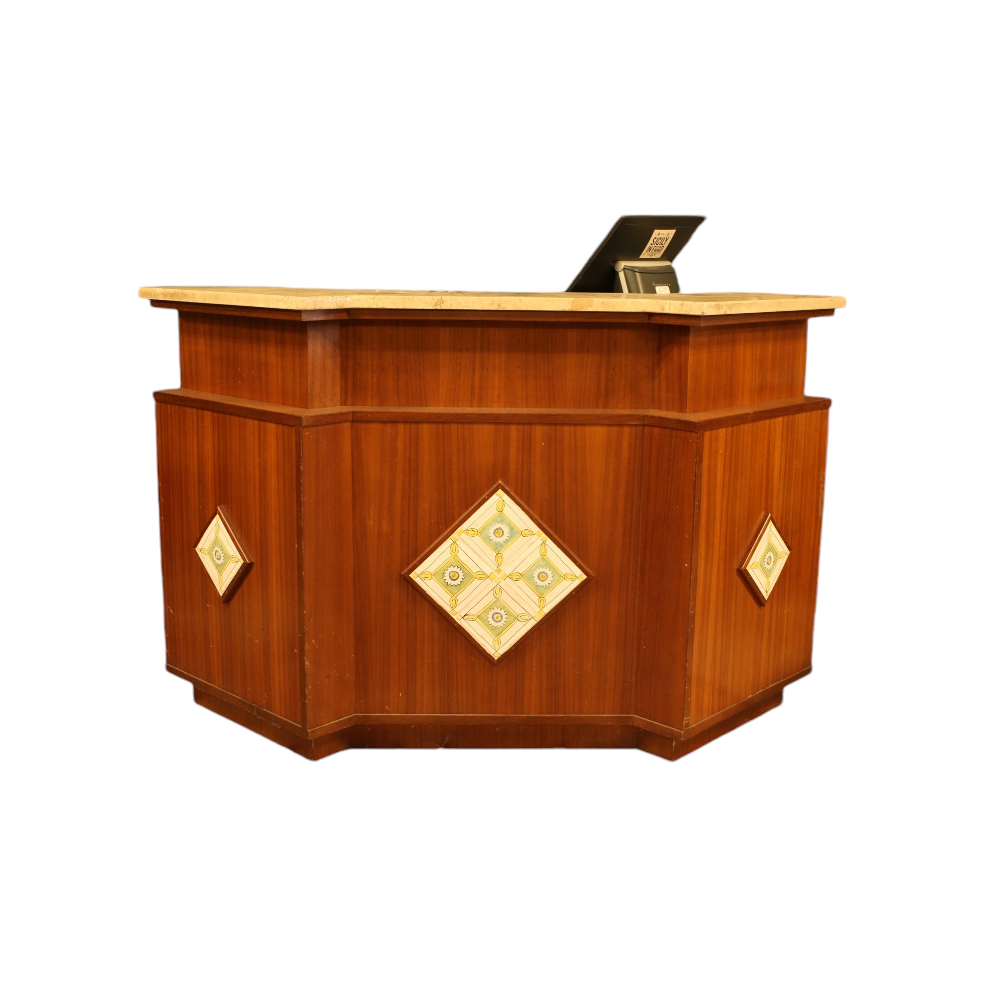 BANCONE in legno di mogano con piani in granito arricchito con mattonelle in maiolica policroma maestranze italiane anni 80 maestranze italiane anni 80