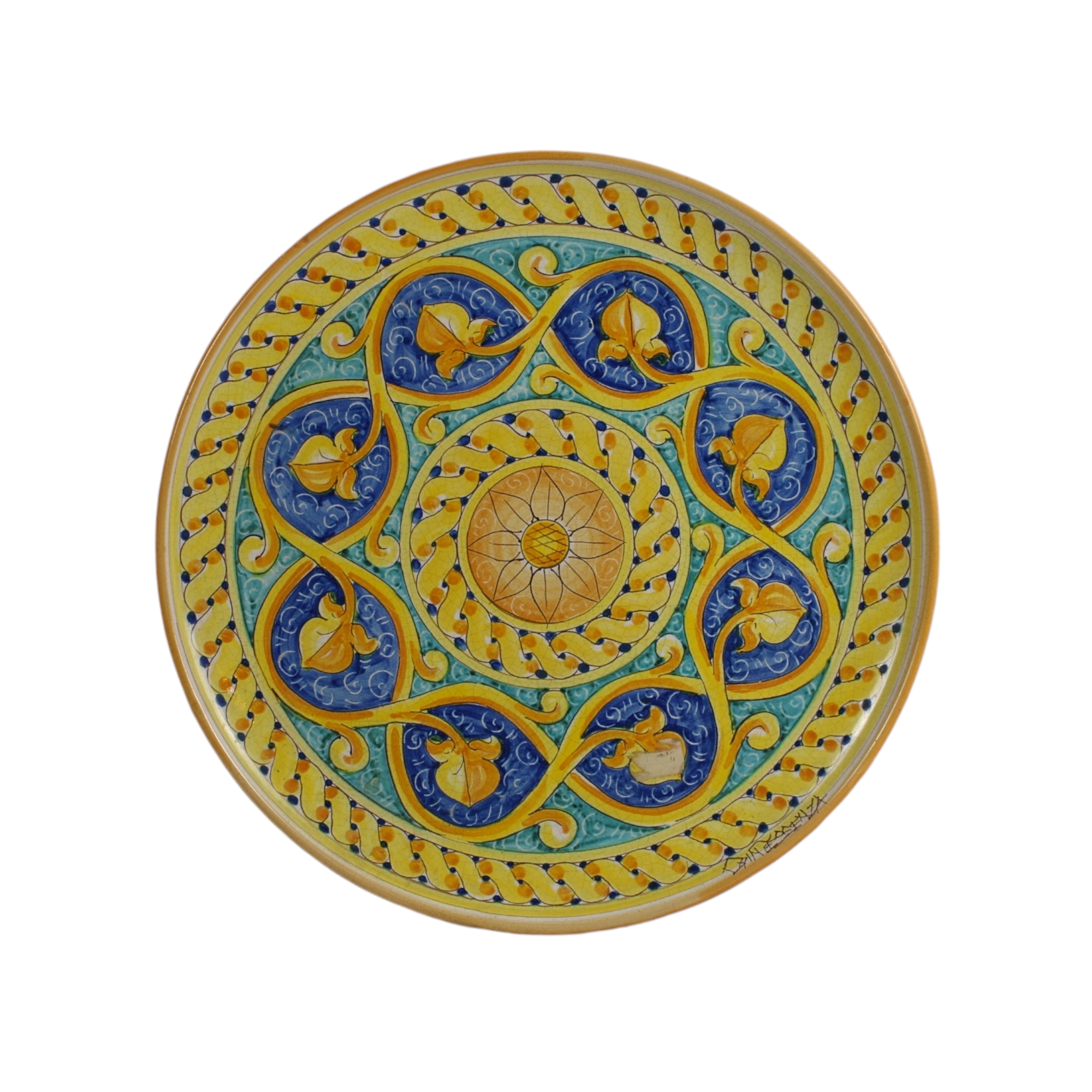 LOTTO COMPOSTO DA un piatto in maiolica dipinta manifattura Quinta Essenza e un piatto in rame, maestrazne siciliane XX secolo maestrazne siciliane XX secolo cm Ø 43 / cm Ø 30