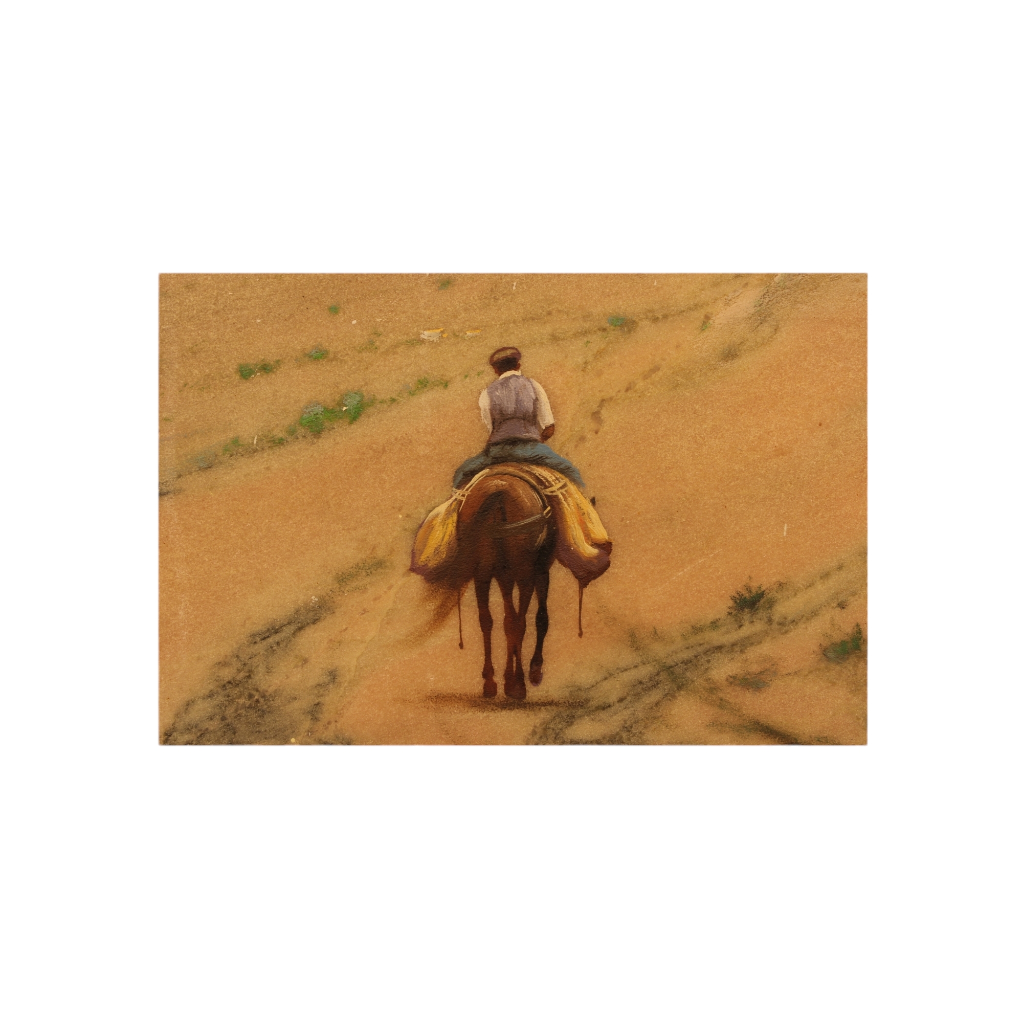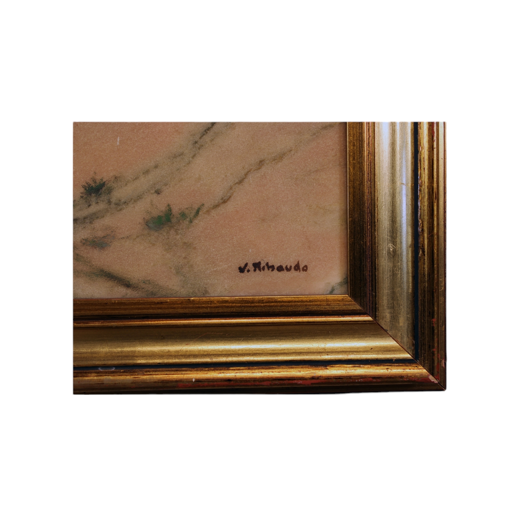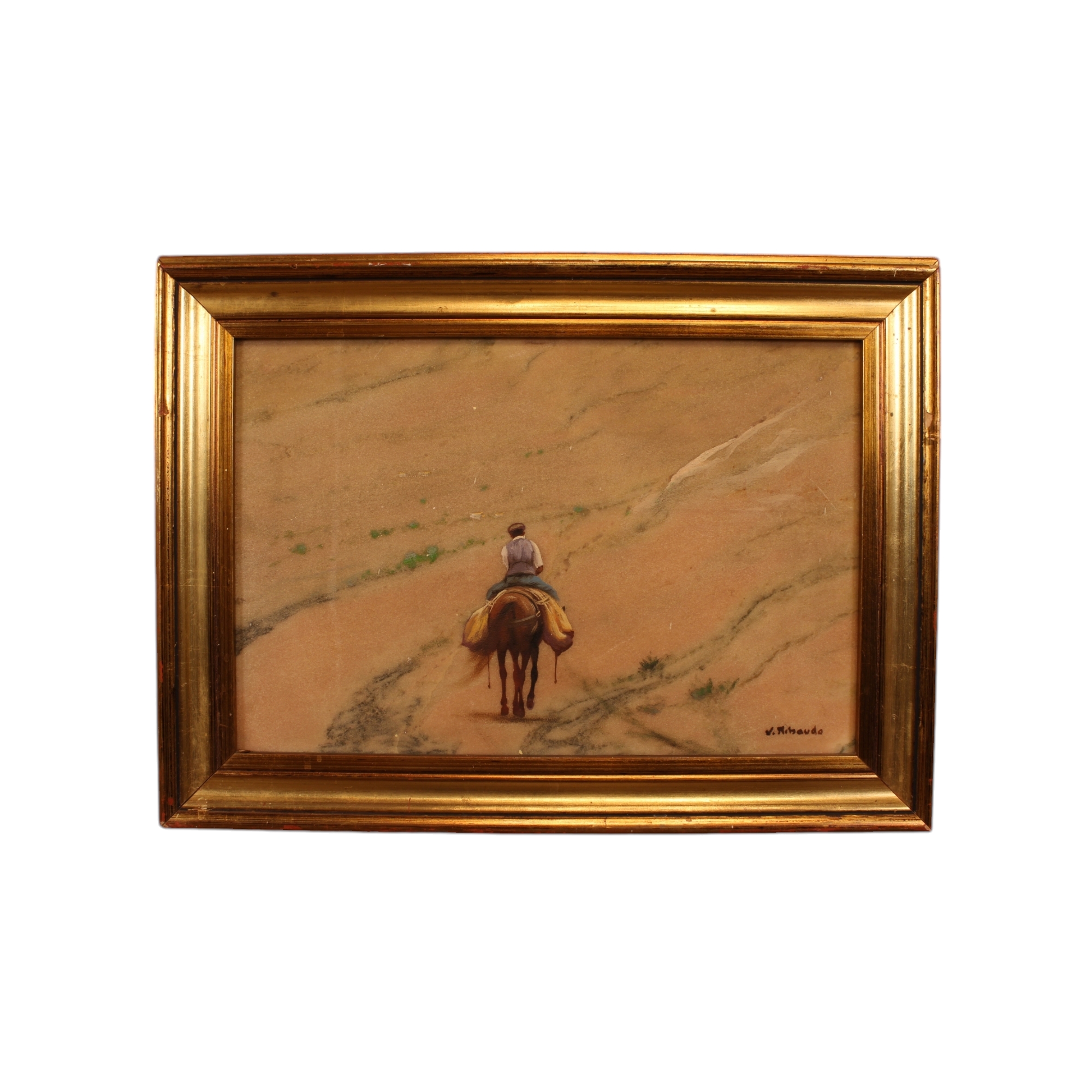 V. RIBAUDO OLIO SU MARMO raffigurante contadino in tragitto su cavallo su strada di campagna dentro cornice in legno laccata oro h cm 27 x 41 / cornice h cm 39 x 52,5