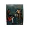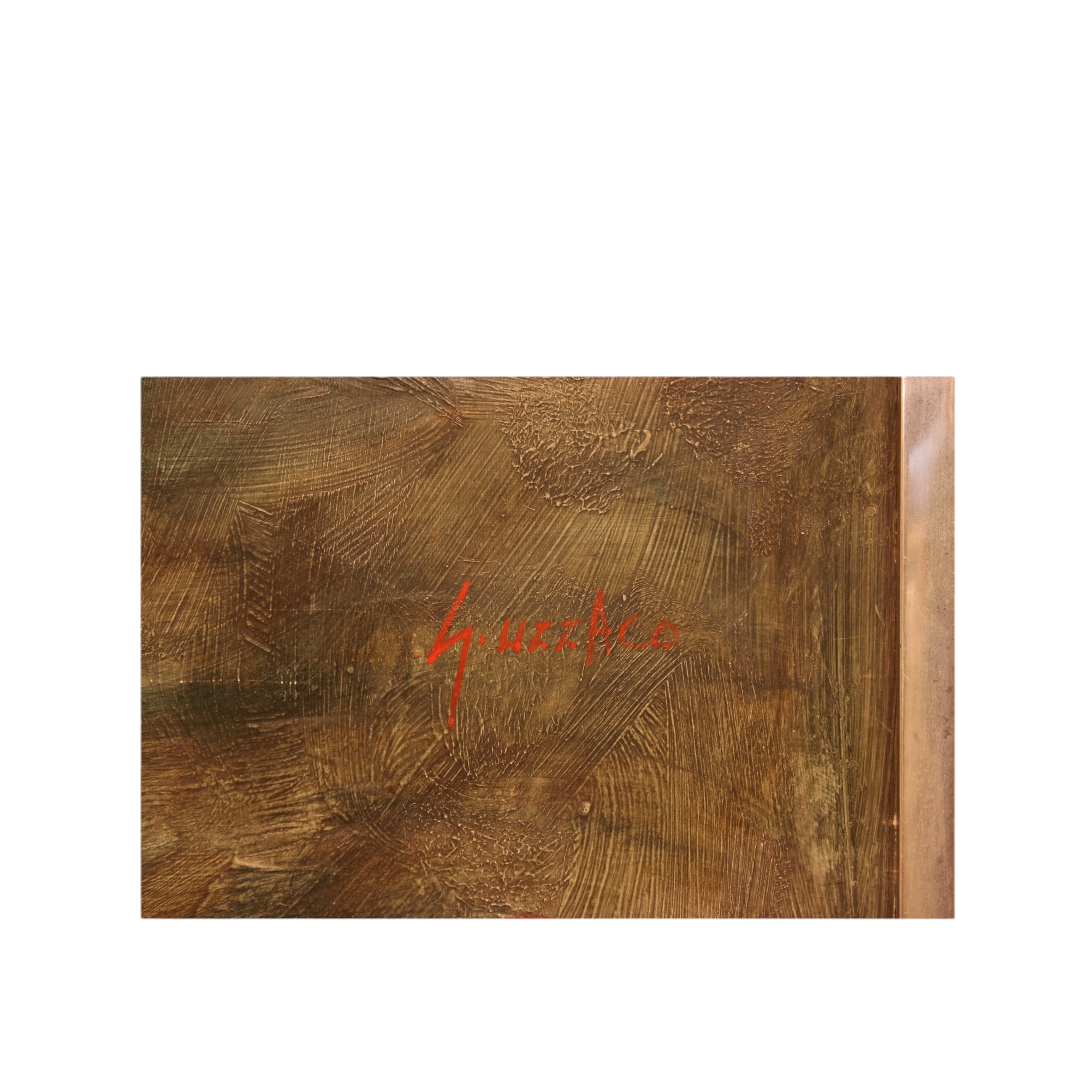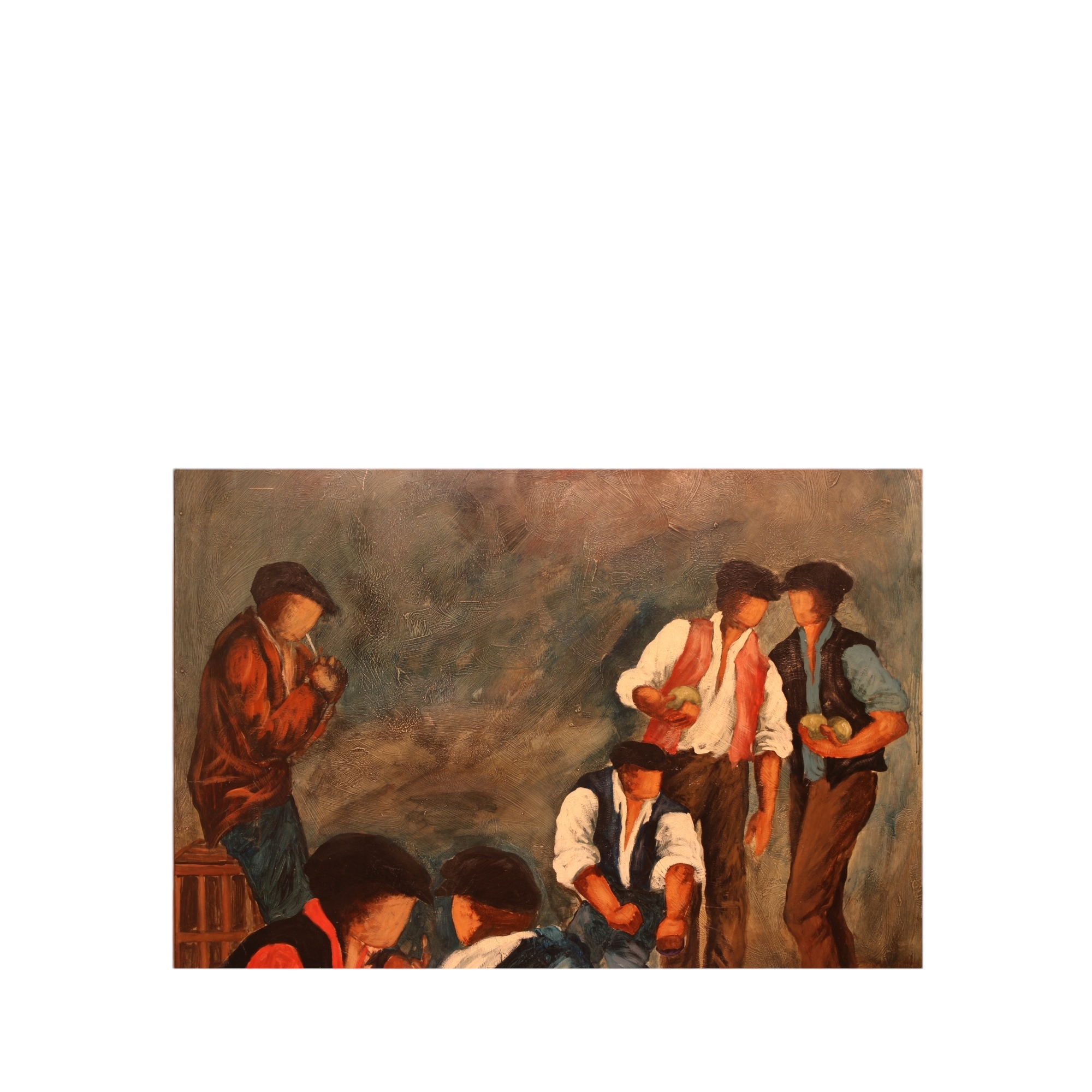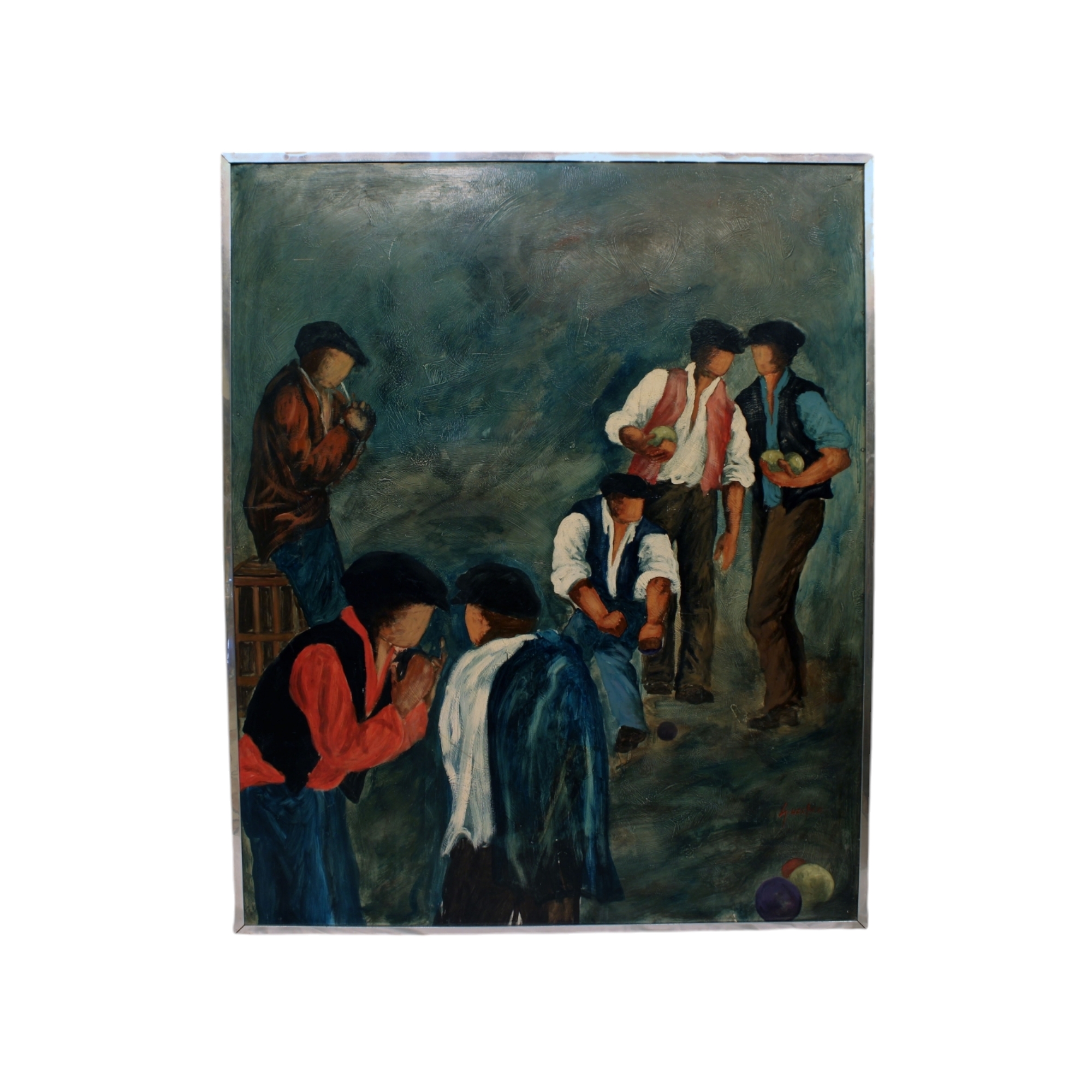 G. UZZACO OLIO SU TAVOLA raffigurante scena di gioco di contadini dentro cornice in metallo argentato h cm 147 x 122 / cornice h cm 150 x 125