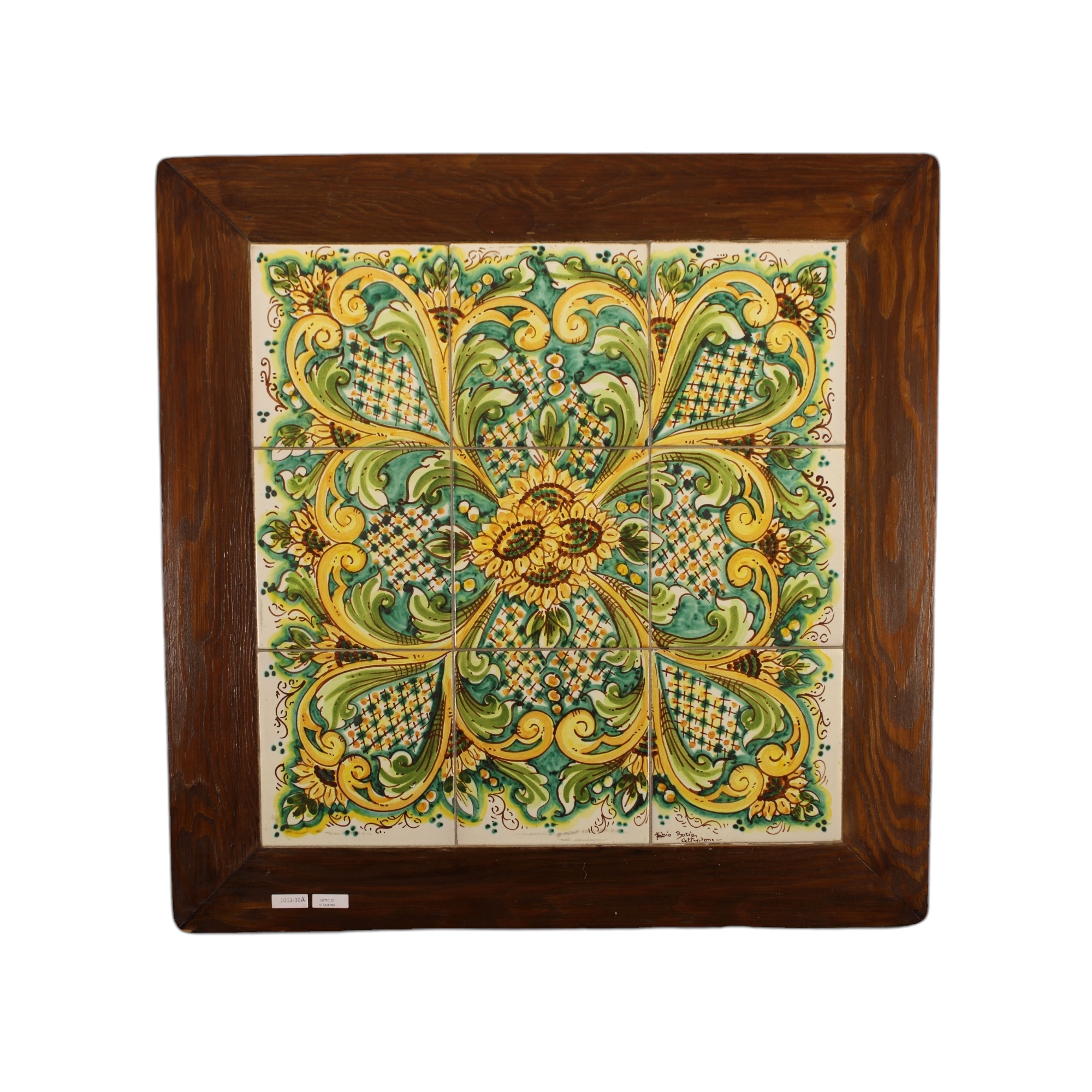 TAVOLO in legno di castagno di forma quadrata con base laccata e piano composto da 9 mattonelle in ceramica dipinta in policromia raffigurante girasoli , manifattura Fabio Boria Caltagirone XX secolo Caltagirone XX secolo