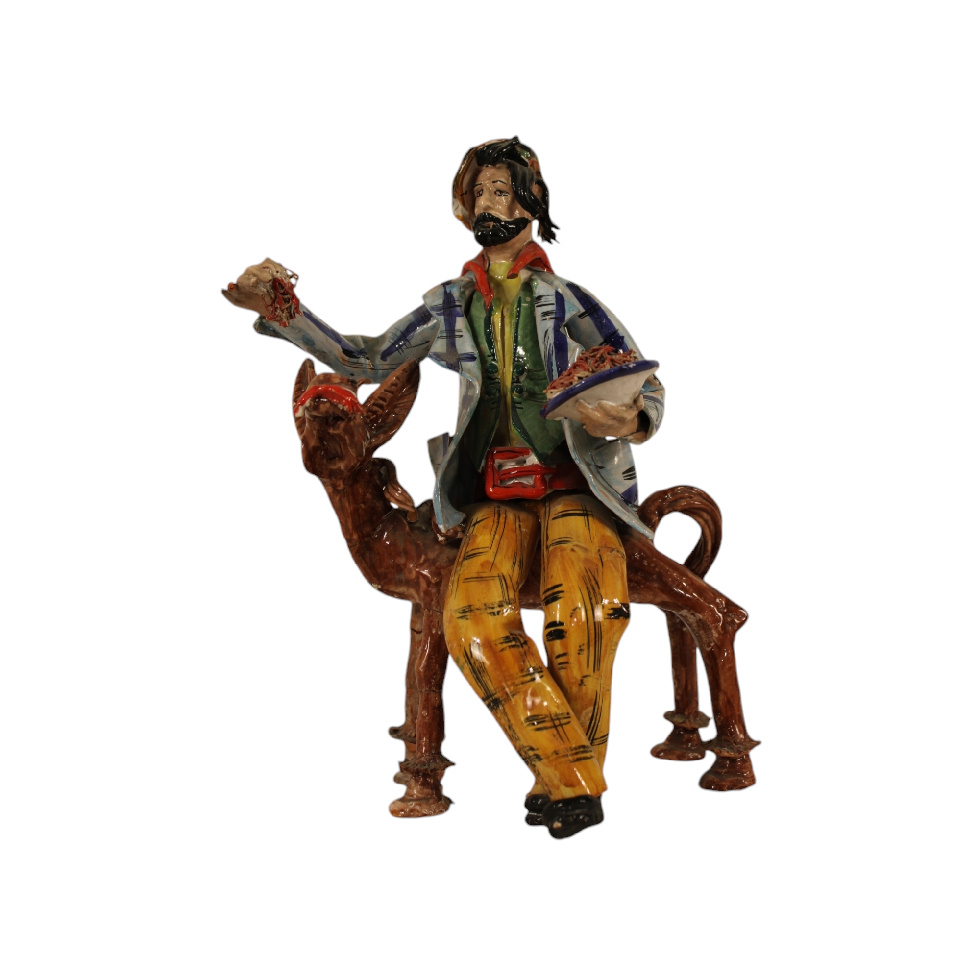 GRUPPO SCULTOREO in maiolica policroma raffigurante personaggio con asinello maestranze siciliane, piccole sbeccature e mancanze XX secolo XX secolo h cm 33 x 23 x 16