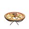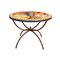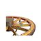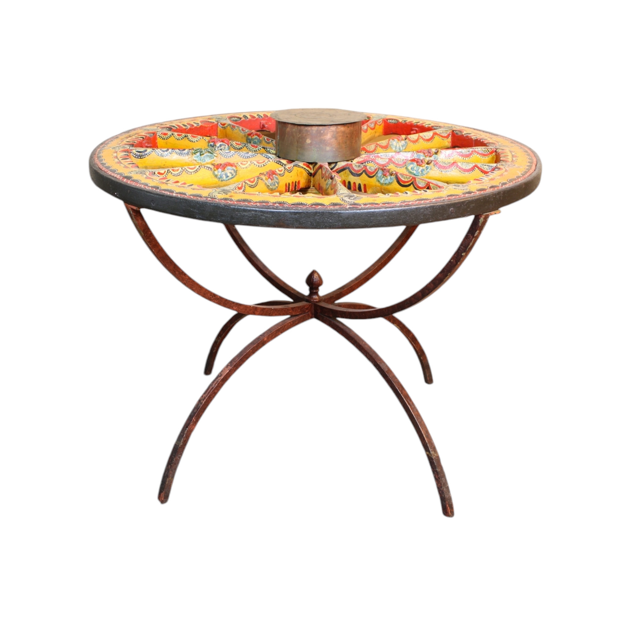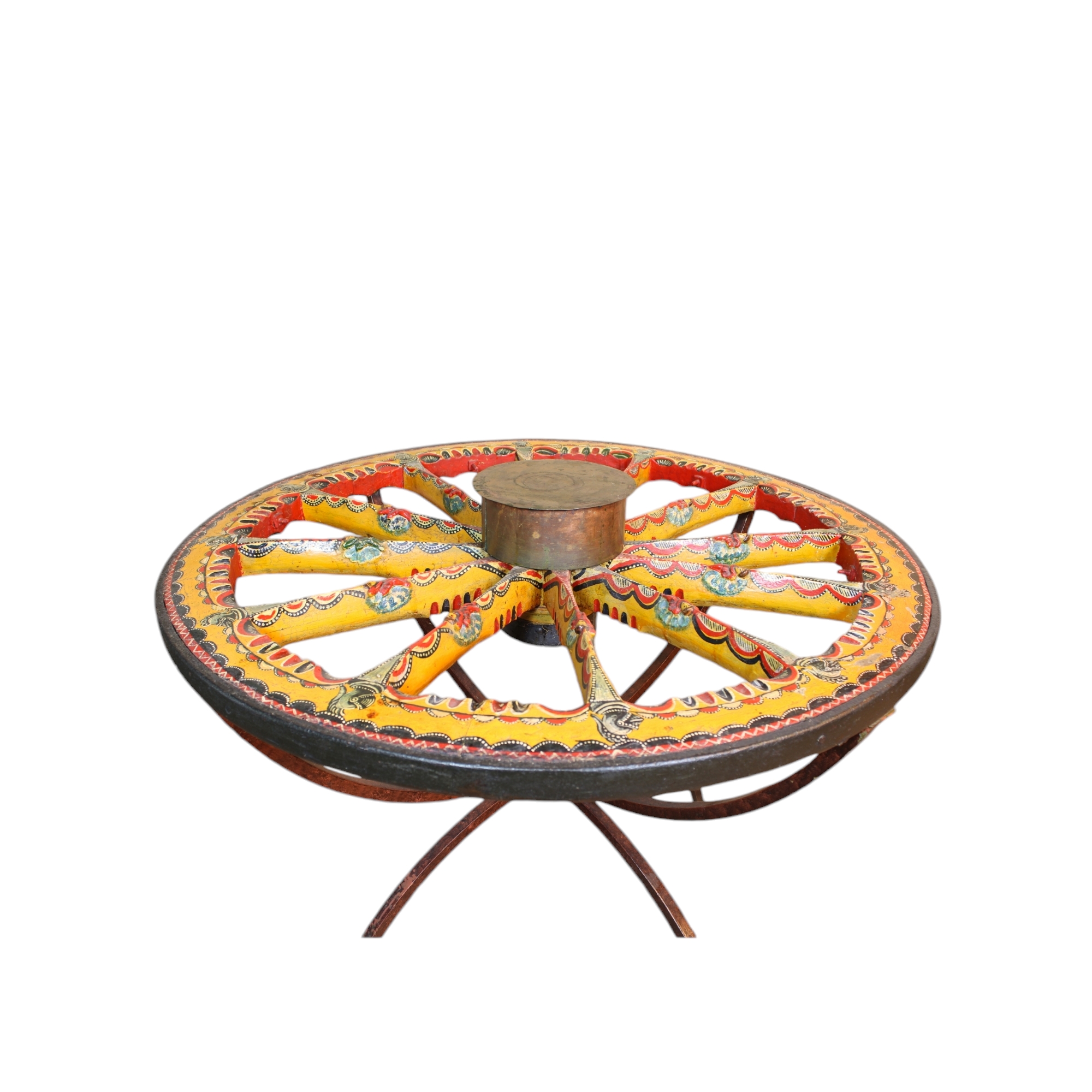 TAVOLO D'APPOGGIO realizzato da antica ruota di carretto siciliano interamente dipinta in policromia con base in ferro non coeva piano in vetro e coprimozzo in rame maestranze siciliane XIX/XX secolo maestranze siciliane XIX/XX secolo h cm 89, 5 x Ø 121