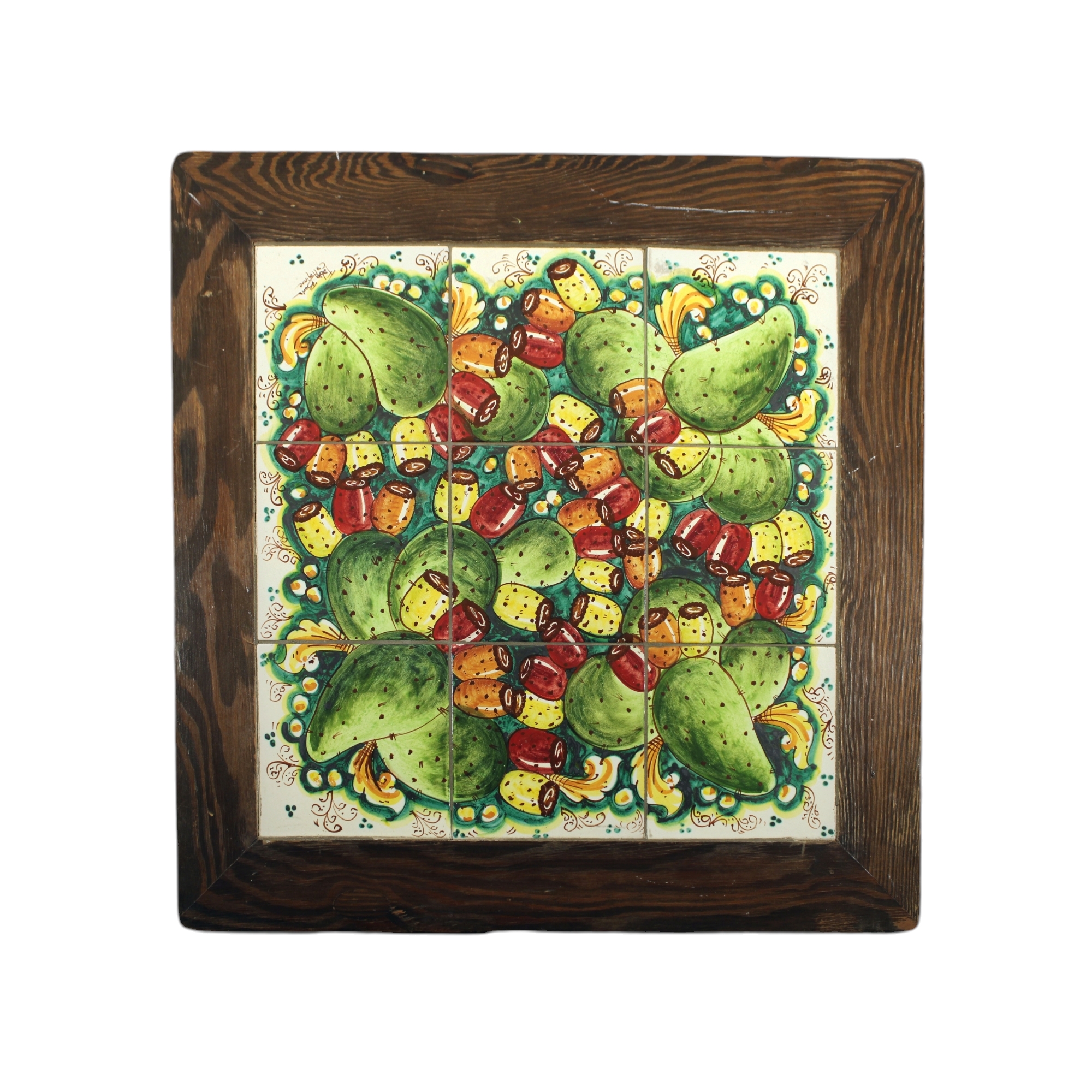 TAVOLO in legno di castagno di forma quadrata con base laccata e piano composto da 9 mattonelle in ceramica dipinta in policromia raffigurante fichi d'india , manifattura Fabio Boria Caltagirone XX secolo Caltagirone XX secolo h cm 80 x 78 x 79