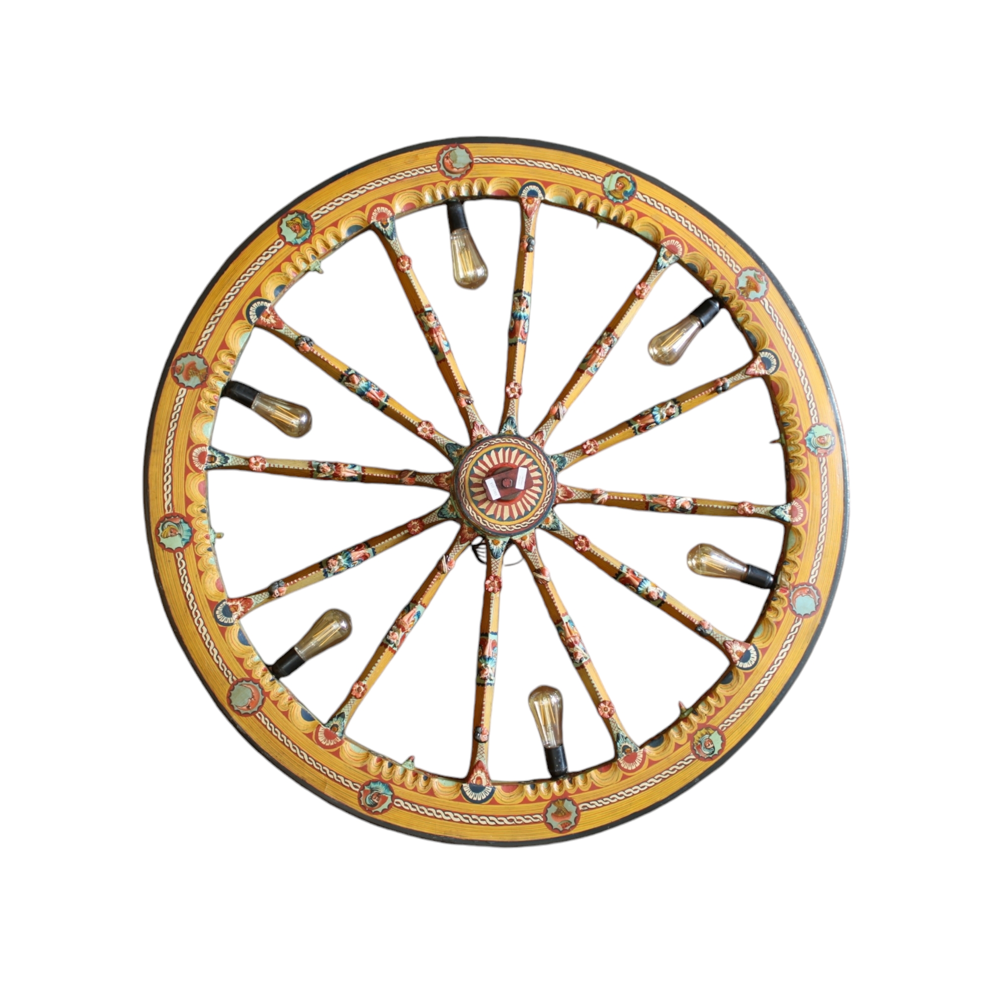 VECCHIA RUOTA DI CARRETTO in legno dipinto in policromia raffigurante dentro riserve paladini siciliani battistrada e fuso in ferro, montato a lampadario a 6 luci maestraze siciliane XX secolo maestraze siciliane XX secolo h cm 28 x Ø 128,5