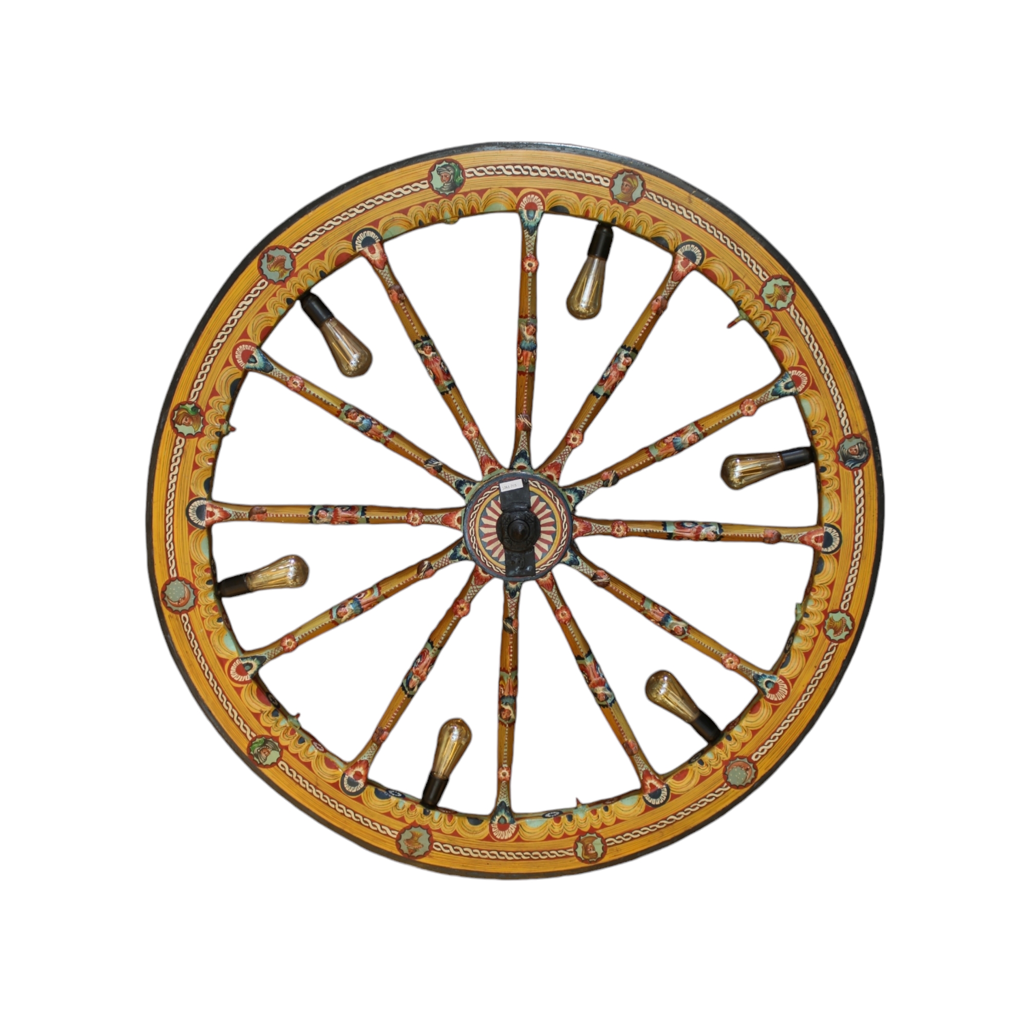 VECCHIA RUOTA DI CARRETTO in legno scolpito dipinto in policromia raffigurante dentro riserve paladini e luna, battistrada e fuso in ferro, montato a lampadario a 6 luci maestraze siciliane XX secolo maestraze siciliane XX secolo h cm 33 x Ø 116