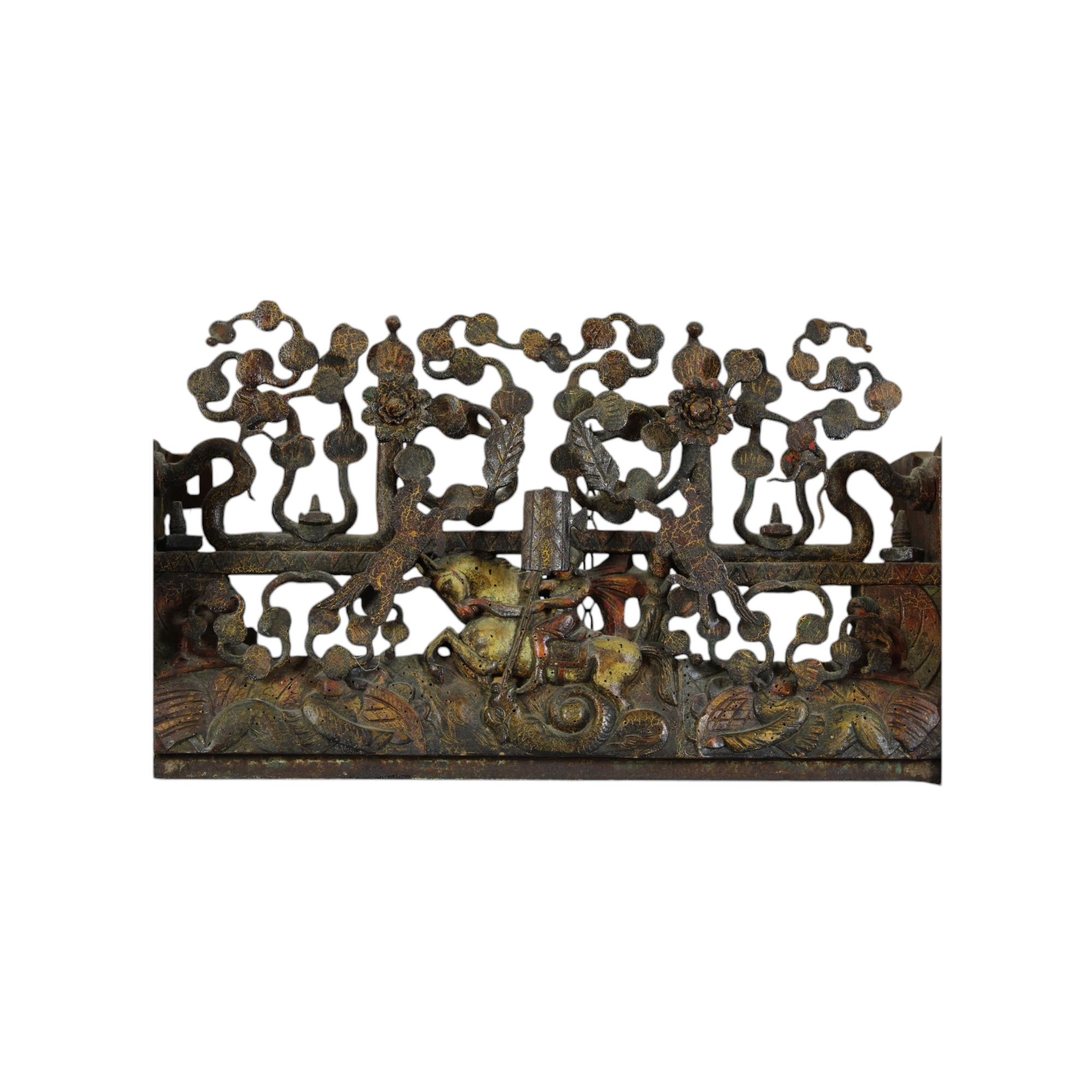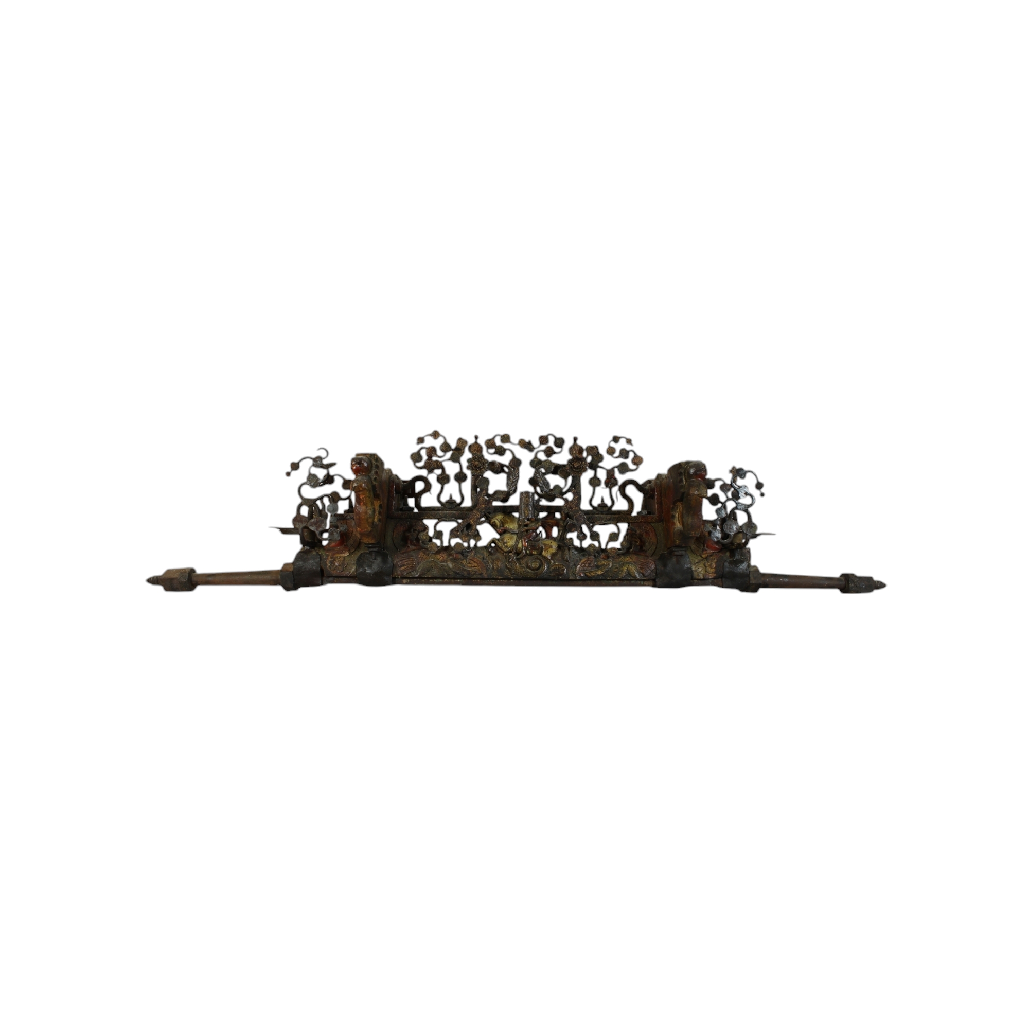 FUSO DI CARRETTO in ferro e legno scolpito raffigurante San Giorgio e il drago, dipinto in policromia maestranze siciliane, supporti in ferro primi XIX secolo primi XIX secolo h cm 36 x 180 / supp h cm 27 x 38