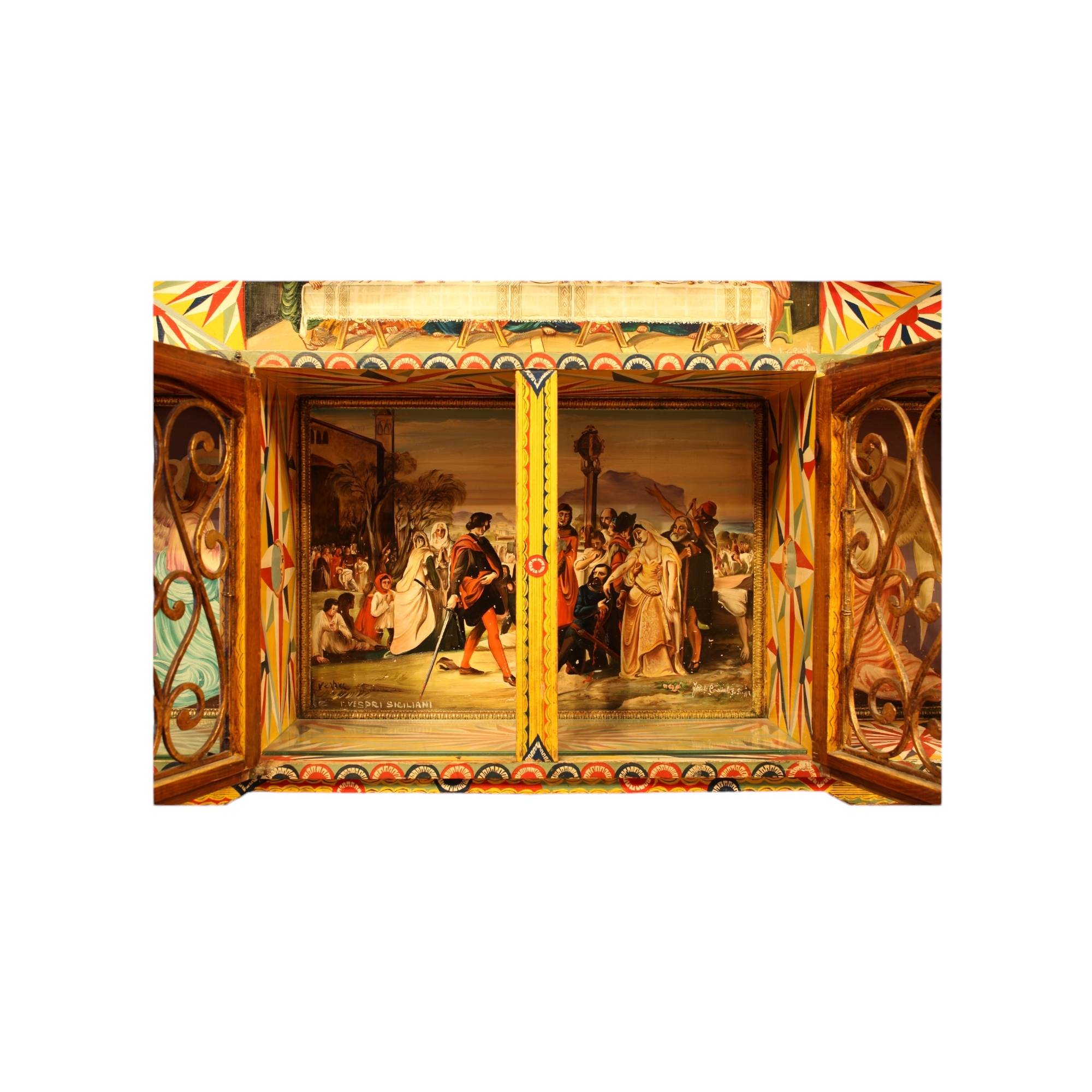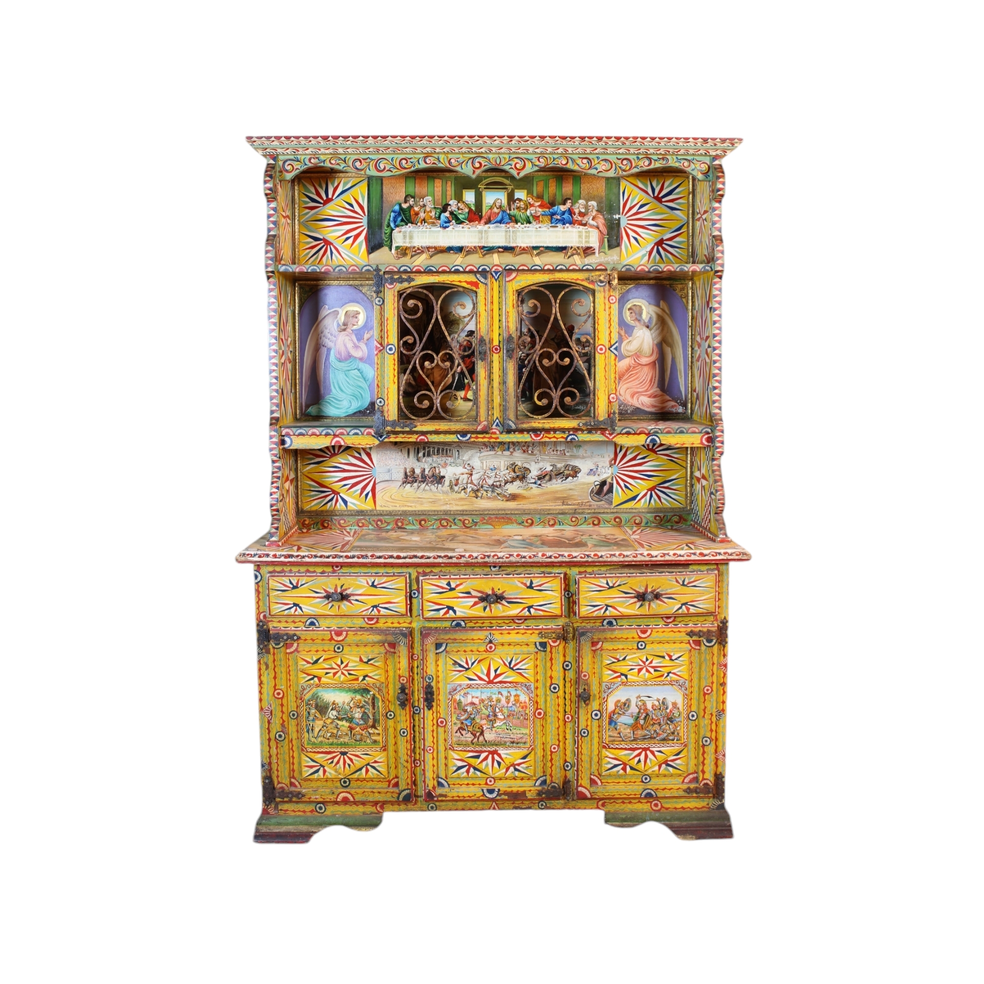 CREDENZA DOPPIO CORPO base a 3 sportelli e 3 cassetti , parte superiore a giorno con 2 sportelli in legno riccamente dipinta a policromia raffigurante dentro riserve scene di battaglie di paladini e Ultima cena, vespri siciliani e scena biblica e angeli. Dipinto da Paolo Cardinale fu Giuseppe. Reca dedica "Sia la vostra nuova vita o sposi gentili, una Peppe-tua Aurora" Sicilia prima metà del XX secolo Sicilia prima metà del XX secolo h cm 203 x 145 x 45,5