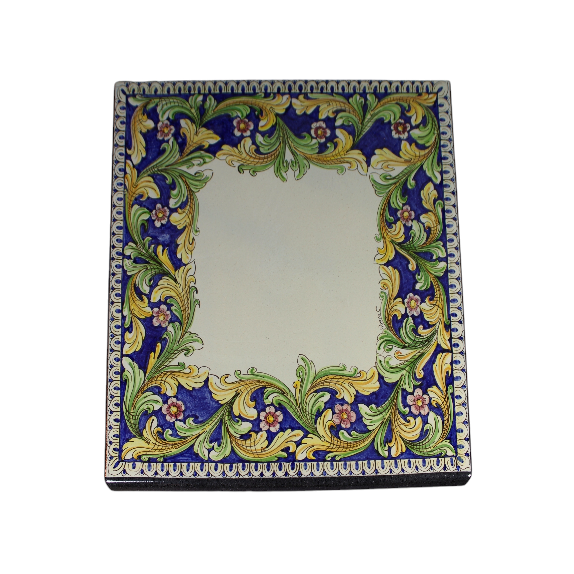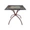 TAVOLO con piano in pietra lavica quadrato dipinto a motivi grotteschi, base in ferro. Firmato ceramista Pirrera S.Stefano di Camastra XX secolo XX secolo h cm 81 x 85 x 85