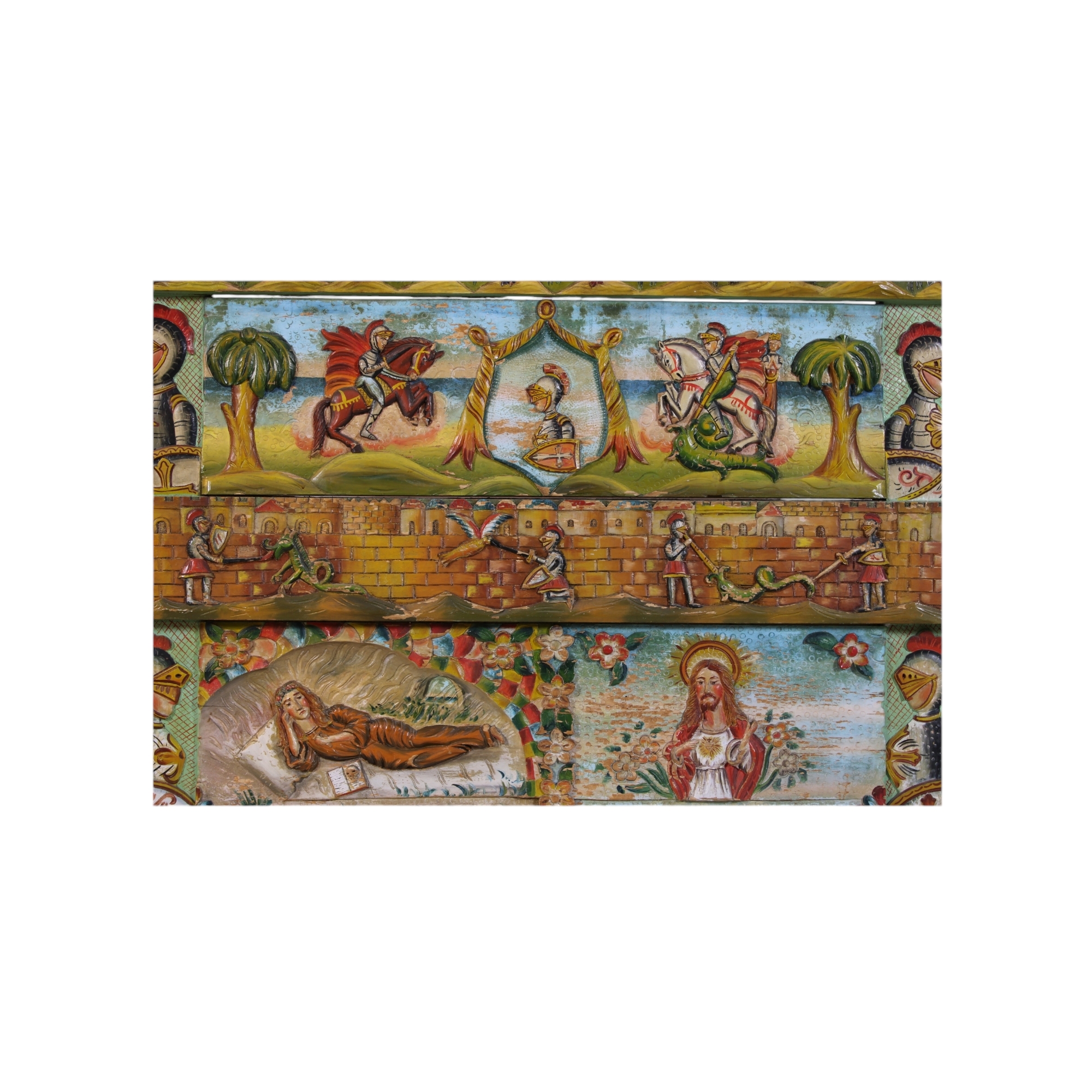 PANNELLO DECORATIVO in legno riccamente scolpito a basso rilievo in policromia raffigurante Sacro Cuore di Gesù, San Giorgio, S.Rosalia XX secolo XX secolo h cm 127 x 144