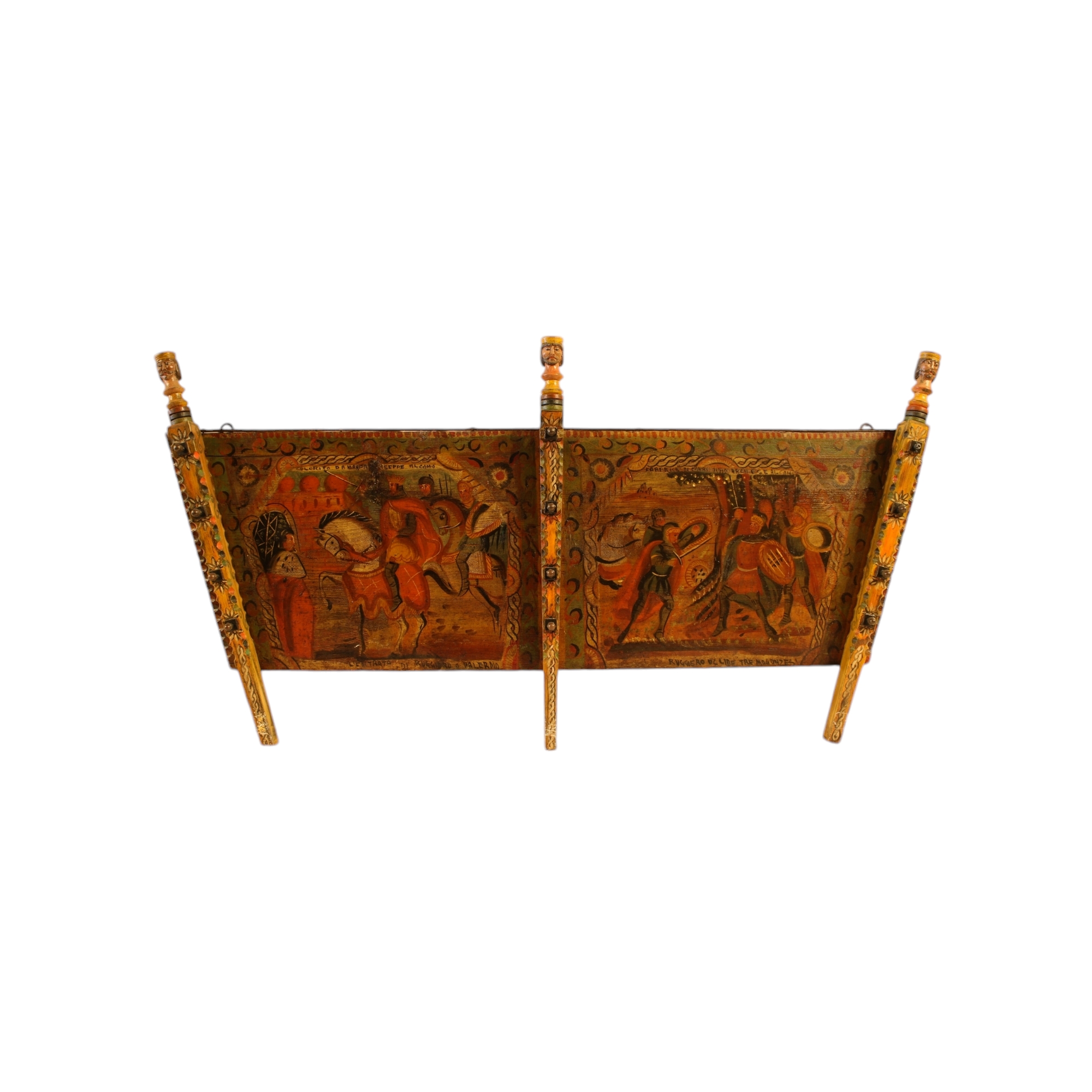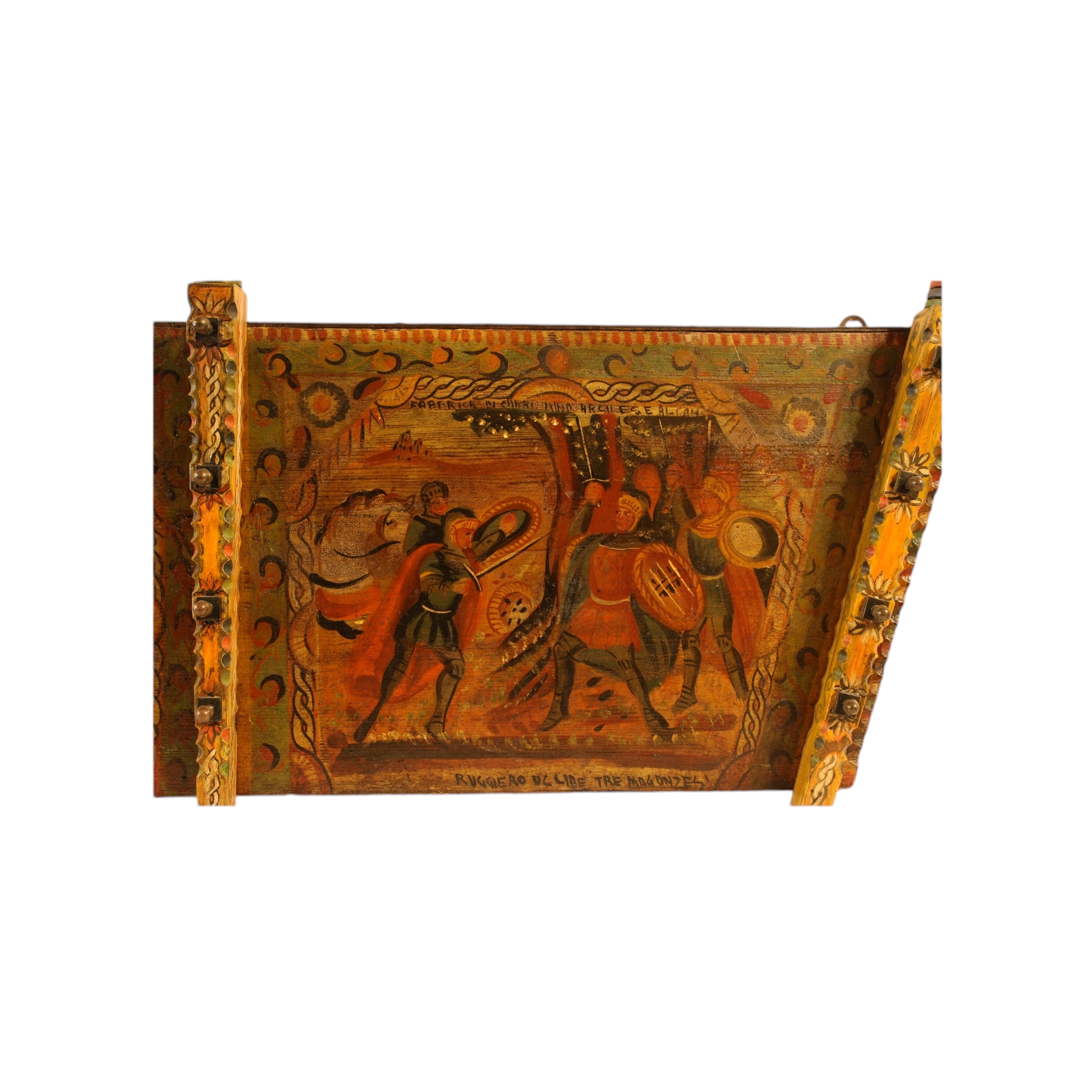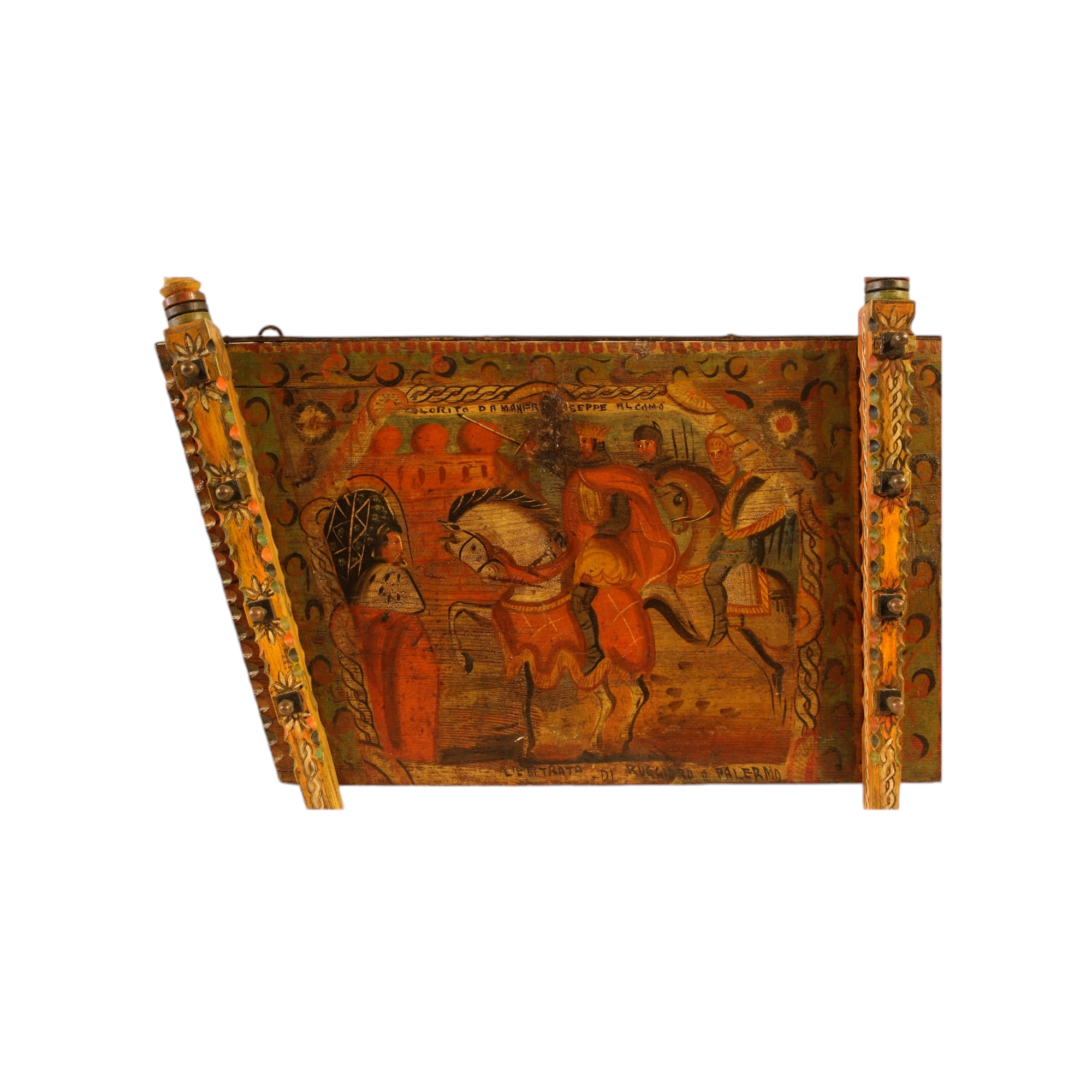 SPONDA DI CARRETTO in legno scolpito e dipinto in policromia raffigurante l'entrata di Ruggero a Palermo e Ruggero libera tre magonzesi, reca scritta "colorito da Manfredi Giuseppe Alcamo fabbrica di carri Nino Arcilese e Alcamo" maestranze siciliane prima metà del XX secolo maestranze siciliane prima metà del XX secolo h cm 138 x 71,5
