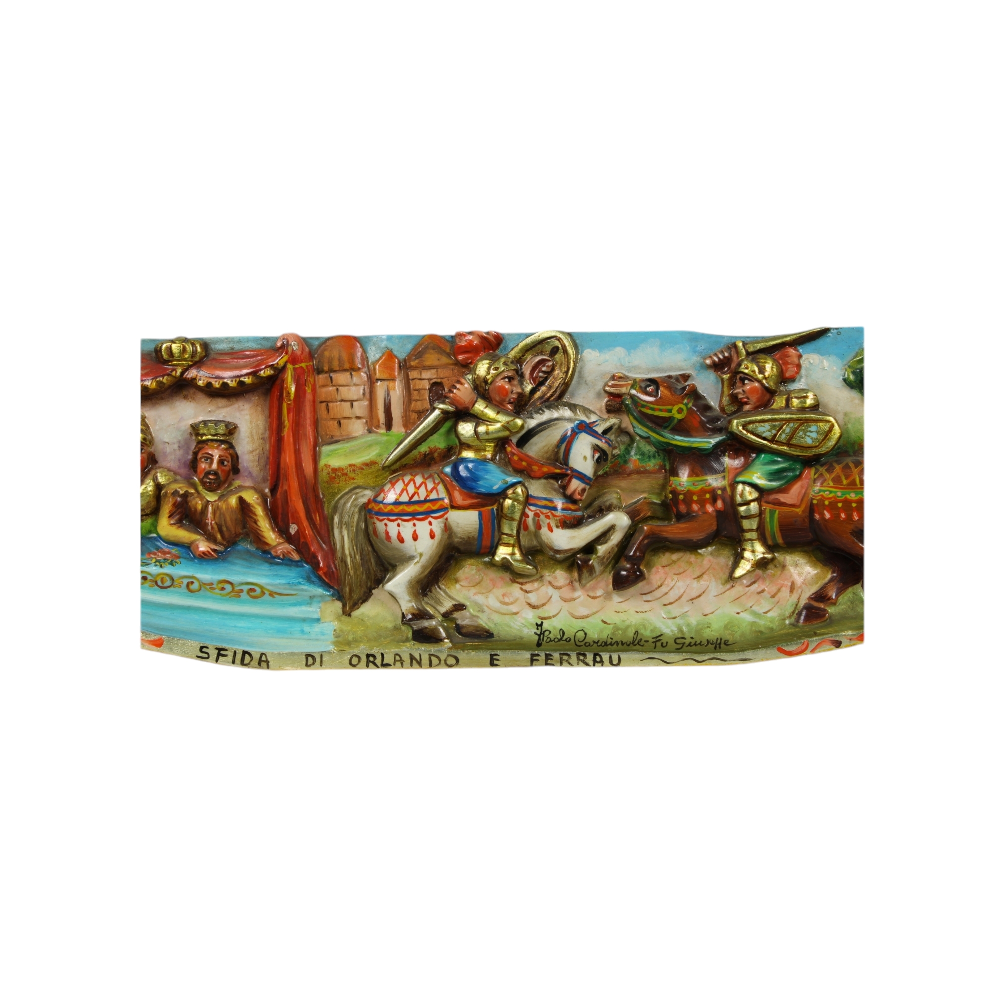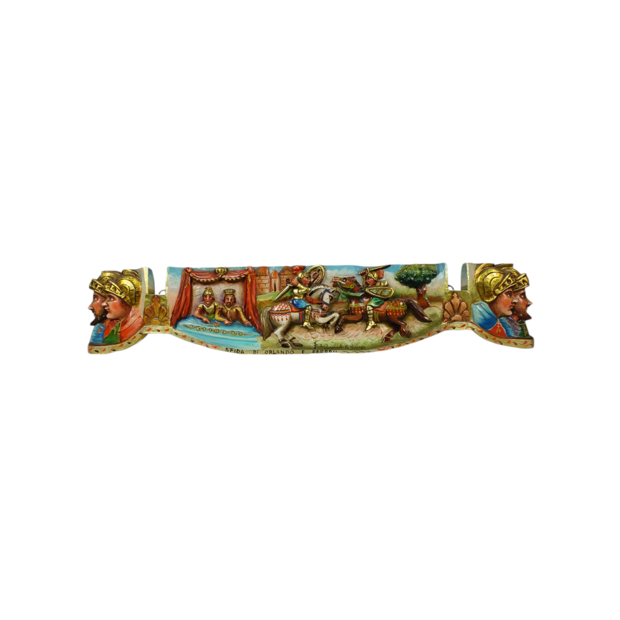 CHIAVE DI CARRETTO in legno scolpito e dipinto in policromia e lumeggiature in oro raffigurante sfida di Orlando e Ferrau firmato Francesco Paolo Cardinale fu Giuseppe XX secolo XX secolo h cm 17,5 x 90