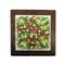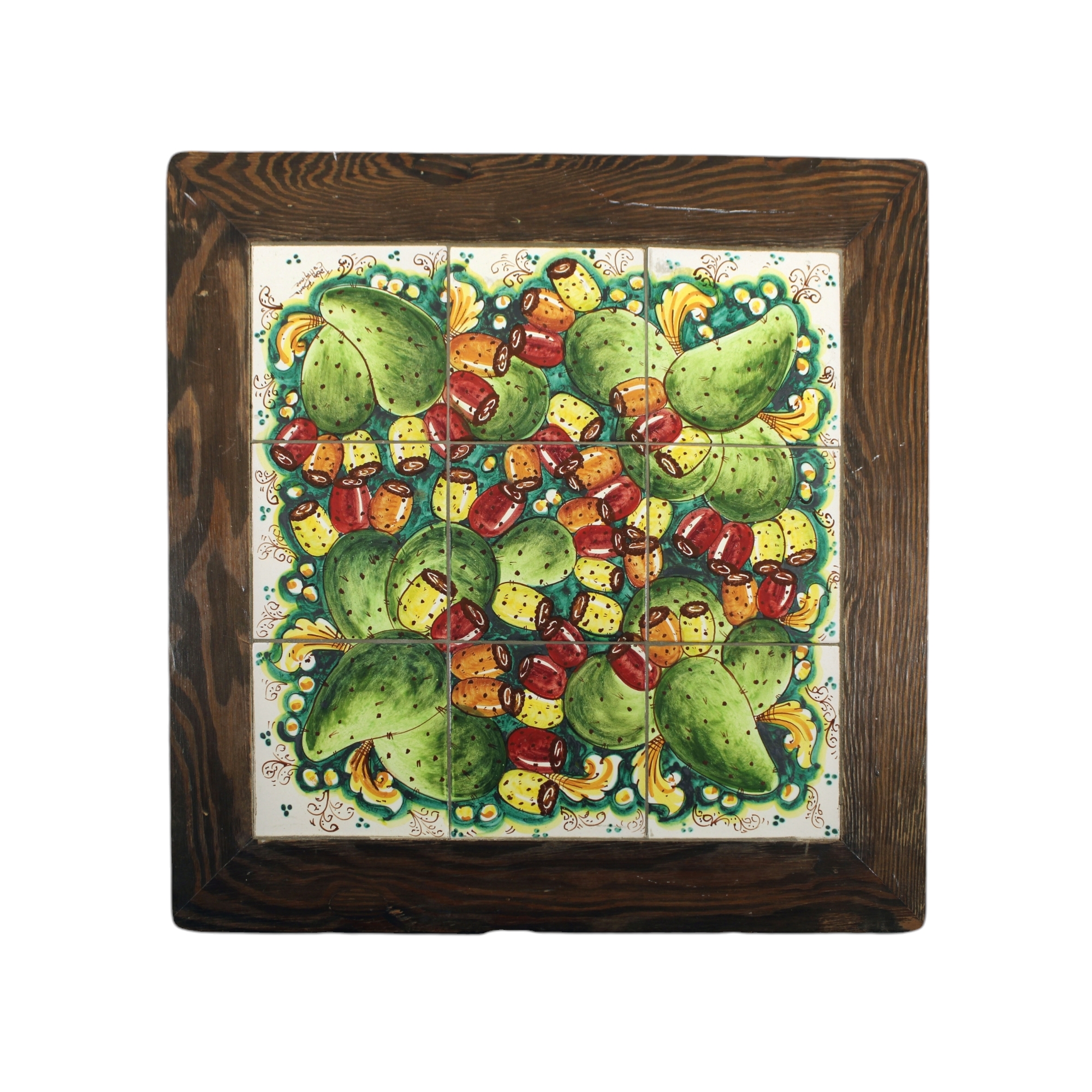 TAVOLO in legno di castagno di forma quadrata con base laccata e piano composto da 9 mattonelle in ceramica dipinta in policromia raffigurante fichi d'india , manifattura Fabio Boria Caltagirone XX secolo Caltagirone XX secolo h cm 80 x 78 x 79