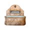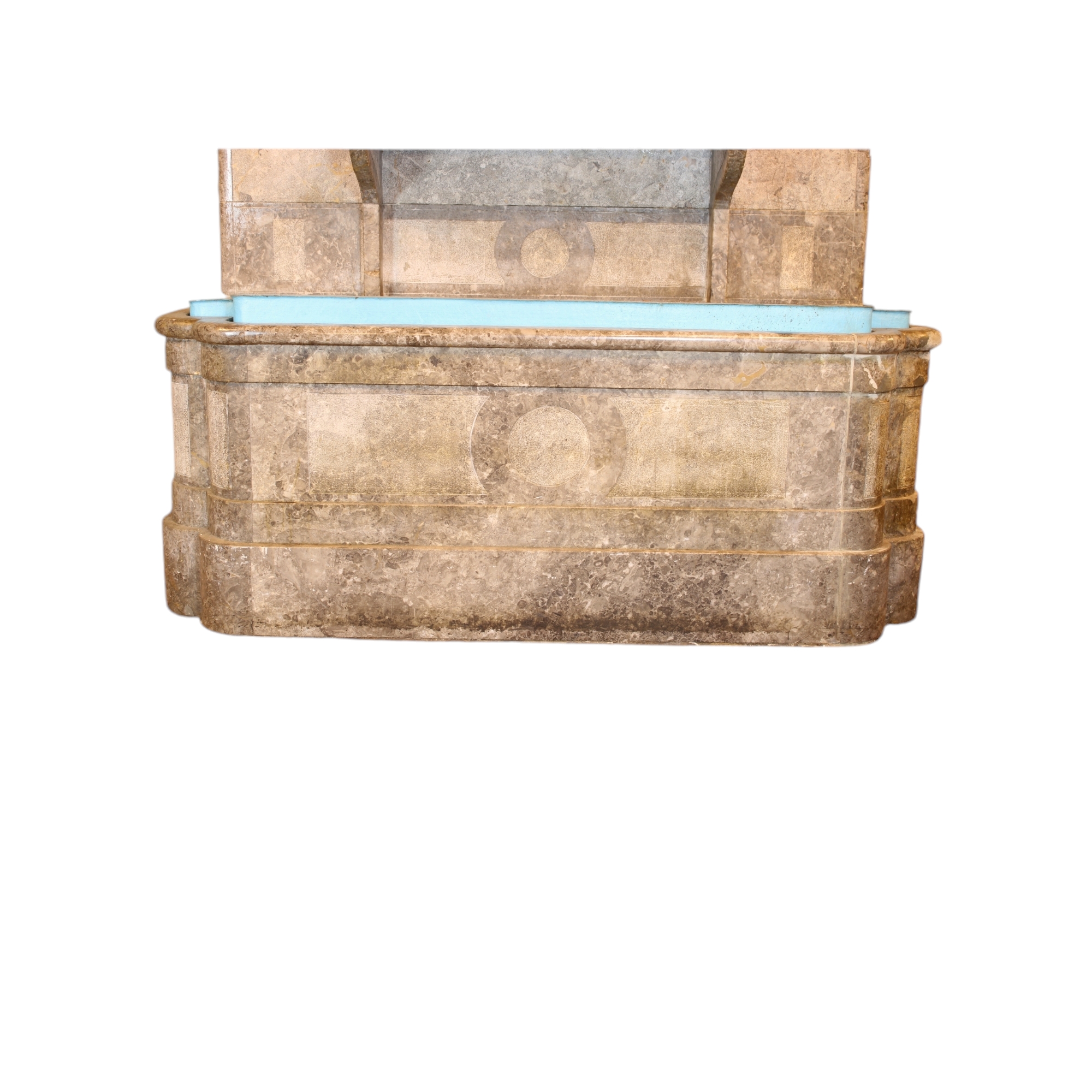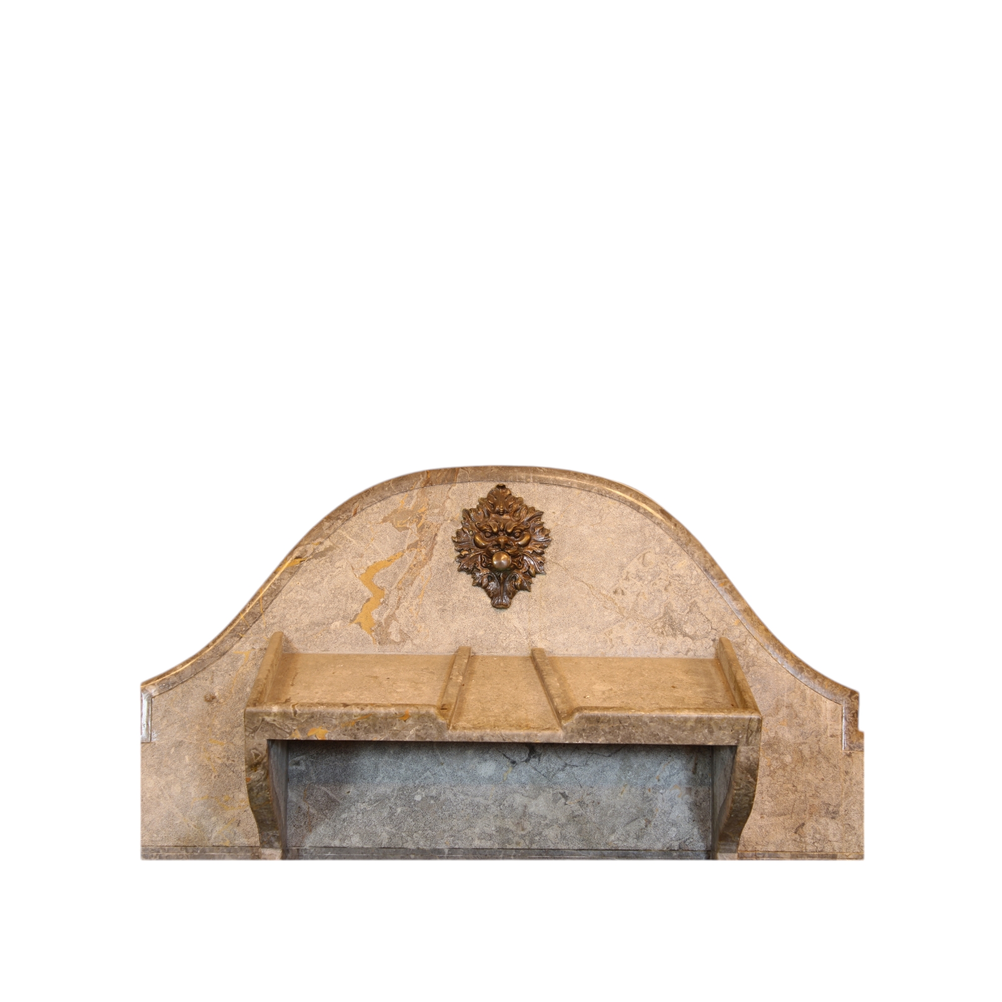 FONTANA in marmo grigio di Billiemi composta da vasca rialzata e frontale a cascata con mascherone in bronzo, arricchita da decori scolpiti a martellino maestranze siciliane 1940/1970 maestranze siciliane 1940/1970 h cm 208 x 212 x 104