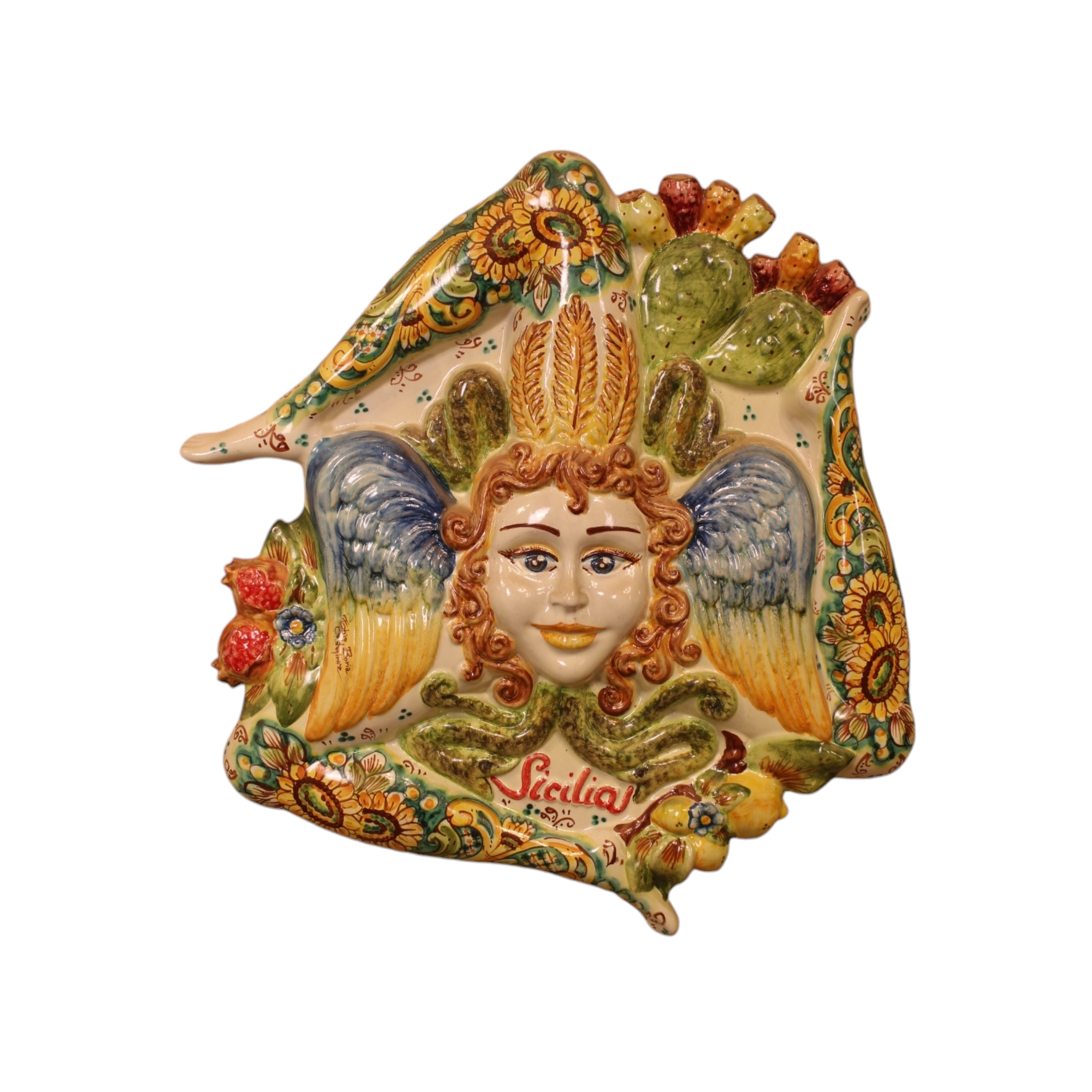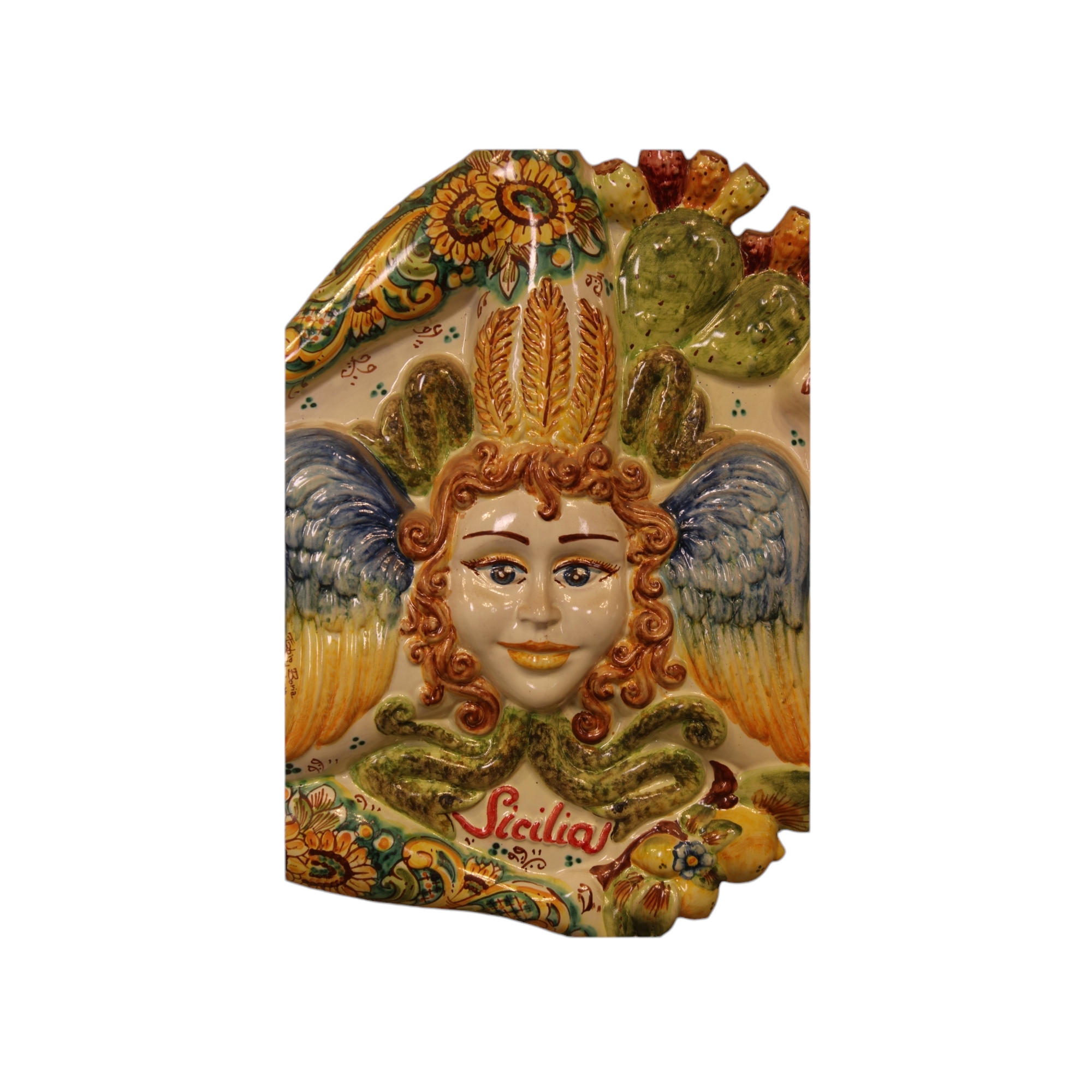 PLACCA DA PARETE in maiolica policroma raffigurante la Trinacria manifattura Fabio Boria XX secolo XX secolo h cm 54 x 60