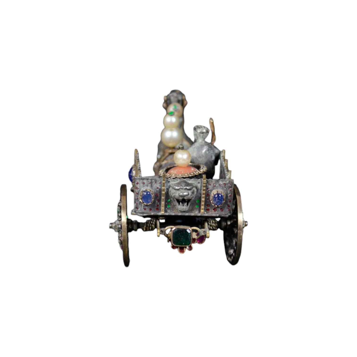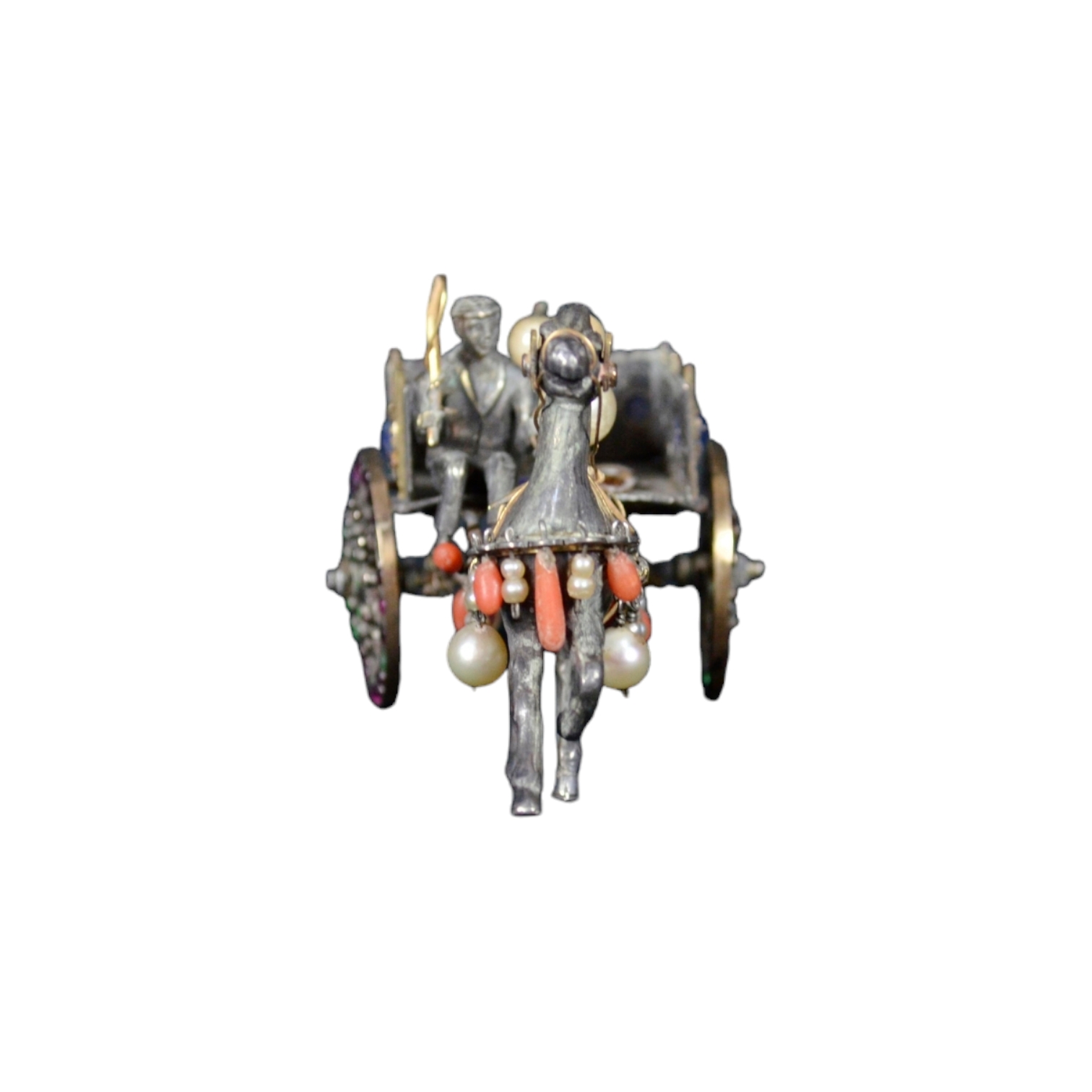 GRUPPO SCULTOREO raffigurante carrettino siciliano con cavallo e personaggio in argento massiccio ed oro, arricchito da pietre e materiali preziosi Italia fine 1880-1920 circa Italia fine 1880-1920 circa h cm 6 x 11 x 4,5