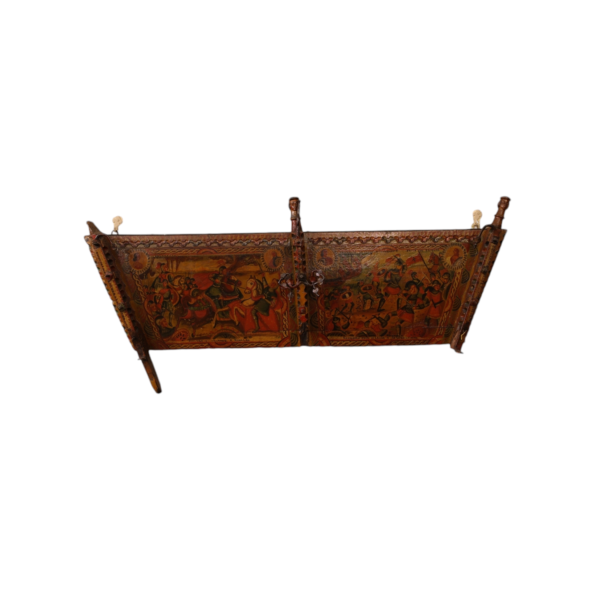 SPONDA DI CARRETTO in legno scolpito, applicazioni in ferro, dipinto in policromia raffigurante la giostra di Orlando e Rinaldo e Ruggero cuor di leone a Gerusalemme, colorito da Manfrè e Giuseppe che abita in Sciacca. Difetti h cm 65 x 139