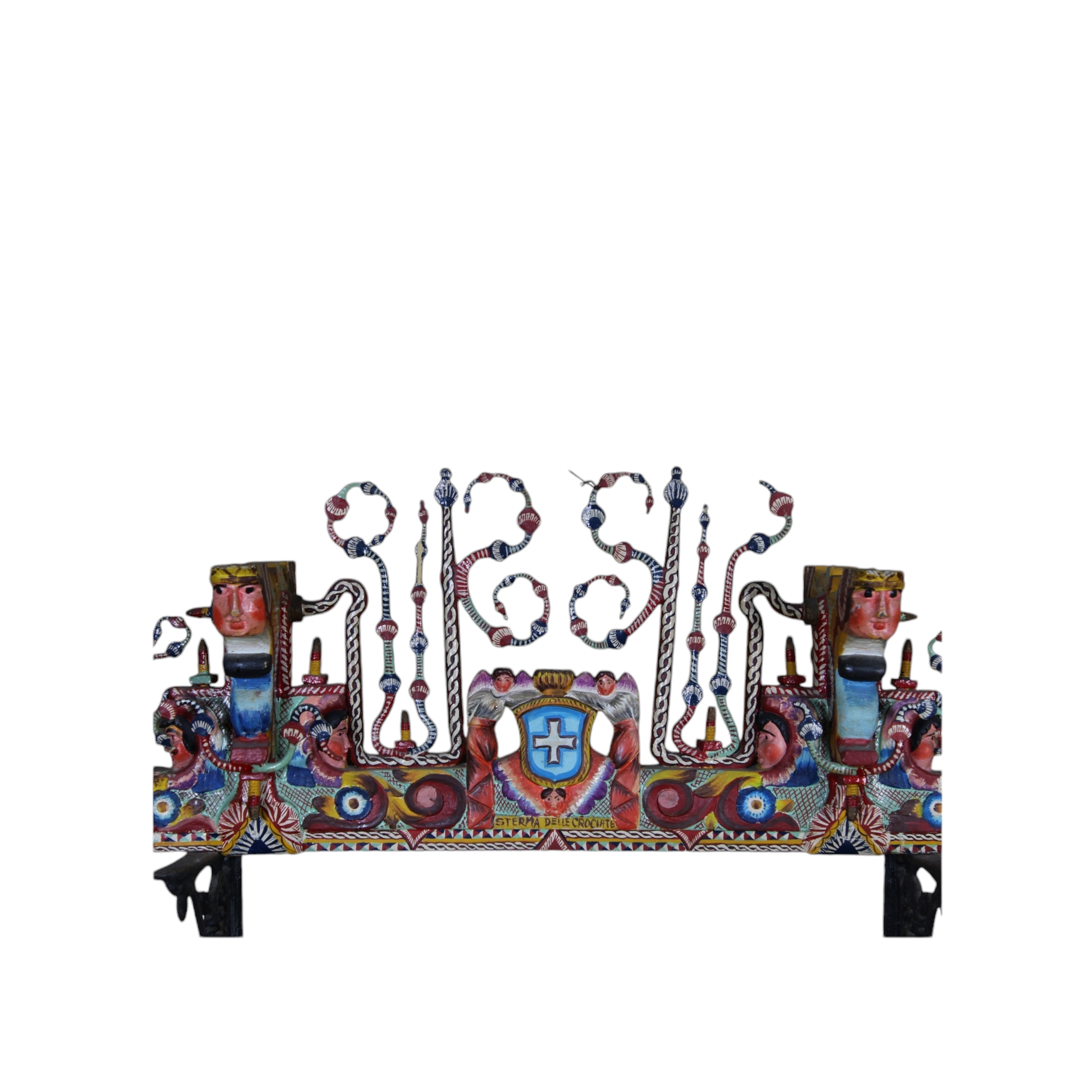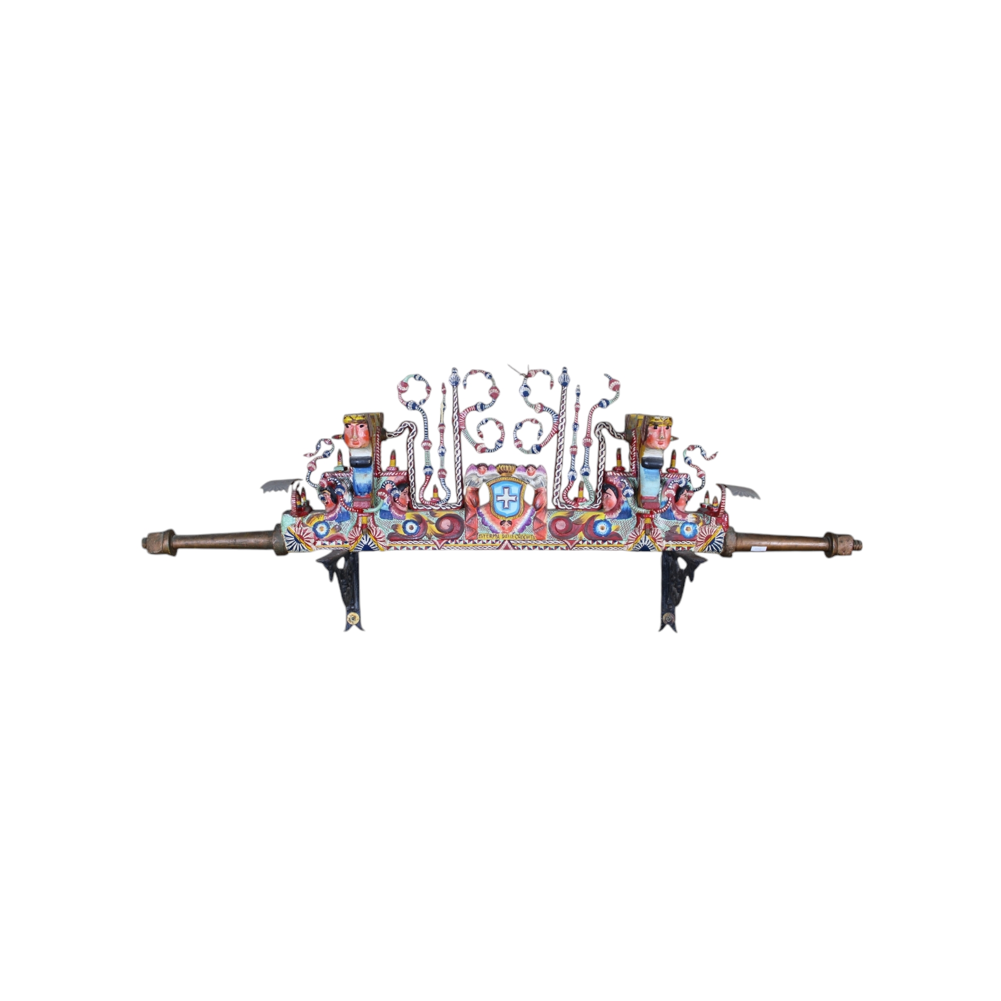 FUSO DI CARRETTO in legno scolpito e ferro battuto dipinto in policromia con stemma delle crociate, supporti in ferro maestranze siciliane XIX/XX secolo maestranze siciliane XIX/XX secolo h cm 44 x 177