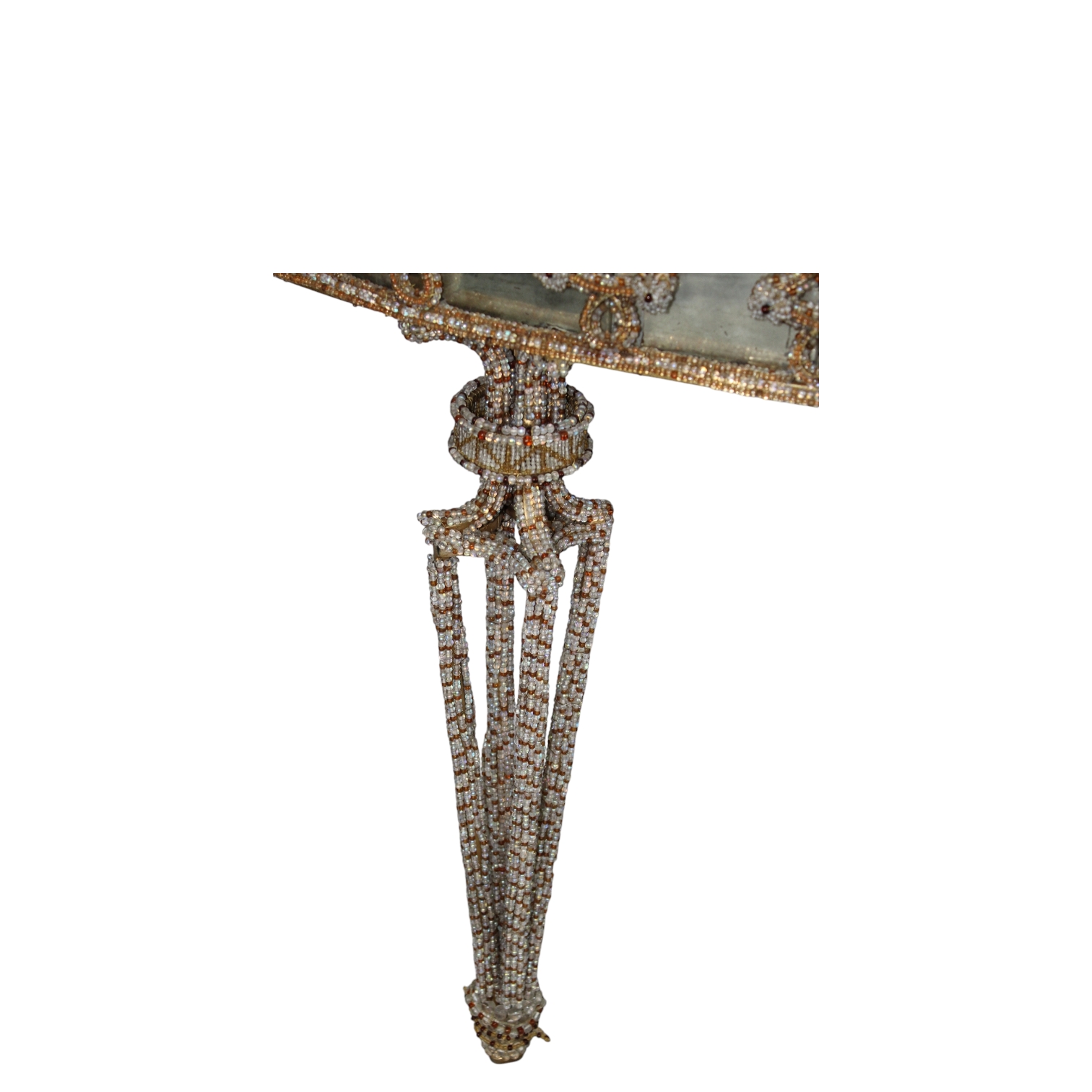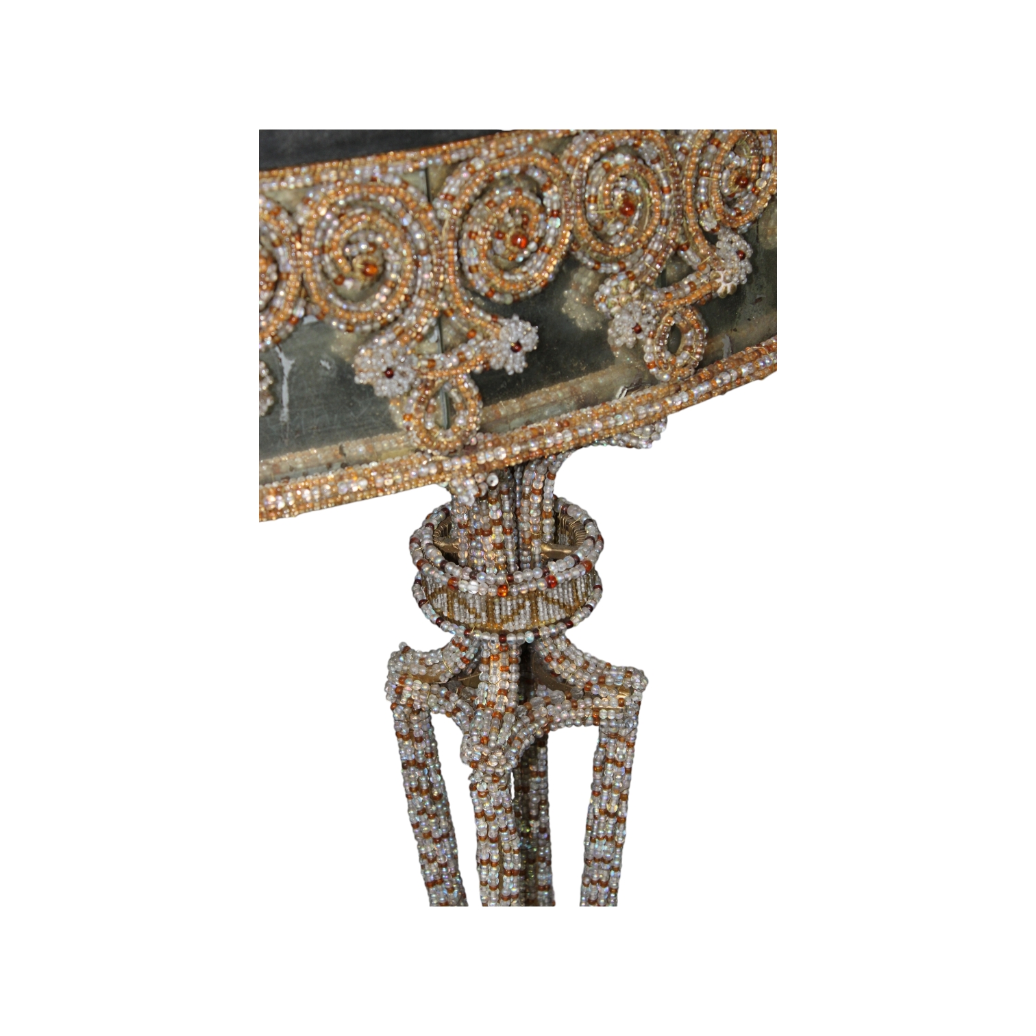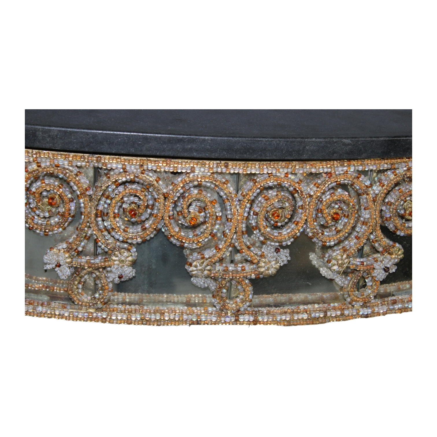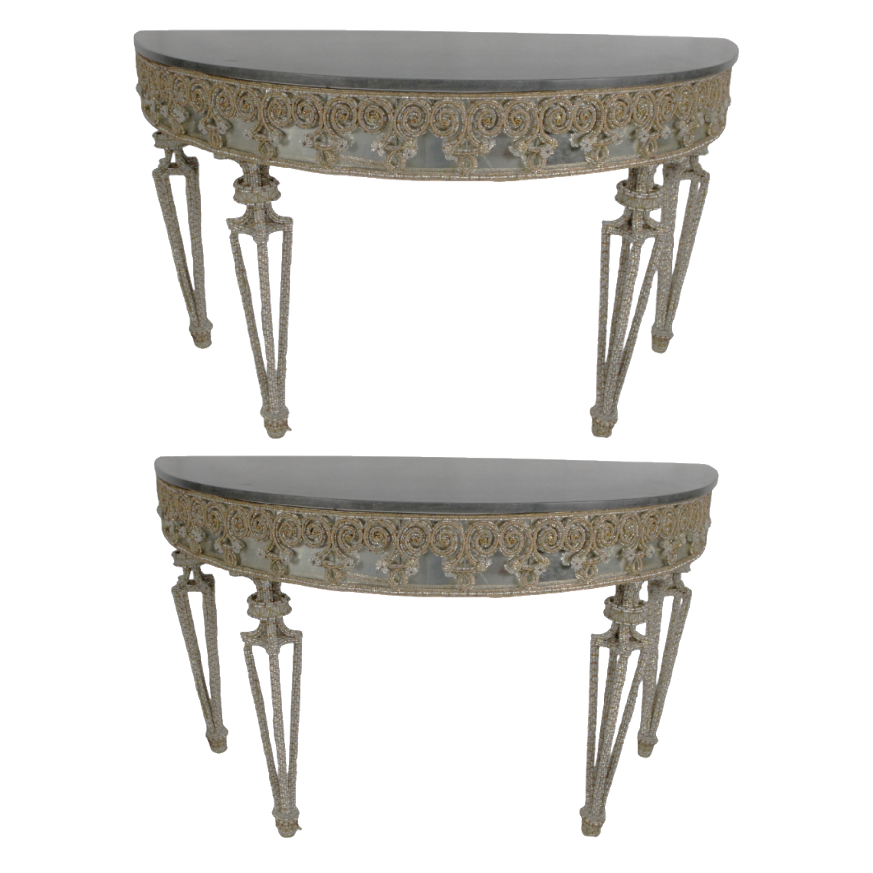 COPPIA CONSOLLE A MEZZA LUNA in ferro arricchita da perline in vetro e pasta di vetro piano in ardesia maestranze siciliane XIX/XX secolo maestranze siciliane XIX/XX secolo h cm 92 x 154 x 66