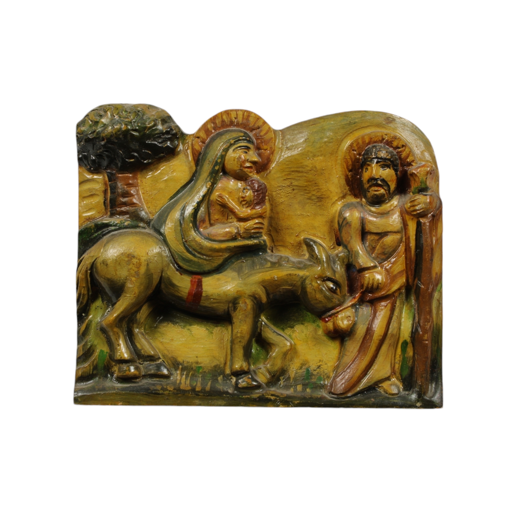 ELEMENTO in legno scolpito e dipinto in policromia raffigurante fuga d' Egitto maestranze siciliane XX secolo maestranze siciliane XX secolo h cm 17 x 20,5