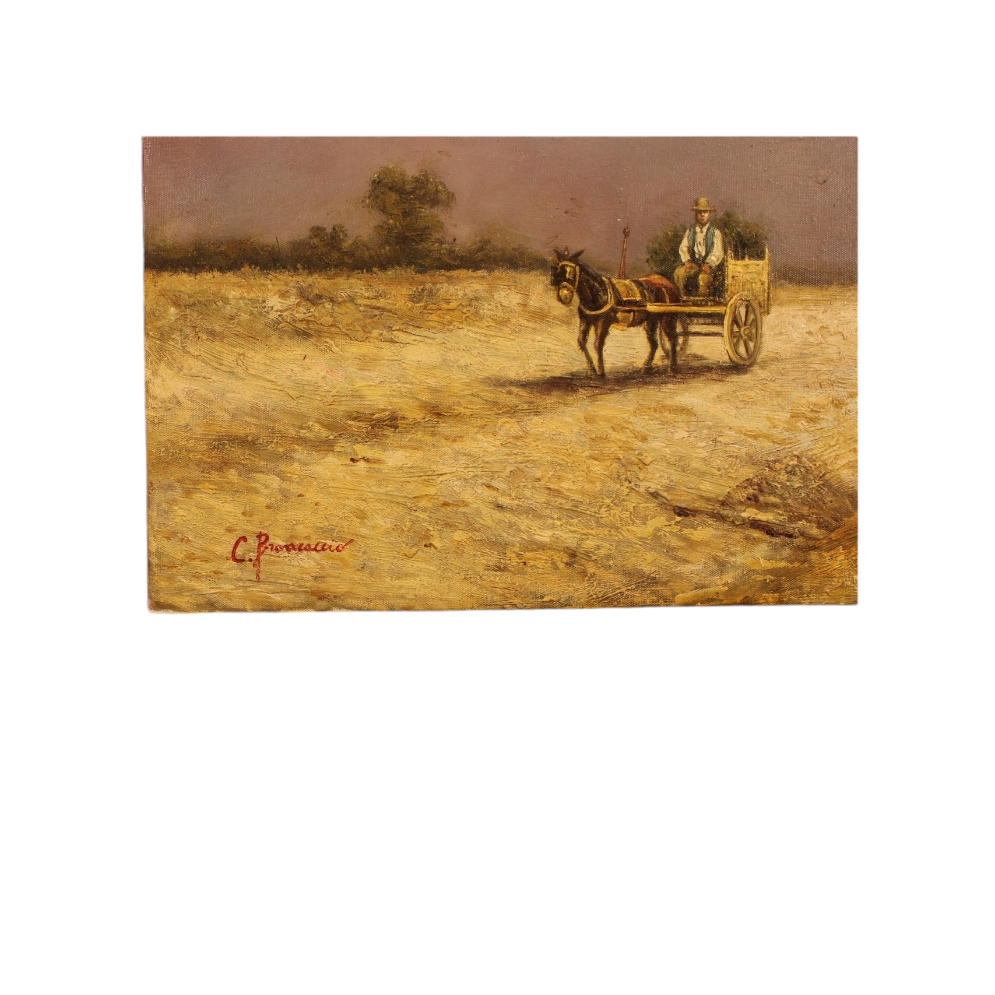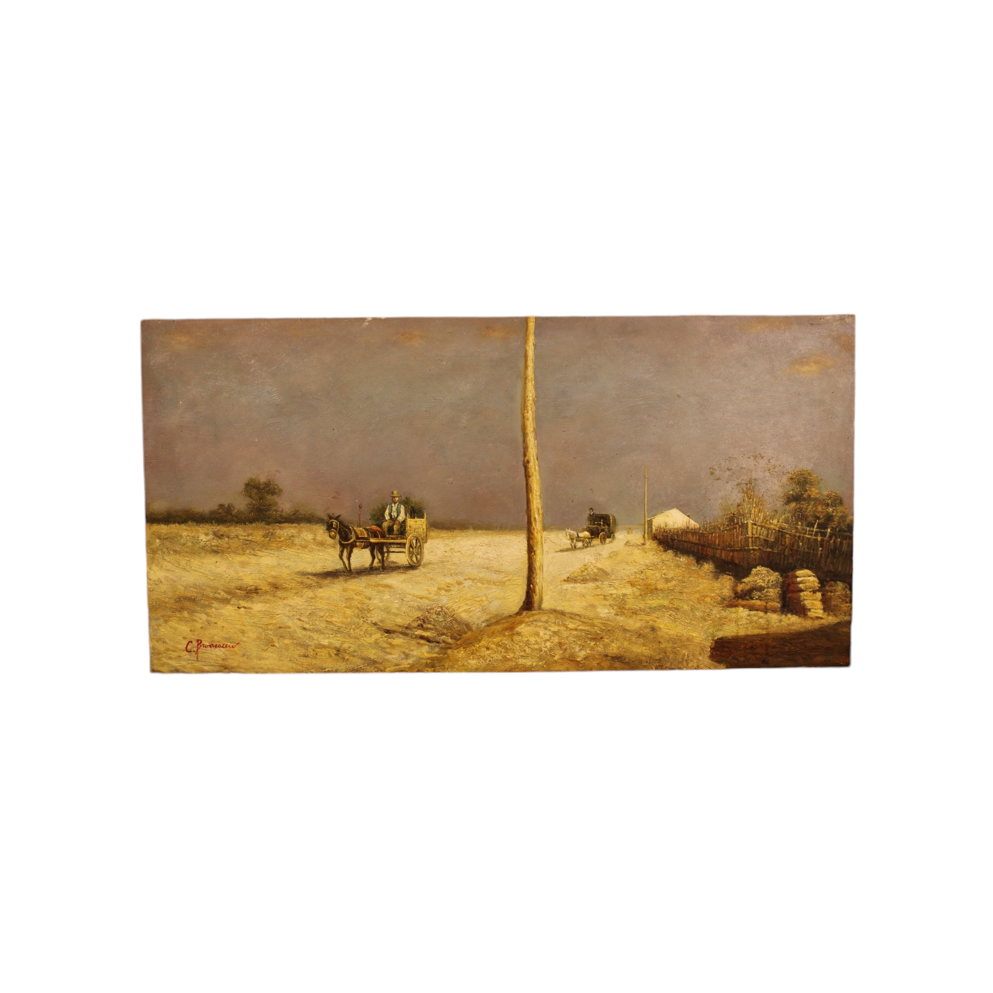 OLIO SU TELA raffigurante carrettini in cammino in paesaggio di campagna h cm 80 x 40