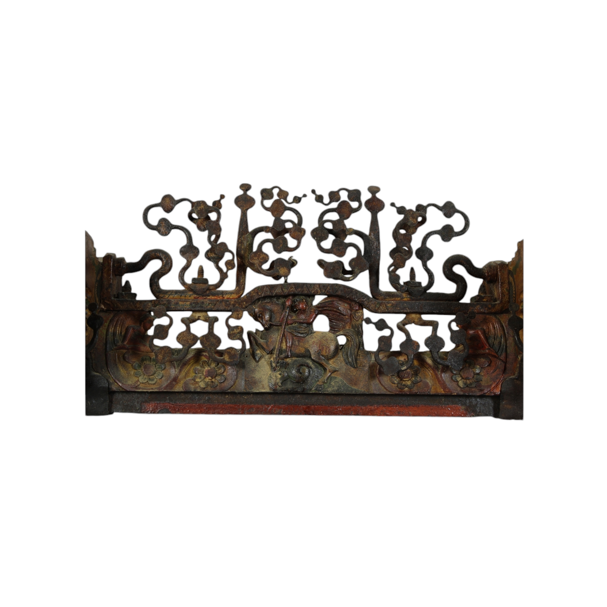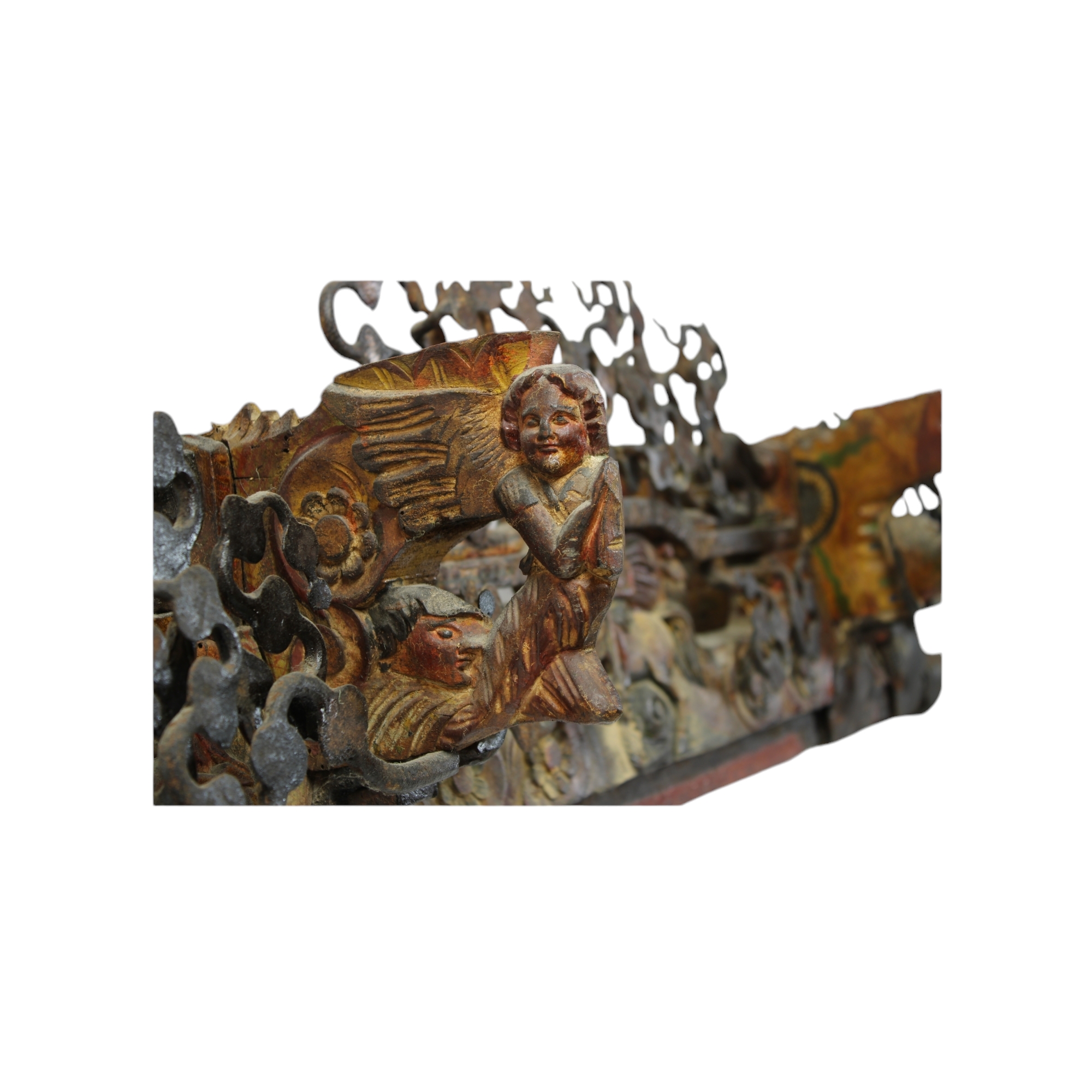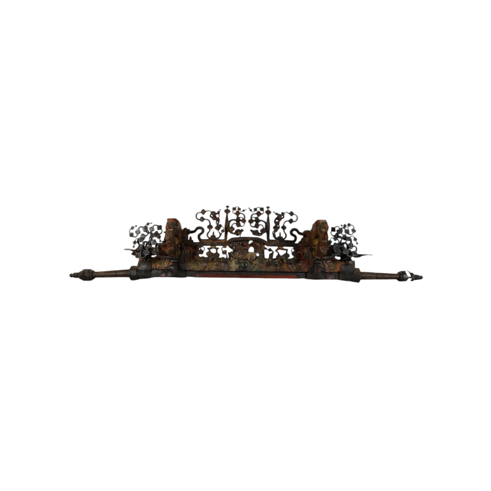 FUSO DI CARRETTO in ferro battuto e legno scolpito, dipinto in policromia, maestranze siciliane, supporti in ferro prima metà XIX secolo prima metà XIX secolo h cm 35 x 180 x 40 / supp. H cm 27 x 38