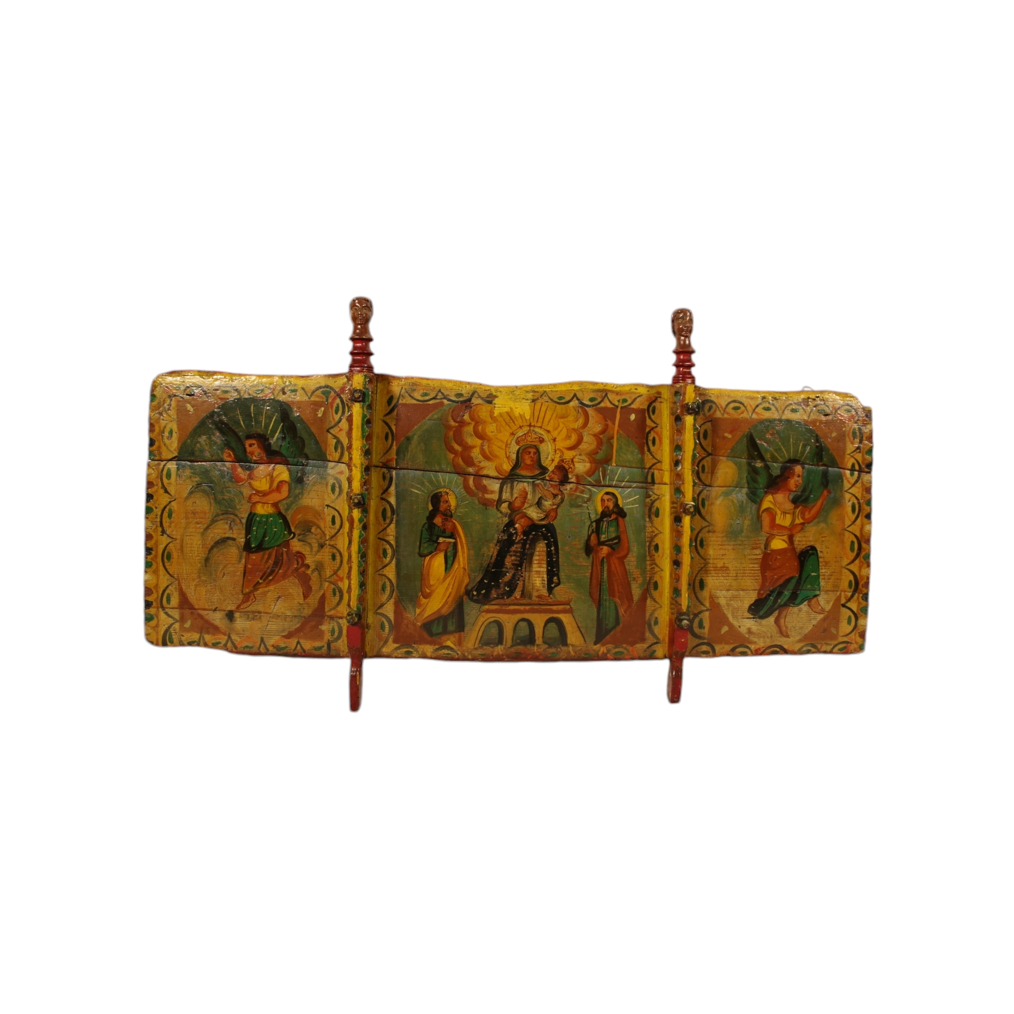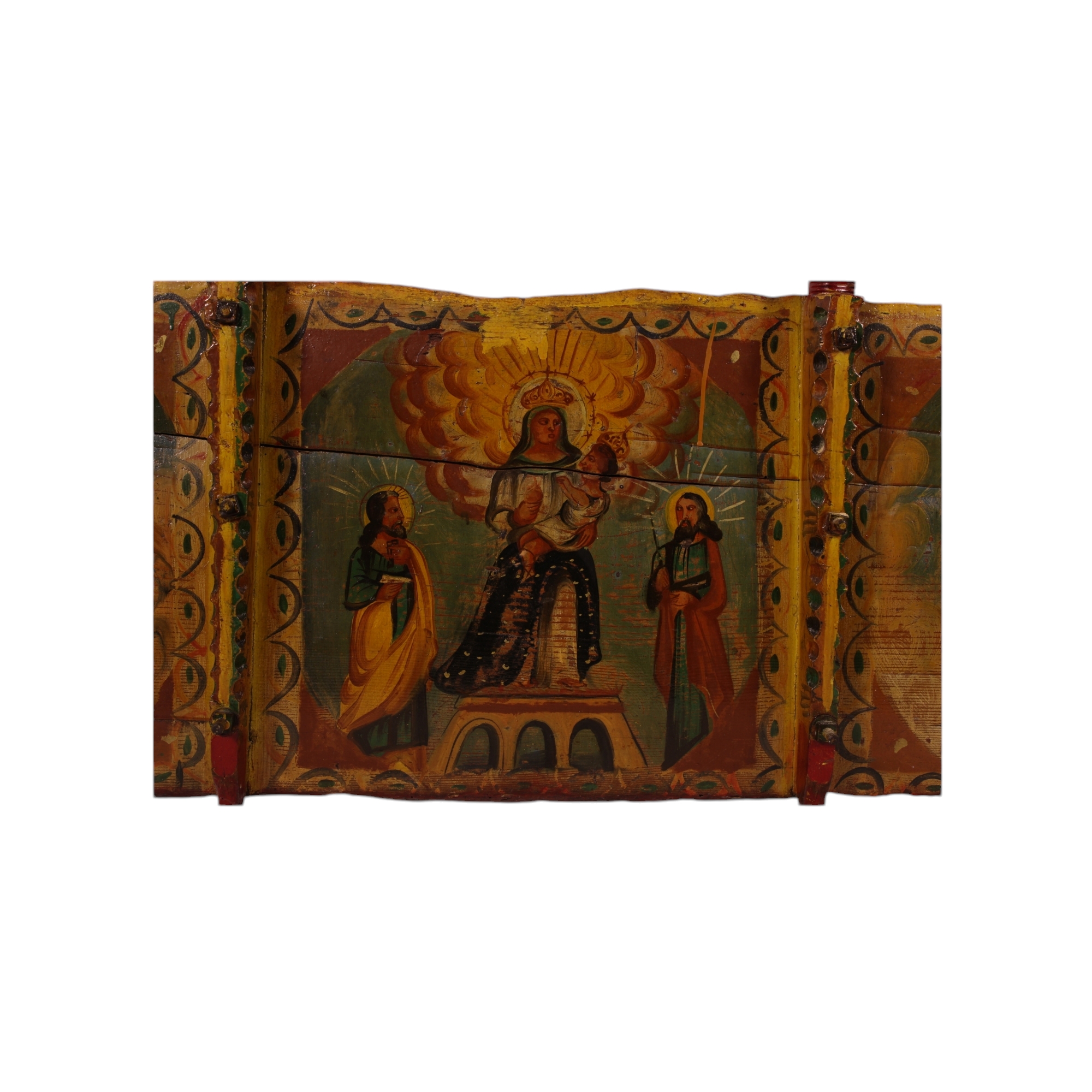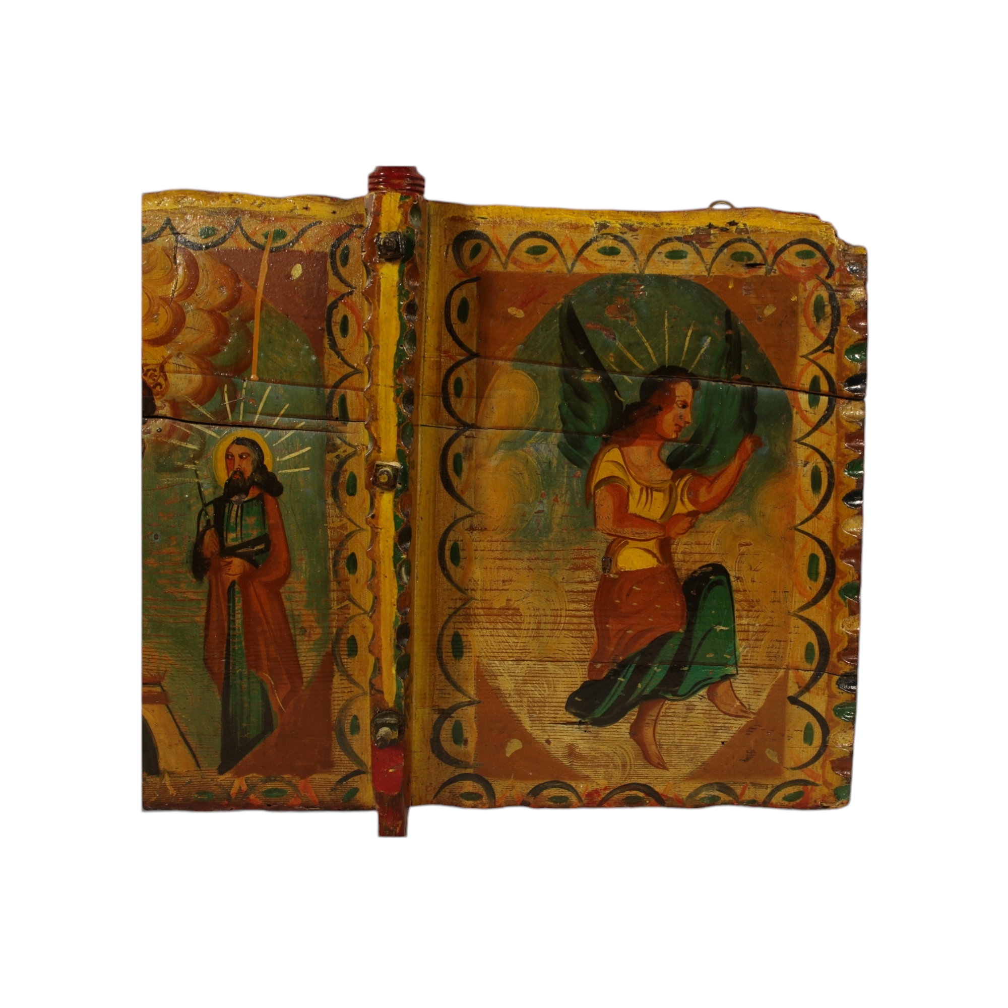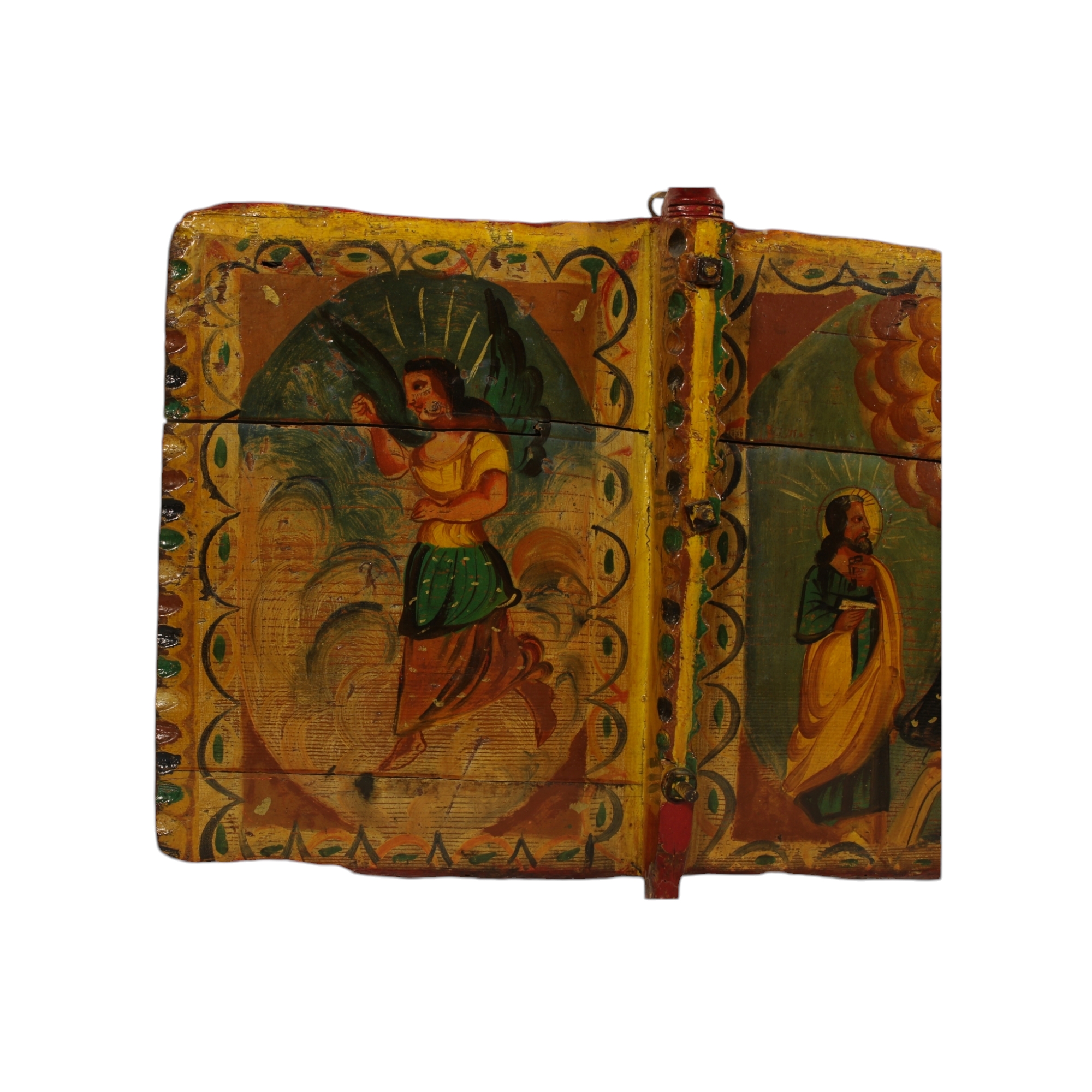 PORTELLO POSTERIORE DI CARRETTO in legno dipinta raffigurante scene sacre XIX sec. Sicilia. Evidenti difetti sulla struttura del legno h cm 63 x 113