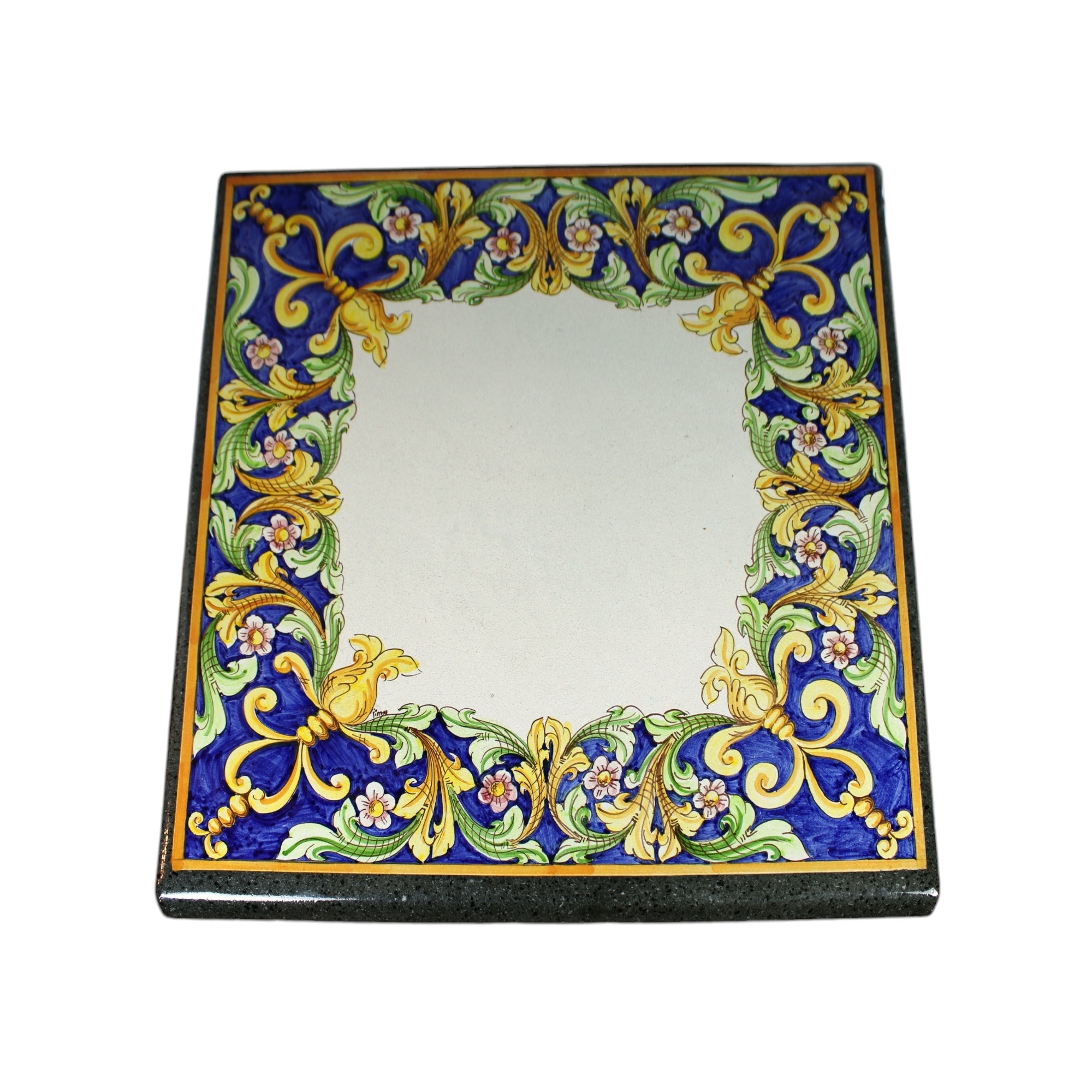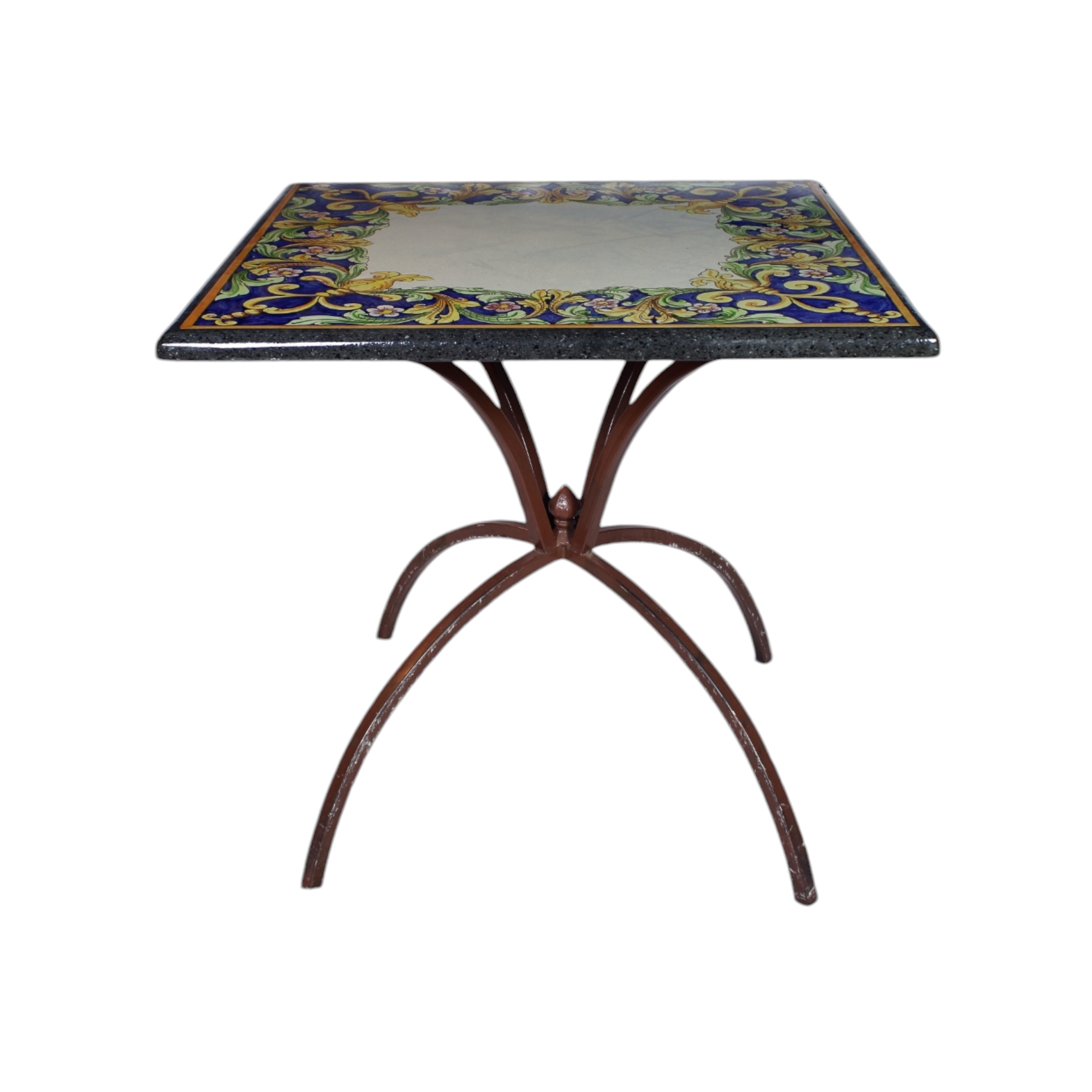 TAVOLO con piano in pietra lavica quadrato dipinto a motivi grotteschi , base in ferro. Firmato ceramista Pirrera S.Stefano di Camastra XX secolo XX secolo h cm 81 x 85 x 85