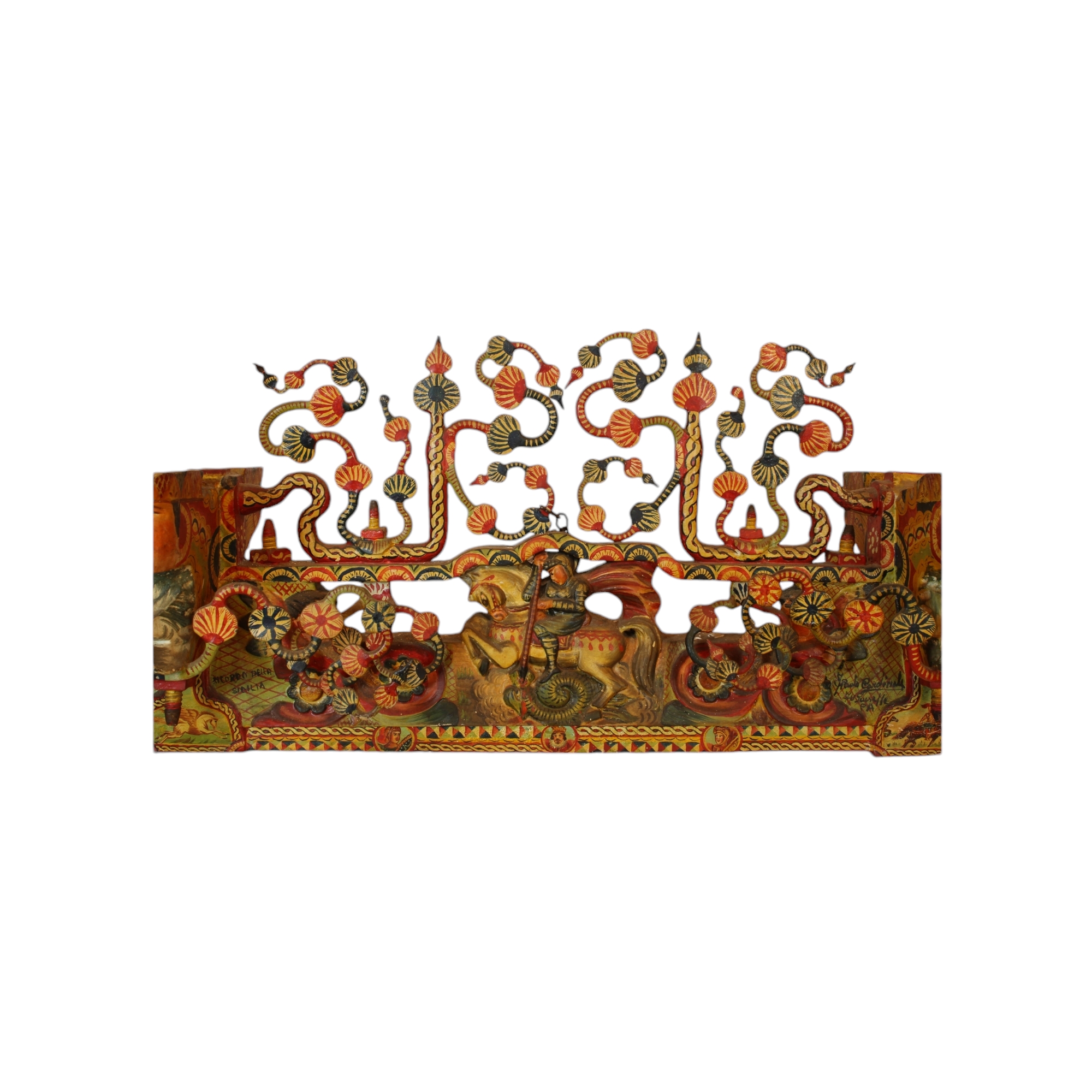 FUSO DI CARRETTO in legno scolpito e ferro riccamente dipinto in policromia firmato Francesco Paolo Cardinale fu Giuseppe. Presenti supporti in ferro XX secolo XX secolo h cm 40 x 172 / supp. in ferro h cm 28,5 x 39,5