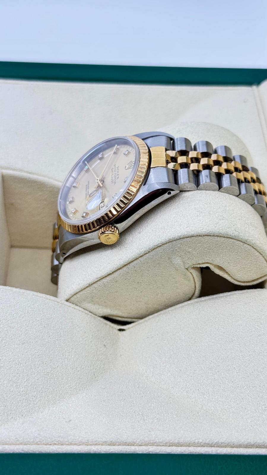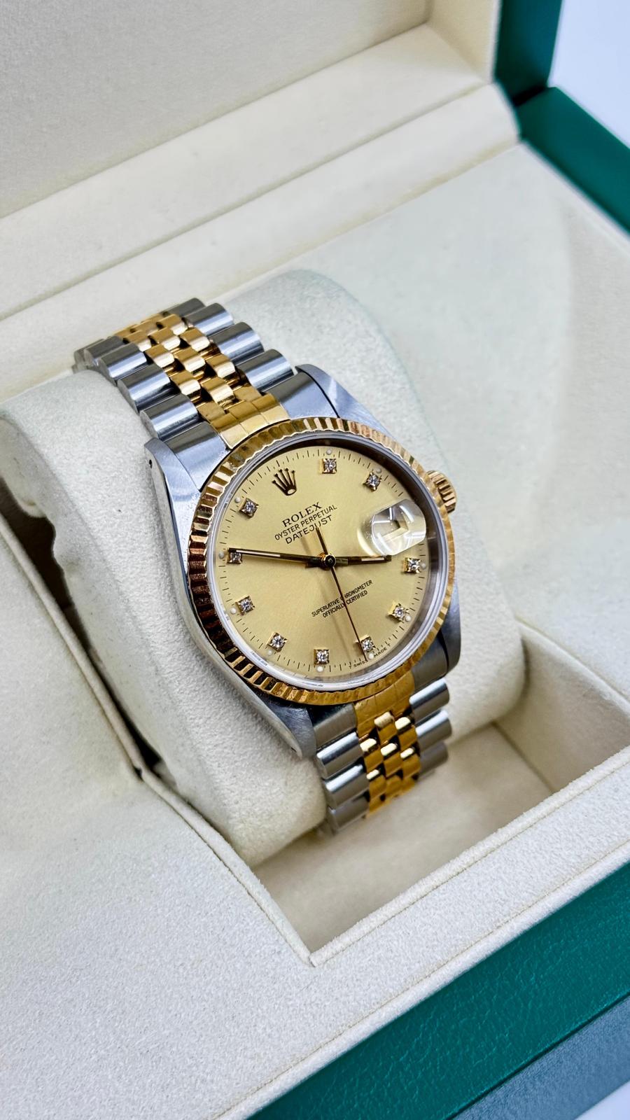 Marca Rolex Modello (Orologio) Datejust 36 Numero di referenza 16233 Quadrante con diamanti Carica Automatico Materiale della cassa Oro/Acciaio Materiale cinturino Oro/acciaio Anno 1992 Condizione Usato (Ottimo) L'articolo presenta segni di usura lievi, come ad esempio graffi leggeri, ma non percepibili al tatto. Corredo documenti originali, no box la scatola utilizzata solo per fotografie non in vendita Diametro 36 mm Impermeabile 10 ATM Materiale lunetta Oro giallo Vetro Vetro zaffiro Cinturino Materiale cinturino Oro/acciaio Colore cinturino Oro/acciaio Chiusura Déployante Materiale chiusura Acciaio