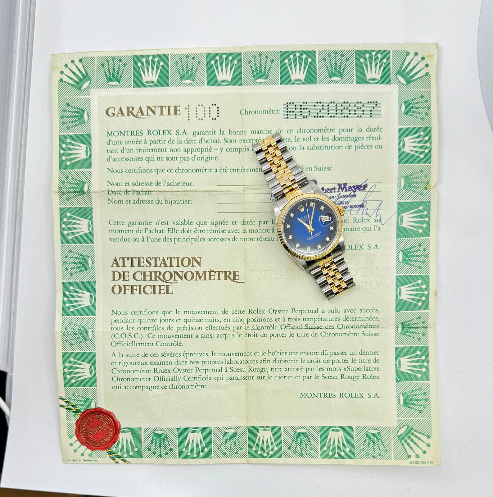 Marca Rolex Modello datejust Referenza 16233 Misura 36mm Vetro zaffiro Quadrante degrade diamond blu nero Carica automatica Materiale acciaio e oro 18ct Anno 1988 Ghiera oro giallo 18ct Bracciale jubilee acc oro 18ct Corredo Garanzia Rolex, no box
