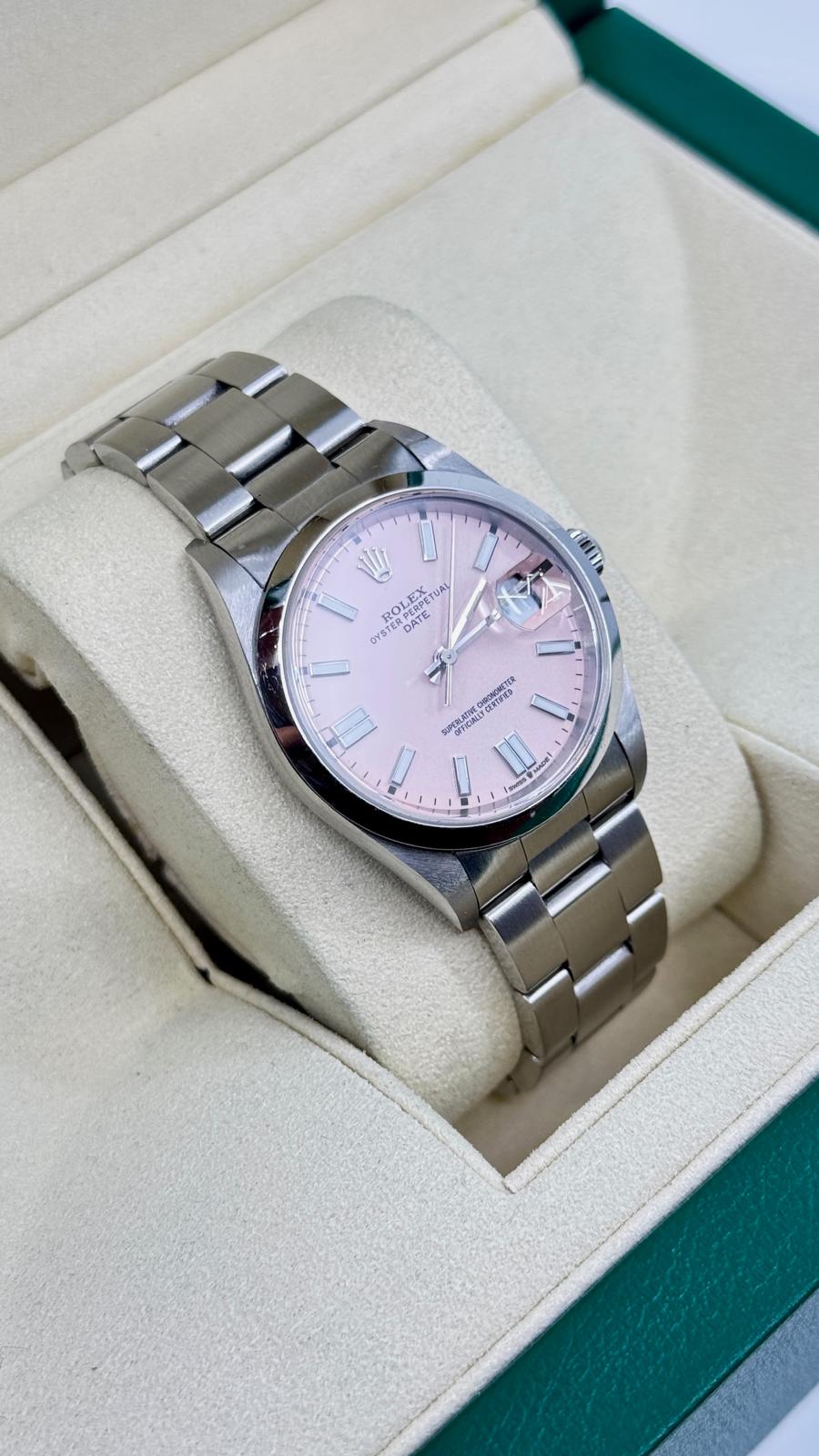 Marca Rolex Modello oyster perpetual date Ref 15200 Anno 1999 Condizione usato Misura 34 Vetro zaffiro Cassa no fori Quadrante aftermarket rosa e bianco originale Cinturino oyster Corredo Garanzia Rolex, no box la scatola utilizzata solo per fotografie non in vendita