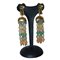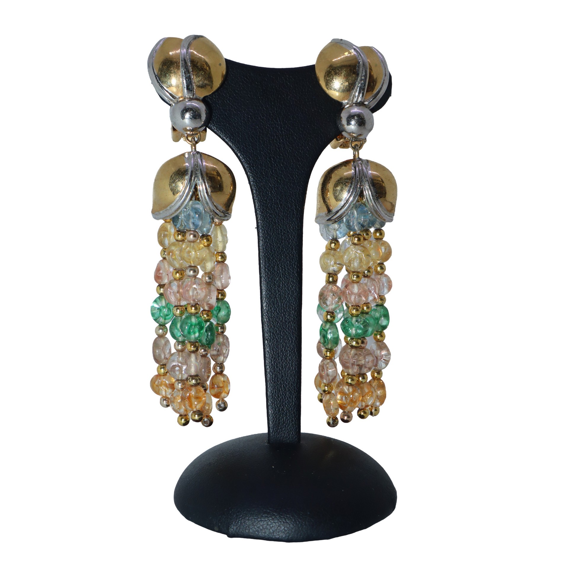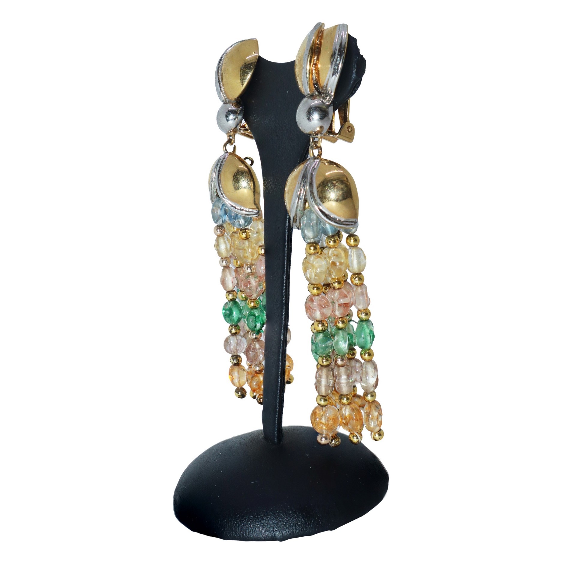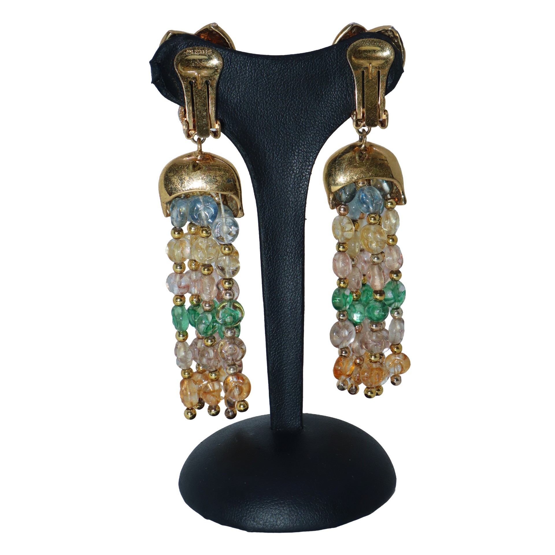 Orecchini pendenti a clip in metallo dorato con 6 fili di pietre colorate h cm 9