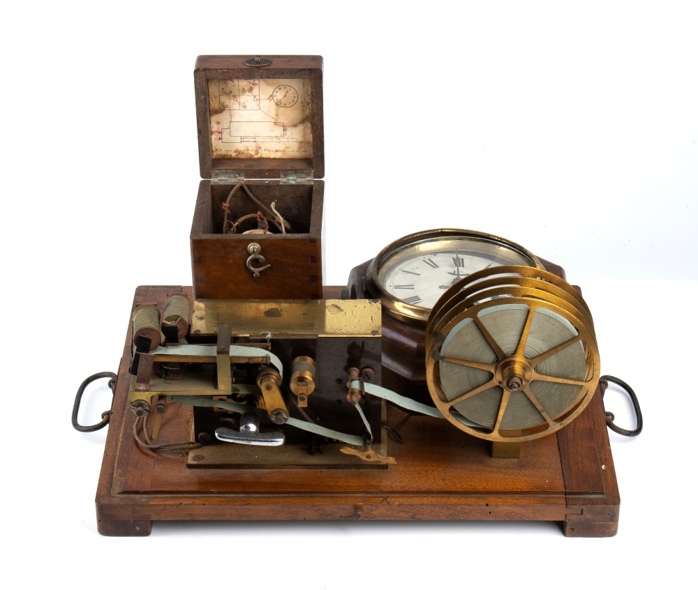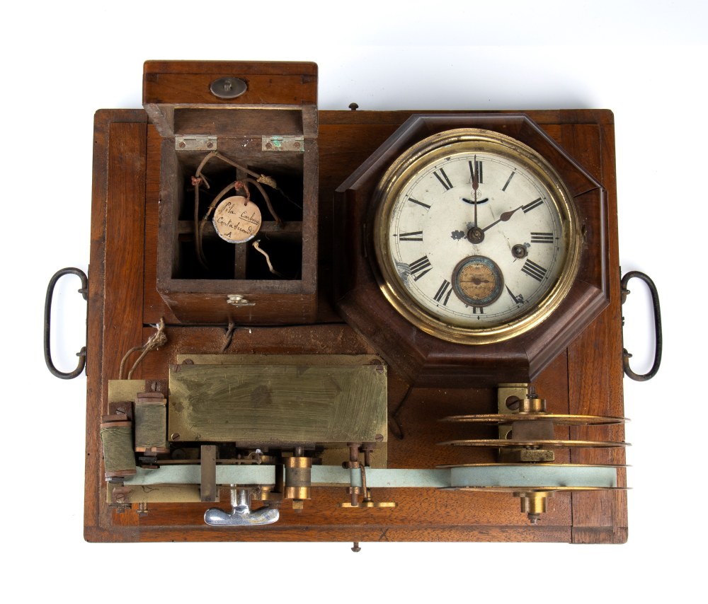 cm 42x35 Composto da una pila a grafite, ricevitore nastro scrivente ed orologio a carica manuale s base in legno. Buone condizioni.