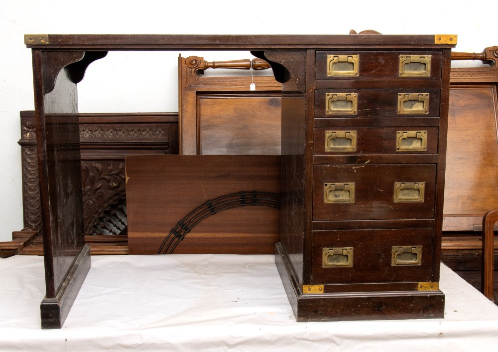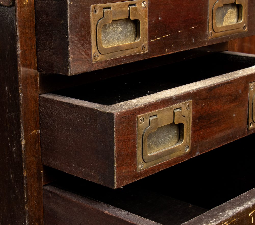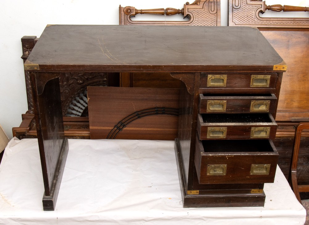 cm 100x50x70 Scrittoio navale in stile marinaro su disegno originale; in mogano marino e ferramenta in ottone, con 5 cassetti laterali. Discrete condizioni.