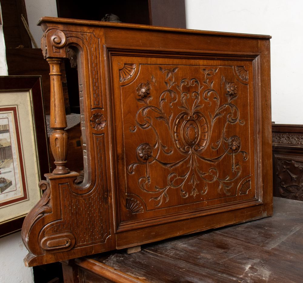 cm 200x80x90 Cuccetta da nave inizi '900 con base a 2 cassetti e laterali in legno impiallacciato scolpito a rilievo, condizioni mediocri.