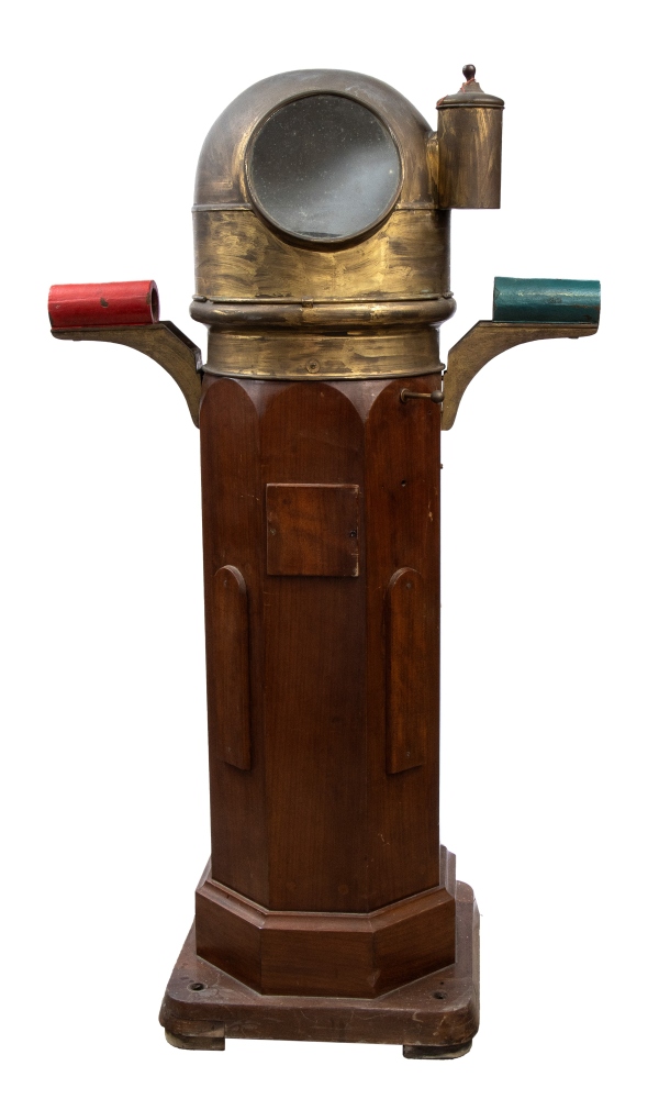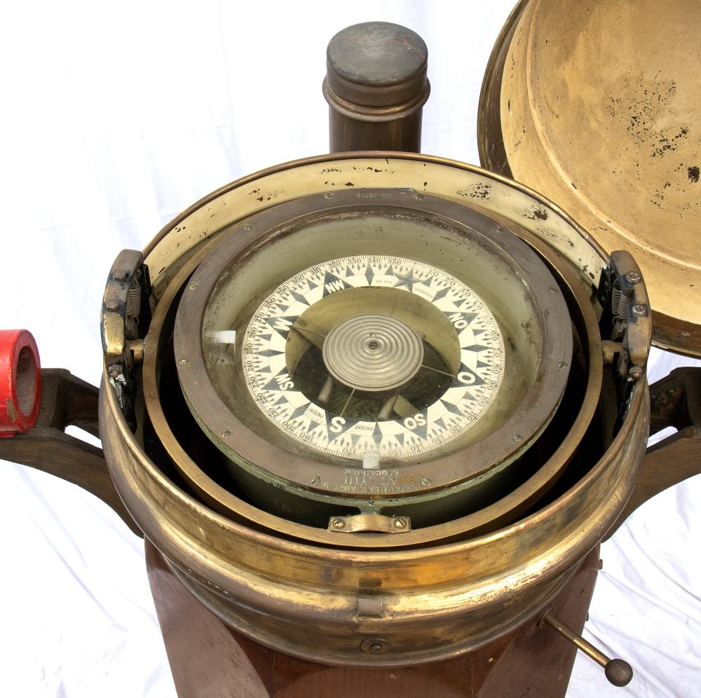 cm 140x48 Chiesuola in legno con cupola in ottone. La bussola è marcata "Instrument Fabrics Ab Lyth Stockholm". Buone condizioni.